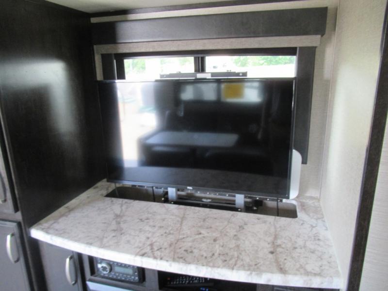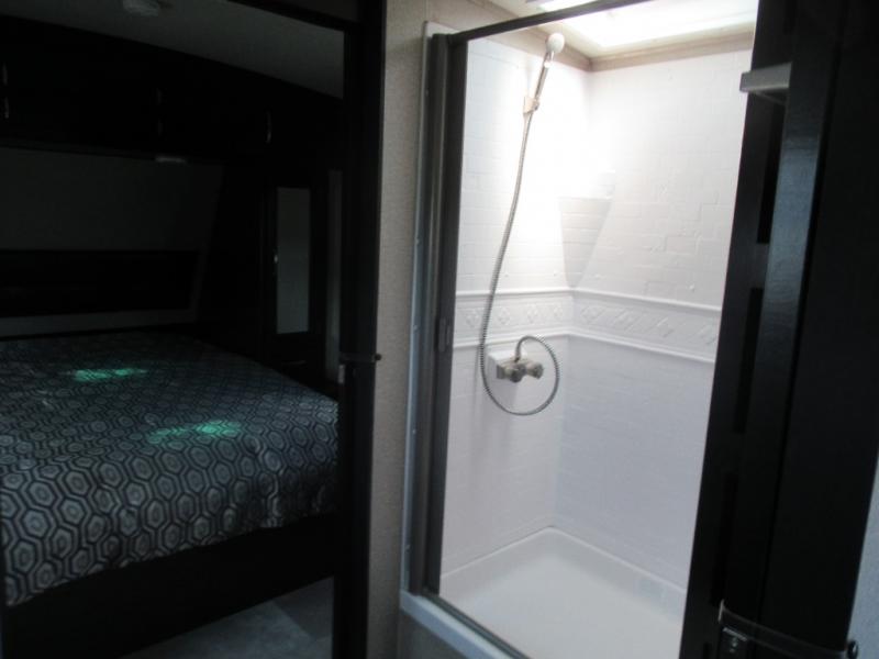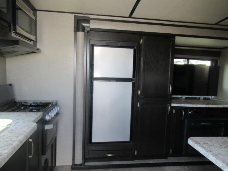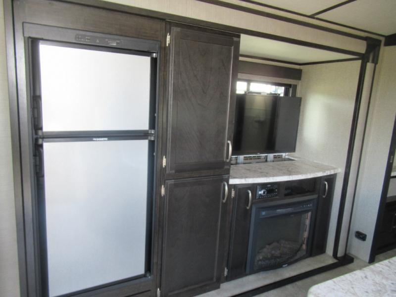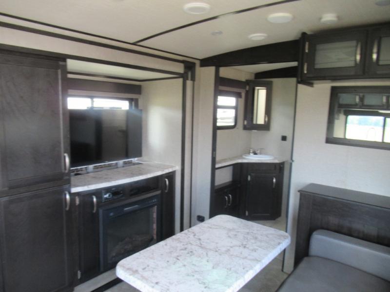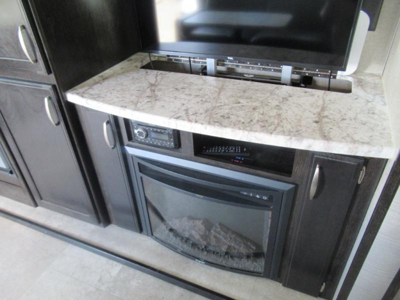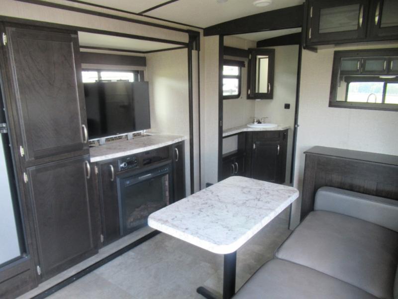 No matter if you choose a state park or your family's ranch, you will enjoy this layout for several reasons. First, the dual entry doors allow quick access from both ends of the trailer. When you are ready to watch a show or movie, the 40" telescoping TV is above the fireplace for a cozy night inside. You can even bring your pets along to enjoy their pet dish drawer under the refrigerator. You will find many more conveniences you don't want to camp without such as full kitchen and bath amenities, and plenty of storage.