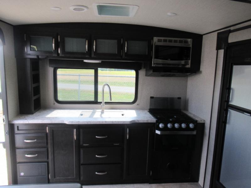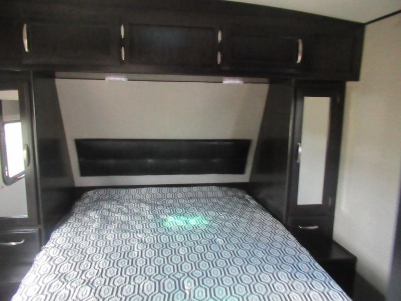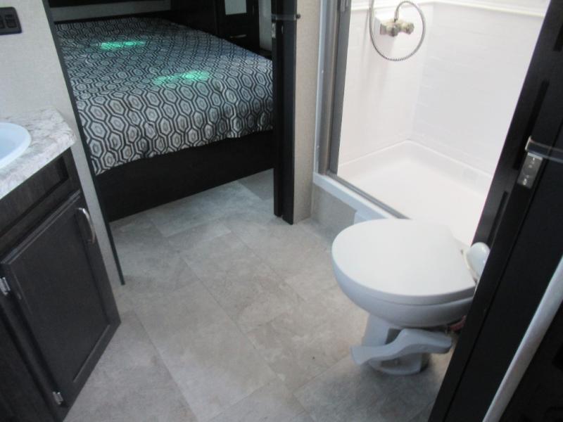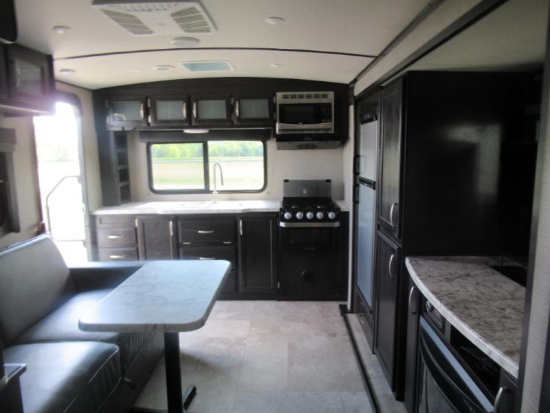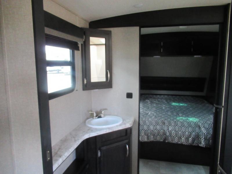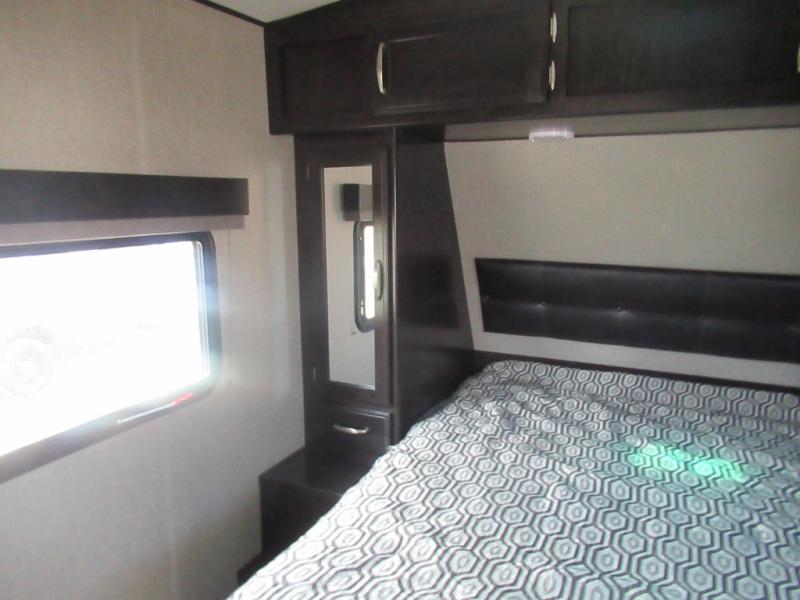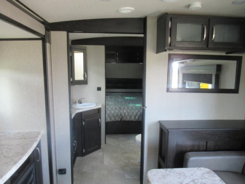No matter if you choose a state park or your family's ranch, you will enjoy this layout for several reasons. First, the dual entry doors allow quick access from both ends of the trailer. When you are ready to watch a show or movie, the 40" telescoping TV is above the fireplace for a cozy night inside. You can even bring your pets along to enjoy their pet dish drawer under the refrigerator. You will find many more conveniences you don't want to camp without such as full kitchen and bath amenities, and plenty of storage.