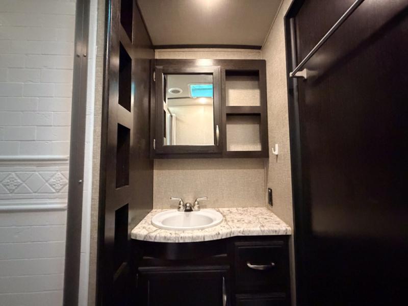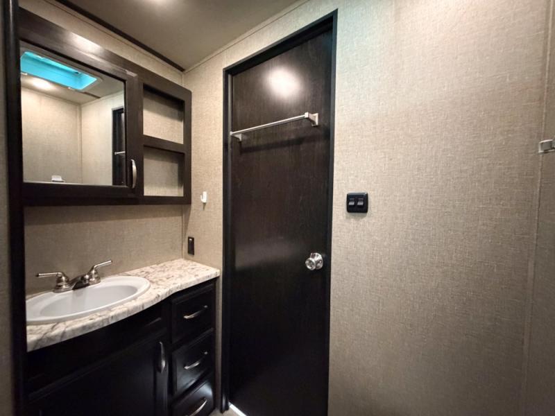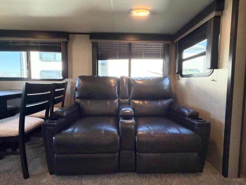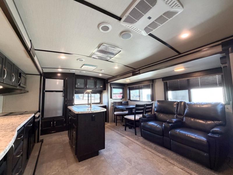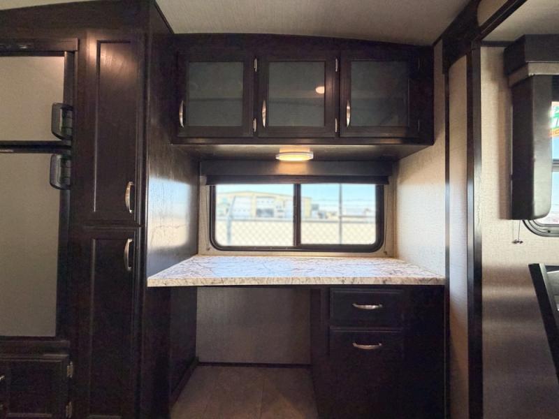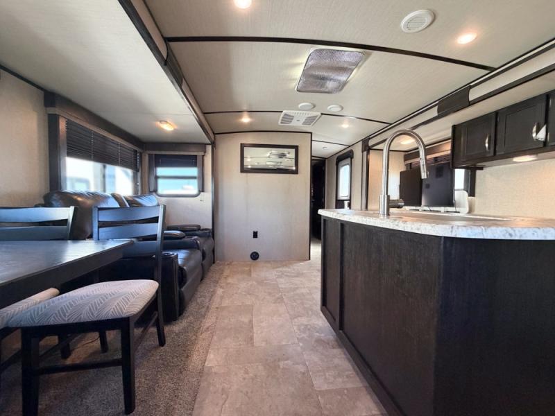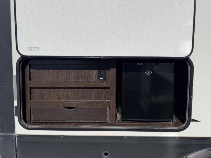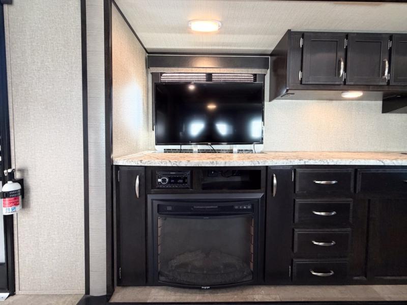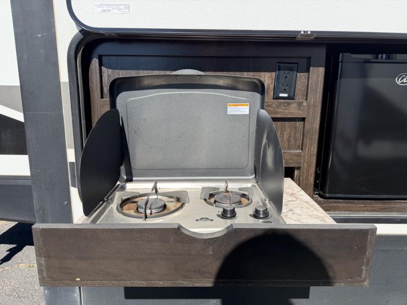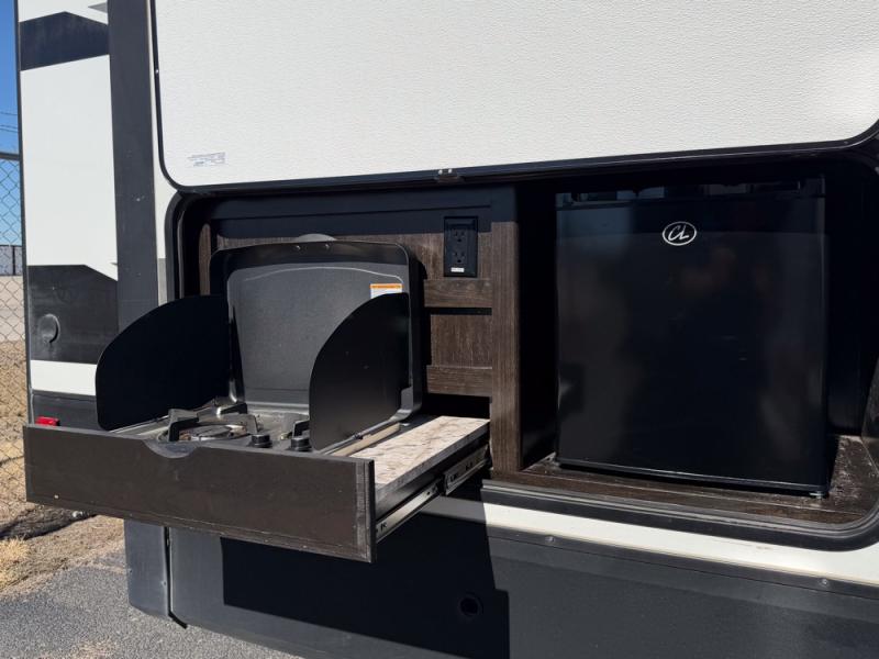 It's time to imagine yourself on a week-long trip with the ability to work in the morning and play in the afternoon. This travel trailer has the perfect layout for a couple that likes to watch TV, cook, and get some work done when needed. There is a desk, kitchen island, and a 40" telescoping TV with fireplace below, plus a pet dish drawer for your best friend. You can even bring the grandkids along with you thanks to the extra sleeping space provided by the furniture. The outside kitchen adds a second location to prepare and make meals while enjoying the great outdoors. Come see why this Imagine can allow you to enjoy the world all while working remotely.