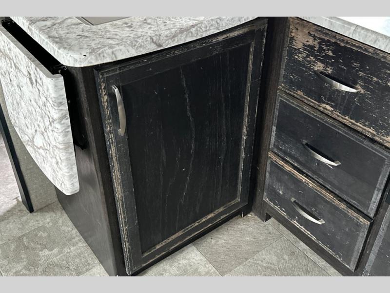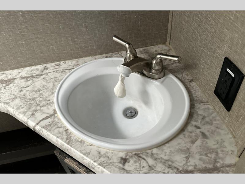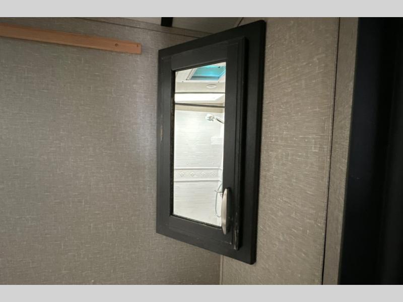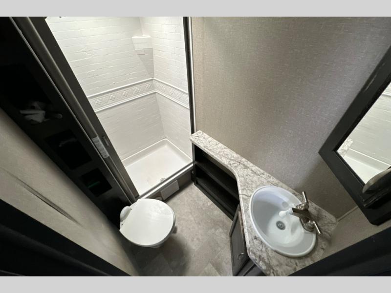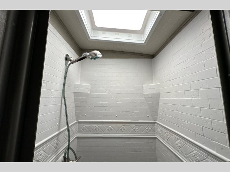 What I liked most: Bunk area area lifts up for additional storage which is very unique. Place for shoes. The bathroom shower surround has a brick molded design look.