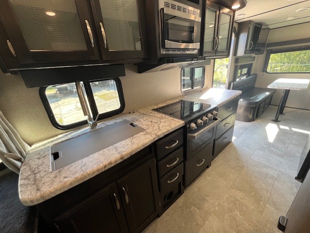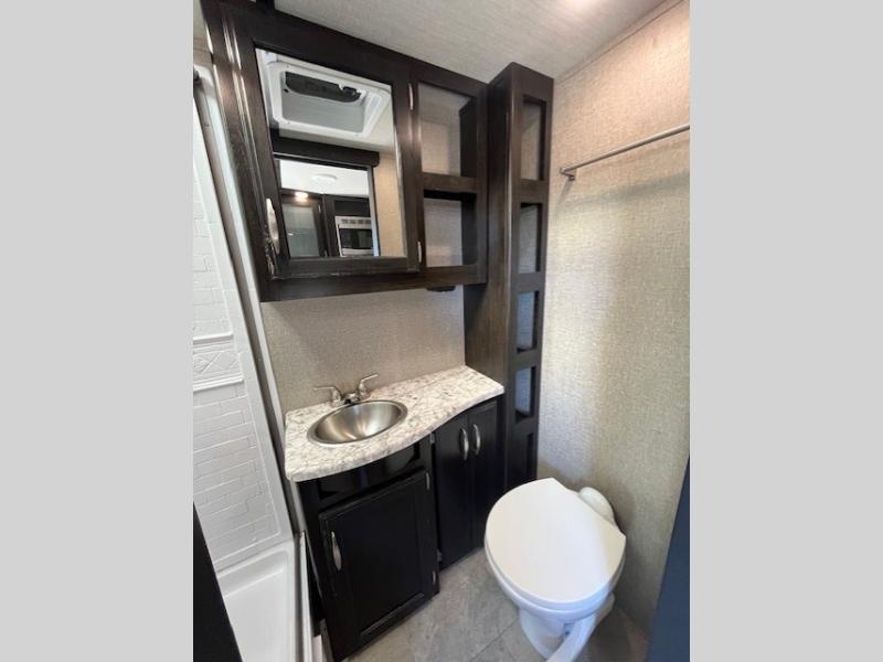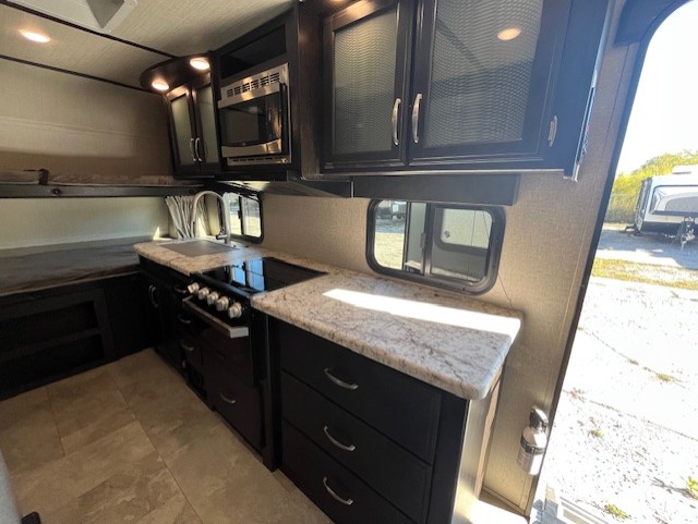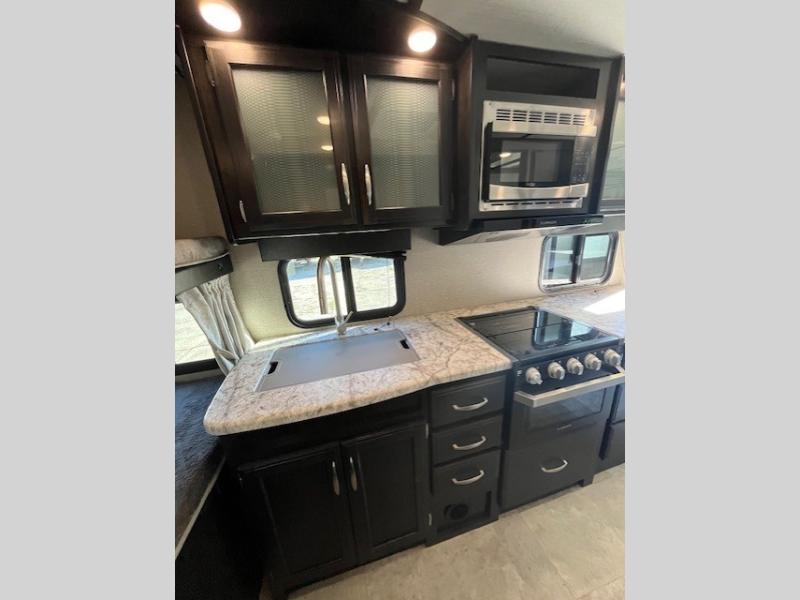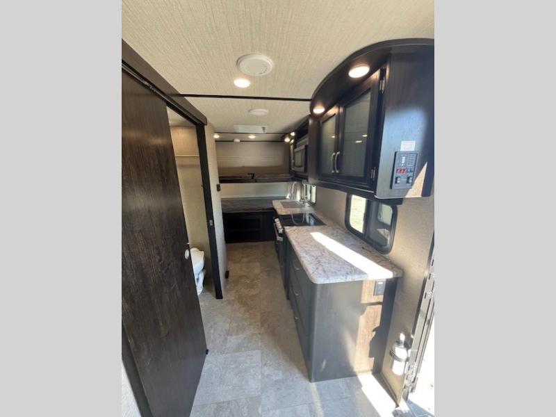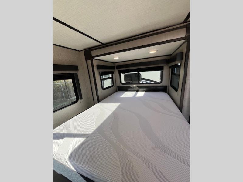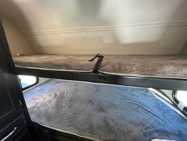 Imagine your next camping experience being comfortable and relaxing. Now imagine the kids sleeping on the front bunk beds while you enjoy a great night's sleep on the slide out queen bed in the rear while watching the 32" LED HDTV. The slide out offers more floor space for the removable table and bench providing seating for four to eat a meal at or play a card game before you head outdoors. The cook can whip up a full dinner with all the kitchen amenities, and the kids can grab snacks from the pantry. There is more living space outside under the awning as well. Take a step inside!