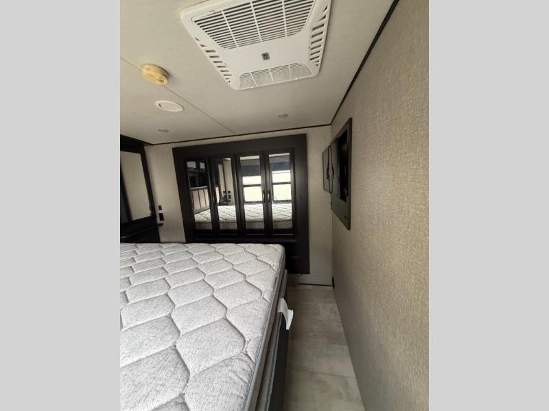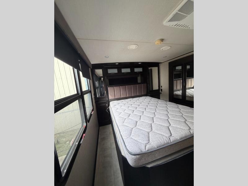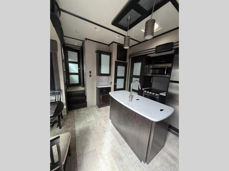 When you are ready for some off-road fun, hitch up this toy hauler fifth wheel to head to your favorite trails! This Momentum 376TH has a unique below floor garage with a bedroom above. After a busy day on the dunes, you can entertain guests in the front living area which includes a telescoping 49" LED TV with fireplace. You will find the separate kitchen area has all the amenities necessary to make and eat meals including a free standing dinette and large pantry. You can even add a washer and dryer in the second pantry if you want to keep your clothes clean the whole trip. You may choose to cook outdoors on the outside kitchen while watching the exterior LED TV. There is much more to see inside and outside this toy hauler!