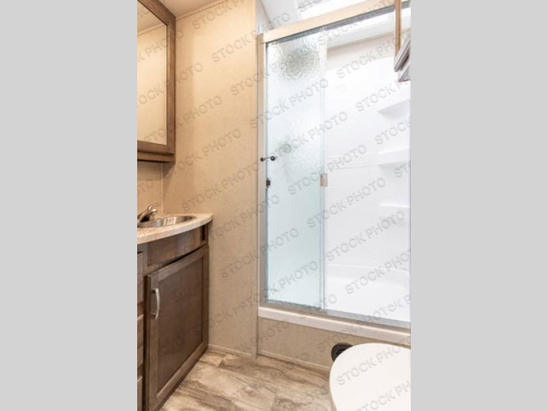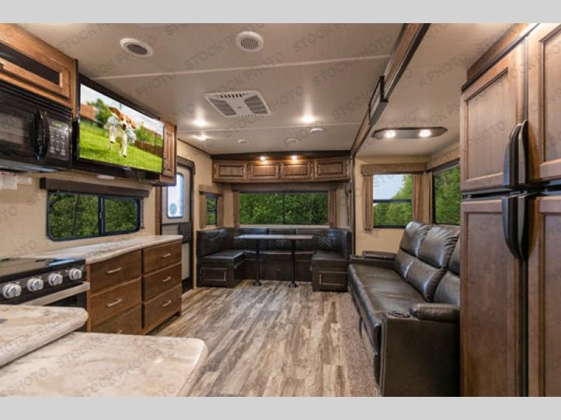 You can expect a great camping weekend or week long trip with this Refection travel trailer in tow. This unit is perfect for any couple seeking an outdoor adventure that is also looking to enjoy a bit of at-home comforts as well. Step inside and notice how the outdoors makes its way inside through the large panoramic windows surrounding the rear U-shaped dinette and above the slide out that contains a theatre seat and your 12 cu. ft. refrigerator and pantry. The 78" theatre seat has room for three so you can invite your camp neighbors over and have plenty of seating to enjoy the 40" LED swing arm TV. At night, a queen pillowtop mattress will be a welcome retreat for a great night's rest. You will find plenty of storage for your clothing and things with bedside shirt closets, a king size wardrobe with storage drawers, and more space for the clothing you hang. The underbed storage is also nice for larger items you wish to keep inside. When you wake each morning the full bath nearby will welcome you with a glimpse of the day ahead through the large shower skylight. And, when you are ready for your next adventure, head out through one of the two entry/exit doors.