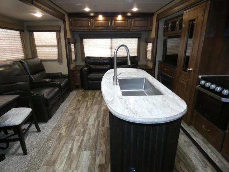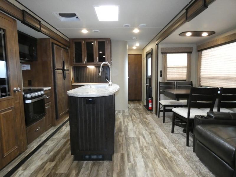 This Reflection 315RLTS travel trailer allows you to enjoy the comforts of home while away exploring the world with your favorite person. You can even invite over a few overnight guests. Just imagine sitting in the rear living area on the furniture provided while visiting with the cook preparing meals at the kitchen island or washing dishes in the large sink. You might even glance over at the 40" TV and fireplace ever once in a while. You will find storage everywhere you look including outside in the unobstructed pass-through compartment.