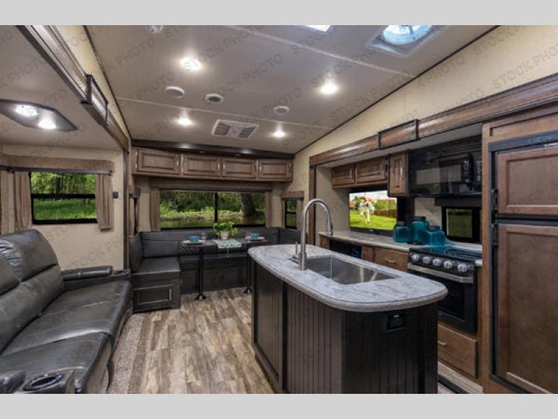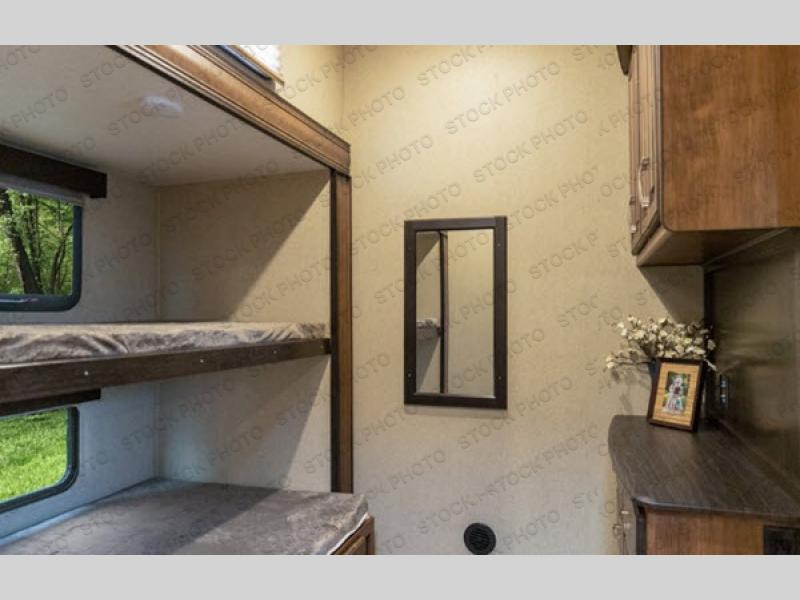 This is the one you have been daydreaming about for years! Just imagine the kids having their own private bunkhouse across from the main entry to come and go as they please. You will enjoy your own oasis in the master bedroom, and the full bathroom is between the two rooms allowing everyone easy access especially at nighttime. The rear dining and living area offers a U-shaped dinette with a large window to enjoy the view of the great outdoors while eating a meal together. The large theatre seating includes cupholders and a fun way to watch the 40" TV. You will find plenty of storage throughout. And the chef will love the kitchen layout with a center island, large sink and plenty of storage in the pantry. Load up today!