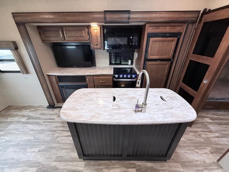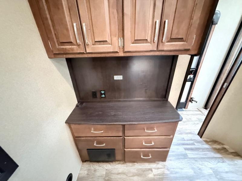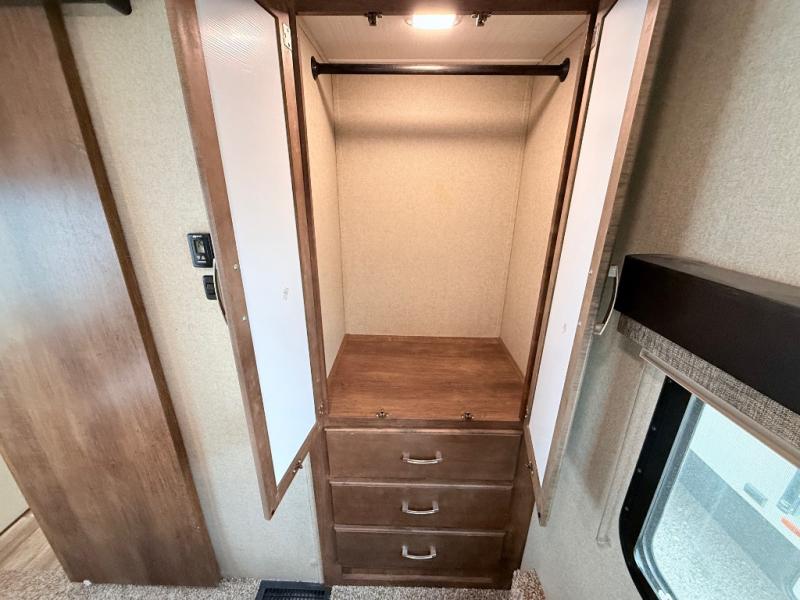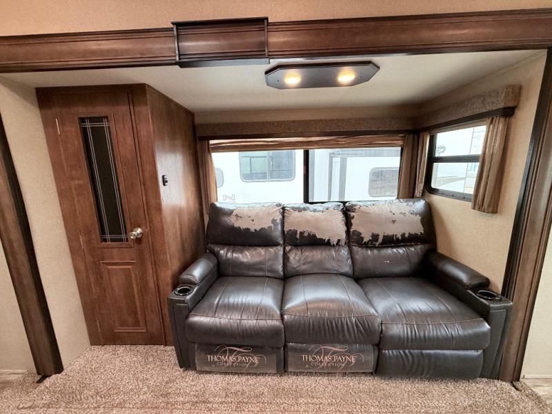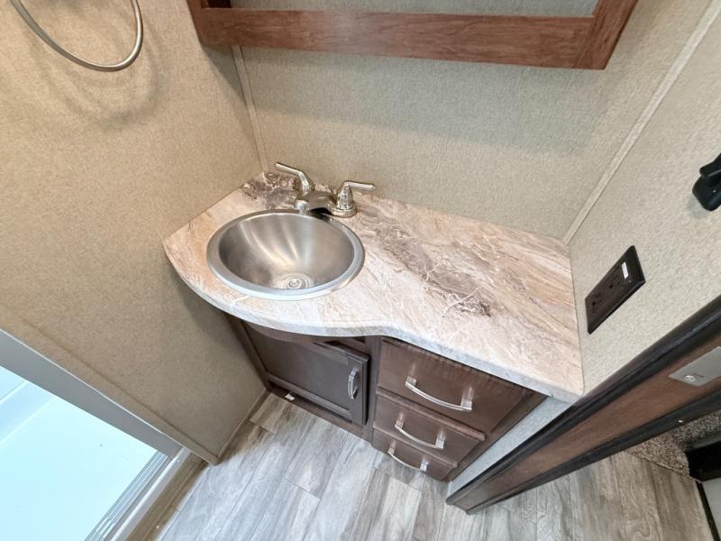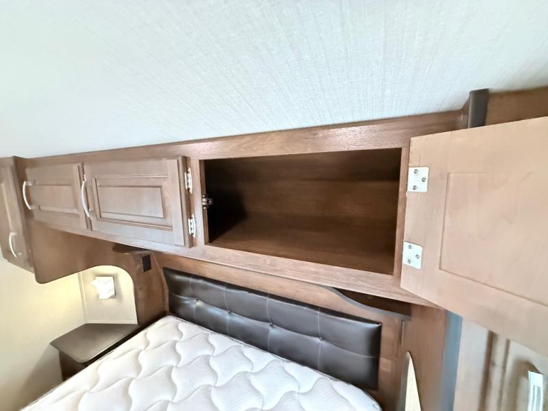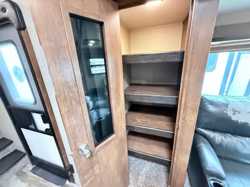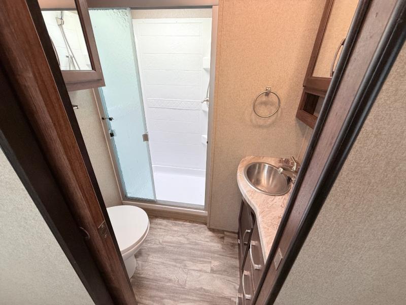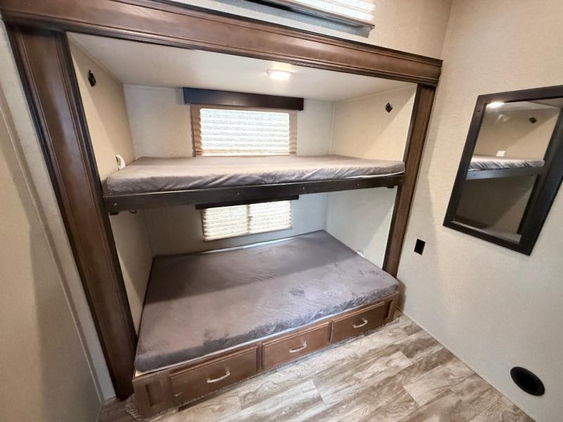 This is the one you have been daydreaming about for years! Just imagine the kids having their own private bunkhouse across from the main entry to come and go as they please. You will enjoy your own oasis in the master bedroom, and the full bathroom is between the two rooms allowing everyone easy access especially at nighttime. The rear dining and living area offers a U-shaped dinette with a large window to enjoy the view of the great outdoors while eating a meal together. The large theatre seating includes cupholders and a fun way to watch the 40" TV. You will find plenty of storage throughout. And the chef will love the kitchen layout with a center island, large sink and plenty of storage in the pantry. Load up today!