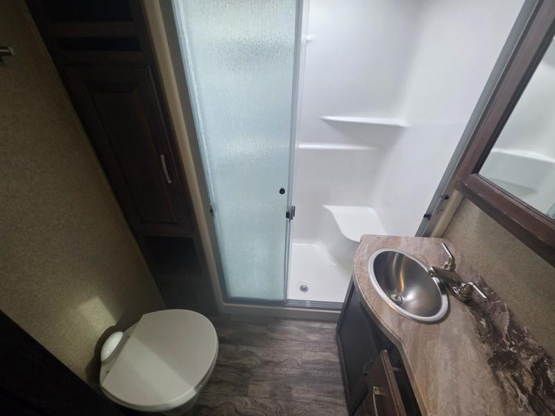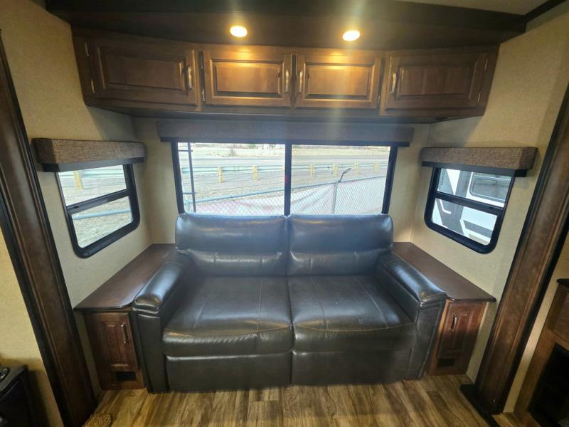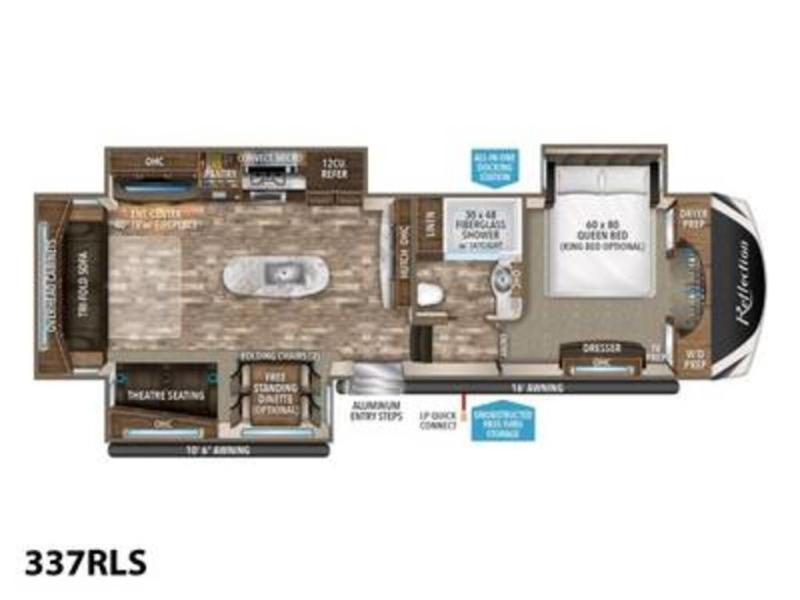 Envision this Reflection 337RLS fifth wheel setup at your favorite RV park for a month. Now picture yourself talking to your friends while relaxing under one of the two awnings while you decide to unload the outdoor gear from the unobstructed pass-through compartment. Your spouse is probably inside cleaning up before lunch time or relaxing on the theater seating. The gourmet kitchen allows you to make just about any meal you desire, and the full bathroom is a "must have". You will find plenty of seating for everyone to watch the 40" TV, and the tri-fold sofa bed allows you to invite overnight guests when you like. Take a look today!