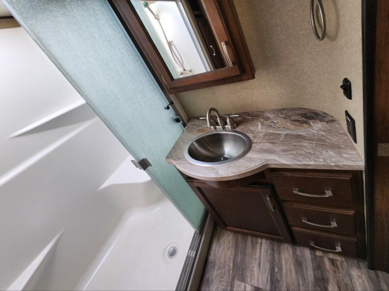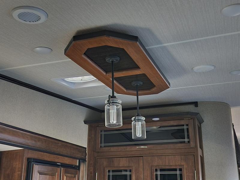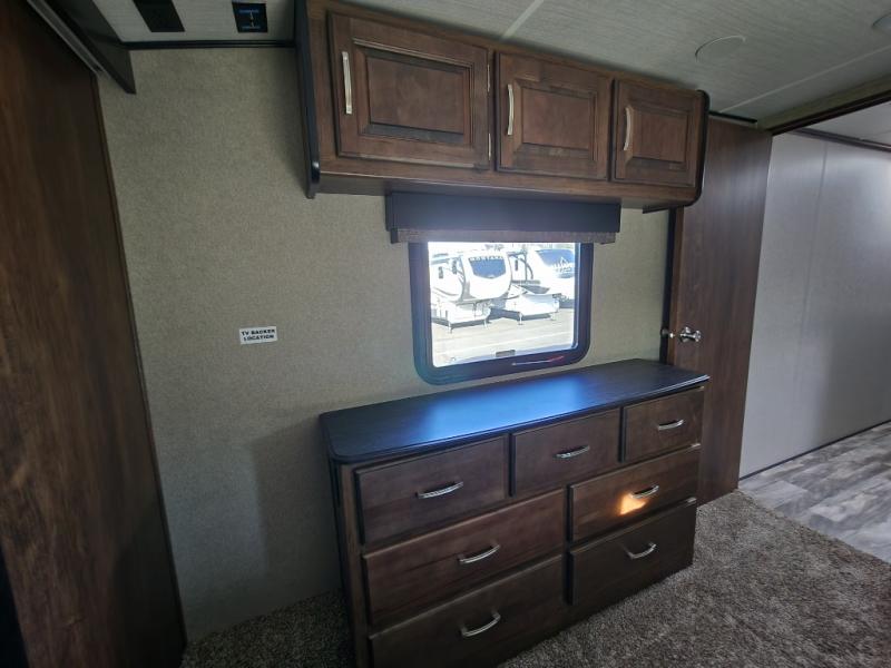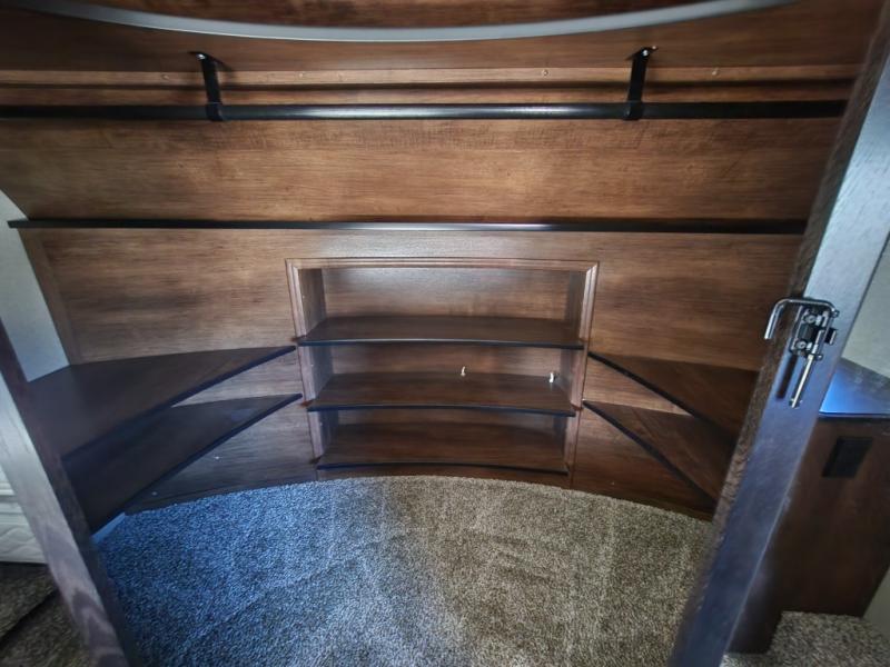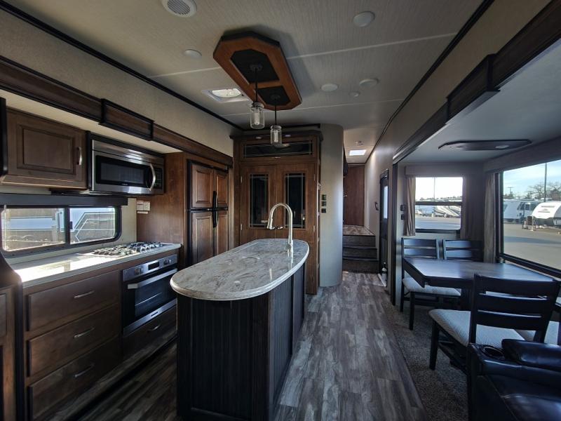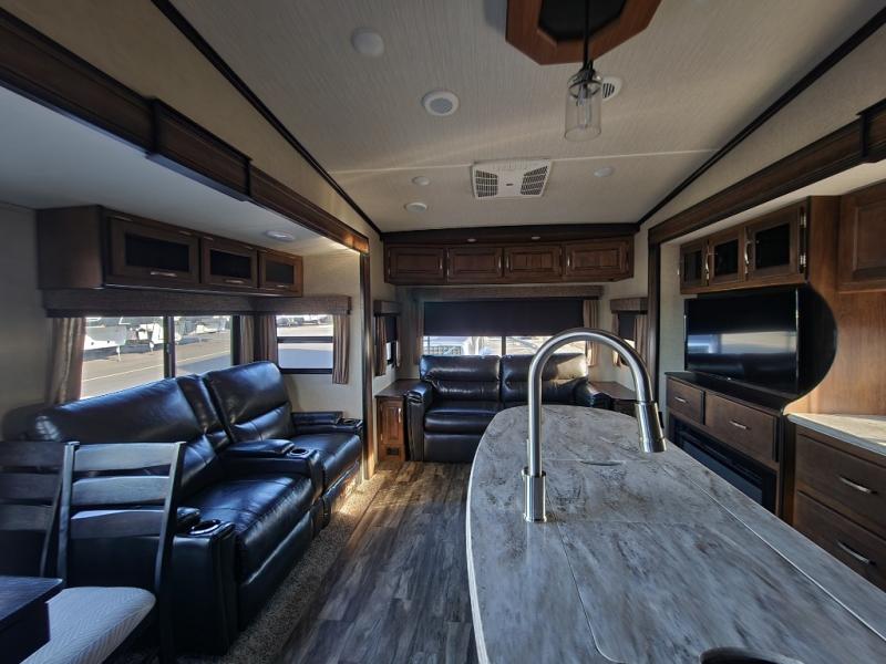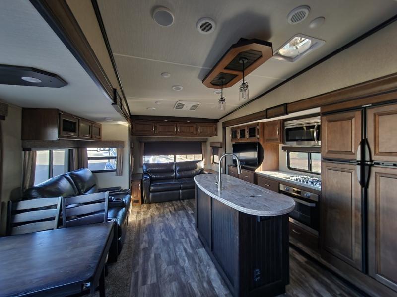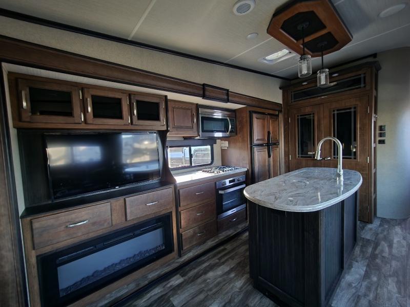 Have you been searching for a fifth wheel that offers a master suite plus an extra room to be used as an office, second living area or even a bedroom? Then start imagining how you will use all of the space in this Reflection 367BHS. The centrally located extra room includes a sofa and a desk, plus a loft above for more sleeping space. The main living area and kitchen offer plenty of seating, a large pantry, and all the appliances to make your favorite meals. There is even extra sleeping space on the tri-fold sofa bed next to the 40" TV and fireplace. You will be able to entertain as well as relax in this area or in the extra room. Your search is over, this is the model for you!