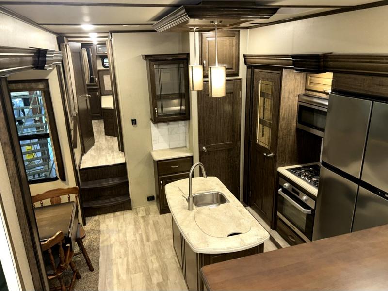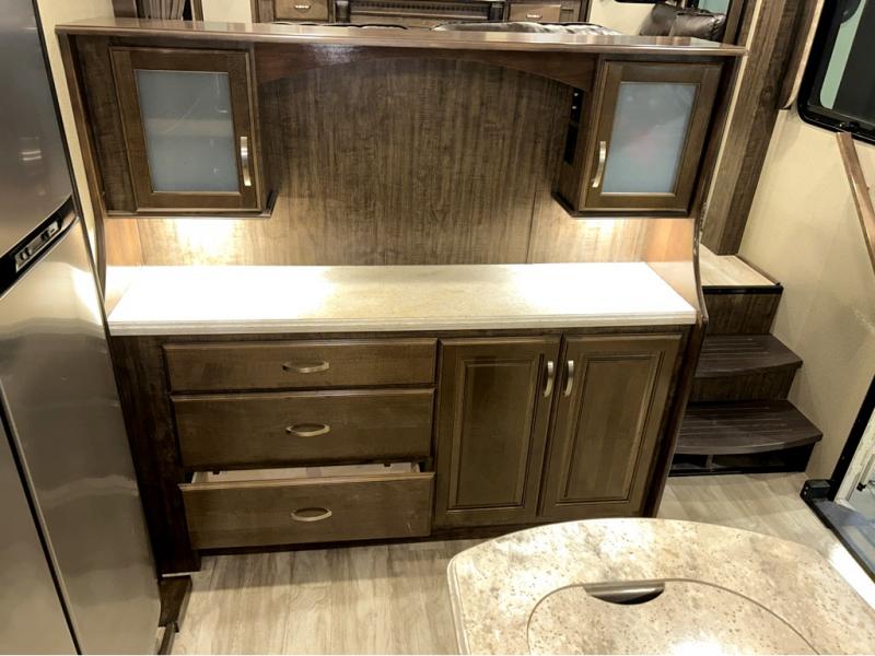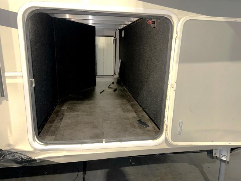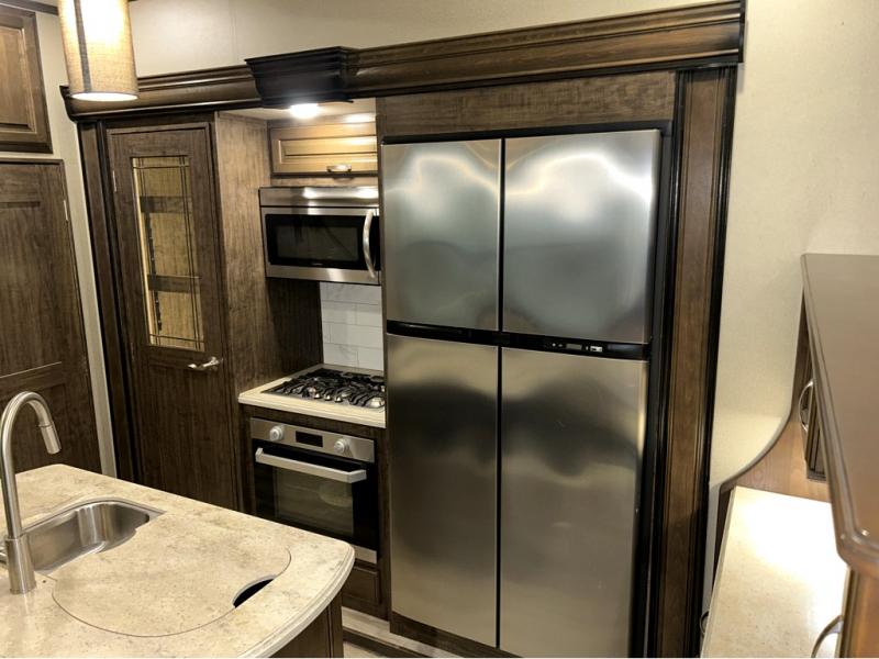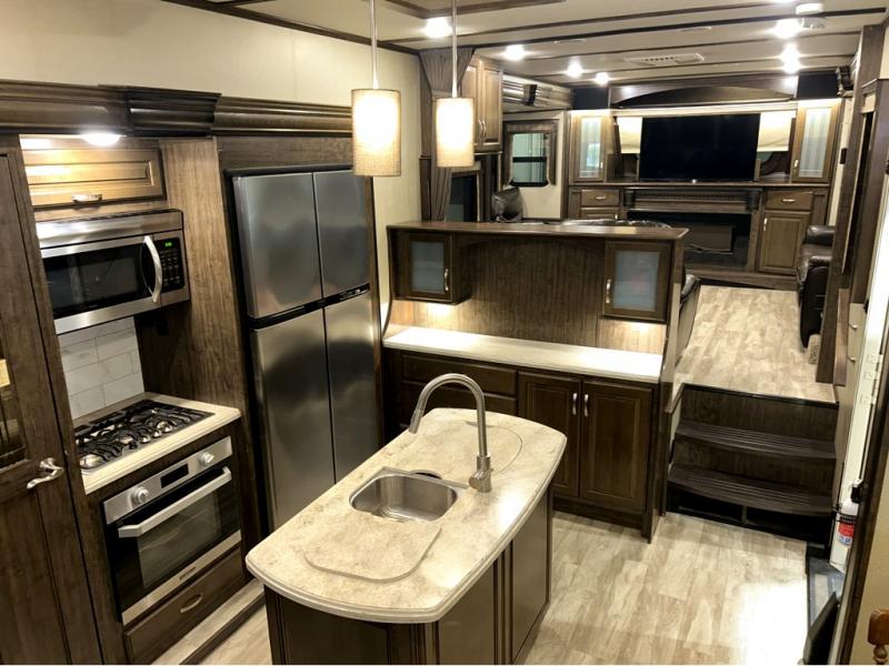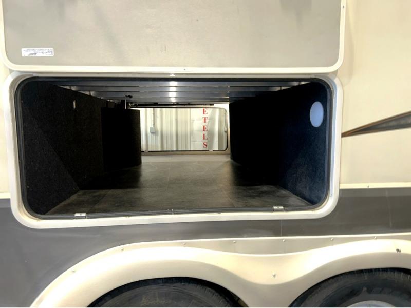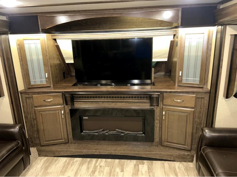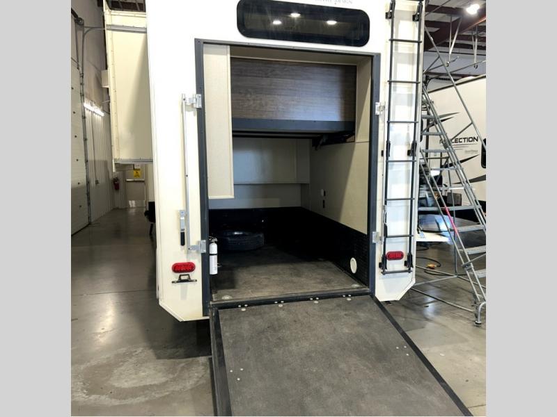 Dreaming about all the places you can take your off-road toy with you as well as your own bedding, living and kitchen area? This toy hauler fifth wheel includes a unique below floor garage underneath the rear bedroom. Once the bed is lifted the garage's height extends to 77" from 65" tall. While your toy is securely stored, you can sleep in comfort and watch TV just before bedtime. You can choose to cook inside on the professional grade stainless steel cooktop after grabbing the ingredients from the stainless steel 18 cu. ft. four door refrigerator, or outdoors on the outside kitchen while watching TV. The front living area offers plenty of seating, a fireplace, and a TV for those inside camping days. So load up your toy and all your gear to hit the dunes, mountains, or countryside.