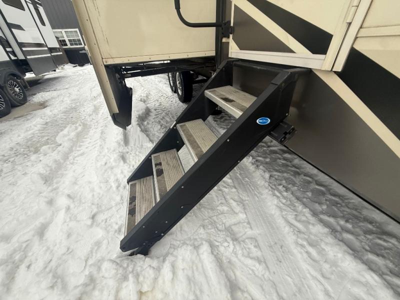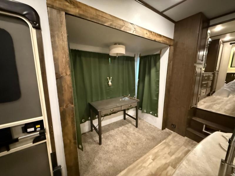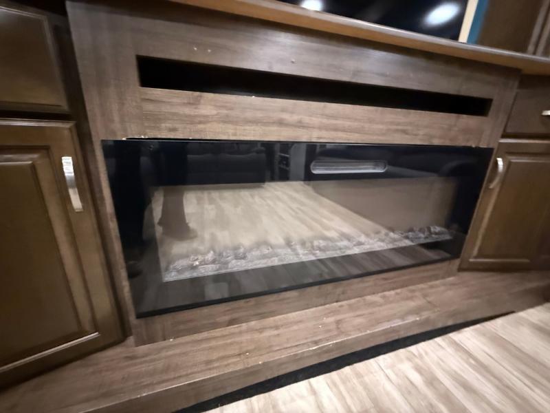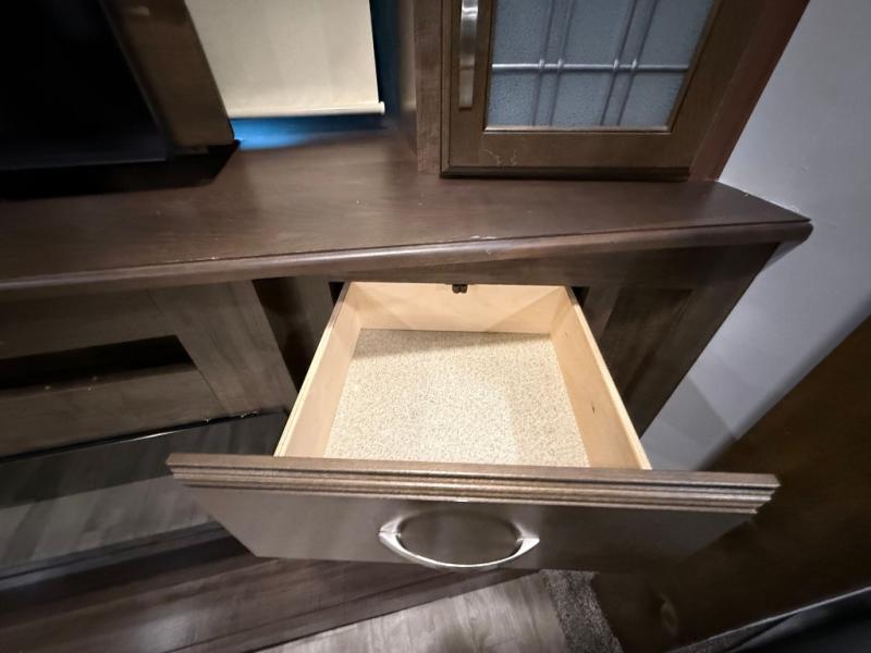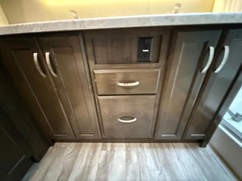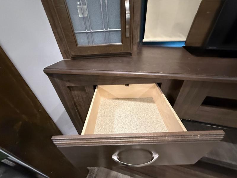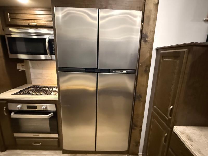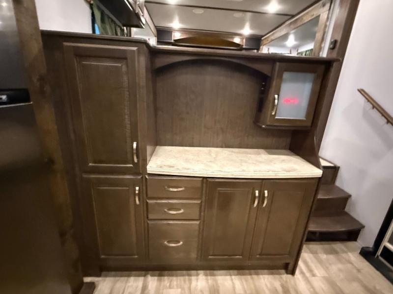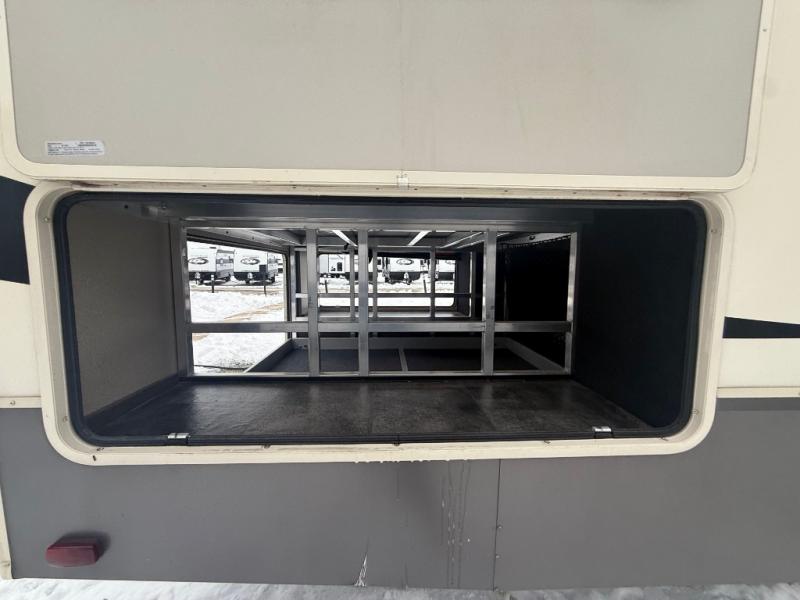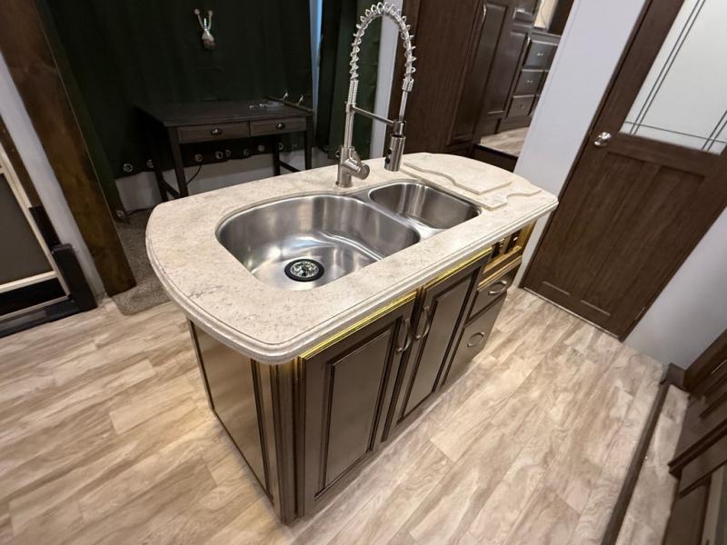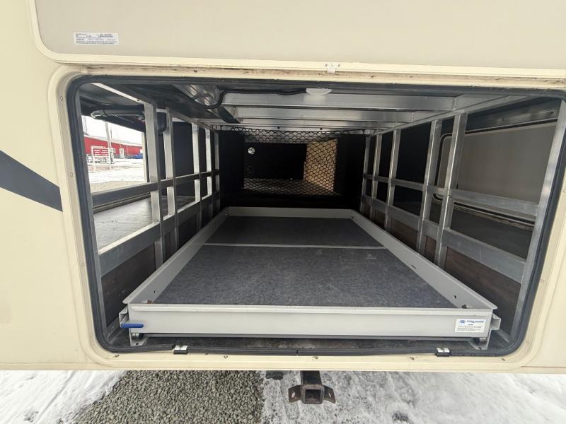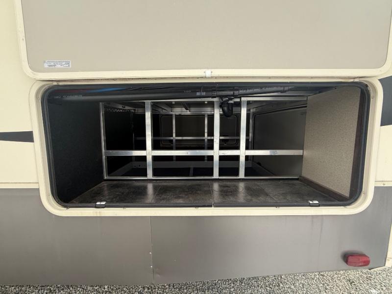 If you have been wanting to make the move to full-time RVing, imagine enough walking around space with five slide outs, extra sleeping accommodations for the grandkids in the front separate living area, and plenty of storage for all your things. You will find a dream kitchen for the cook in the family, plus the free standing dinette offers a cozy place to eat meals. The walk-through bedroom features two space savings sliding doors, and the rear master bathroom offers dual sinks, one for you and one for your spouse. You might even decide to add a few options such as a washer and dryer and/or a king size bed. Outside, there is a pass-through compartment, and rear storage with a sliding tray making getting to your gear easy. Take a look, you will be happy you did!
