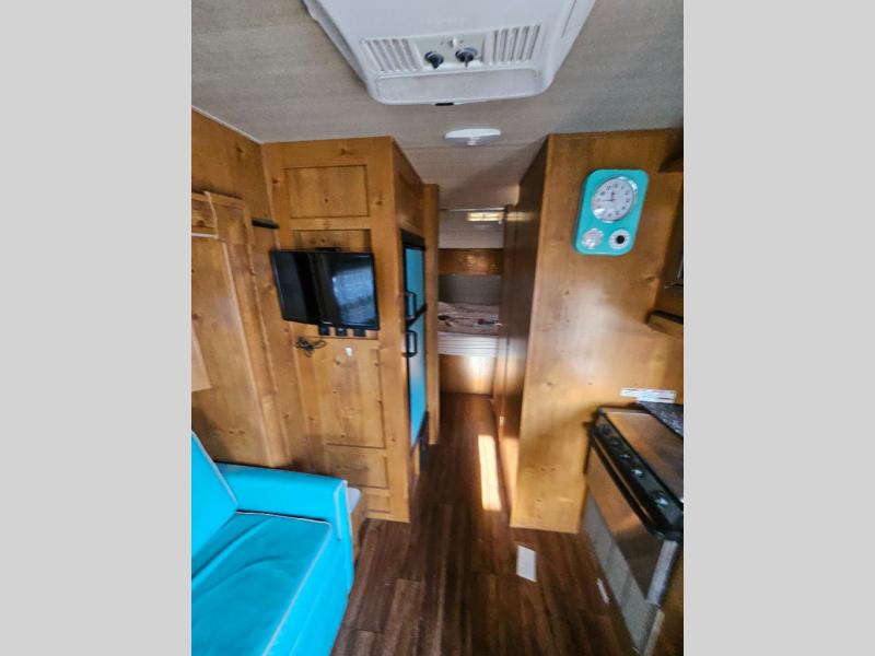 You are going to love the nostalgic feel of this Vintage Cruiser when you step inside and see the retro-style upholstery on the dinette and sofa slide out, as well as on accent pieces throughout . But, don't let the feel of yesteryear throw you as this unit is filled with plenty of modern conveniences like an overhead microwave oven in the kitchen, multiple USB charging ports both inside and out, plus energy efficient LED lighting to help keep the interior bright and cheerful, and the exterior lit well at night. With a slide out sofa, this Vintage Cruiser provides a spacious interior. It is also the largest in the line-up of models as well. Outside, you will find abundant storage with a front pass-through compartment and rear storage on either side for all of your outdoor camping gear.