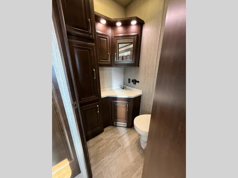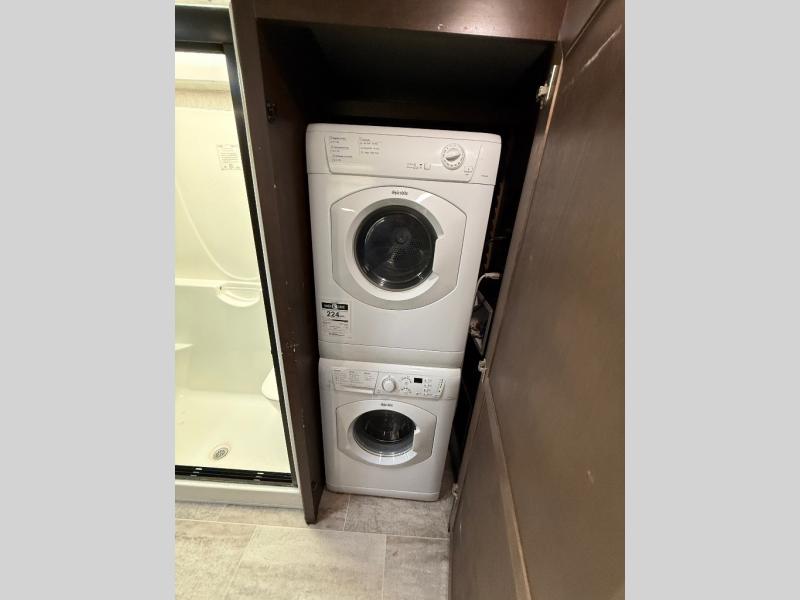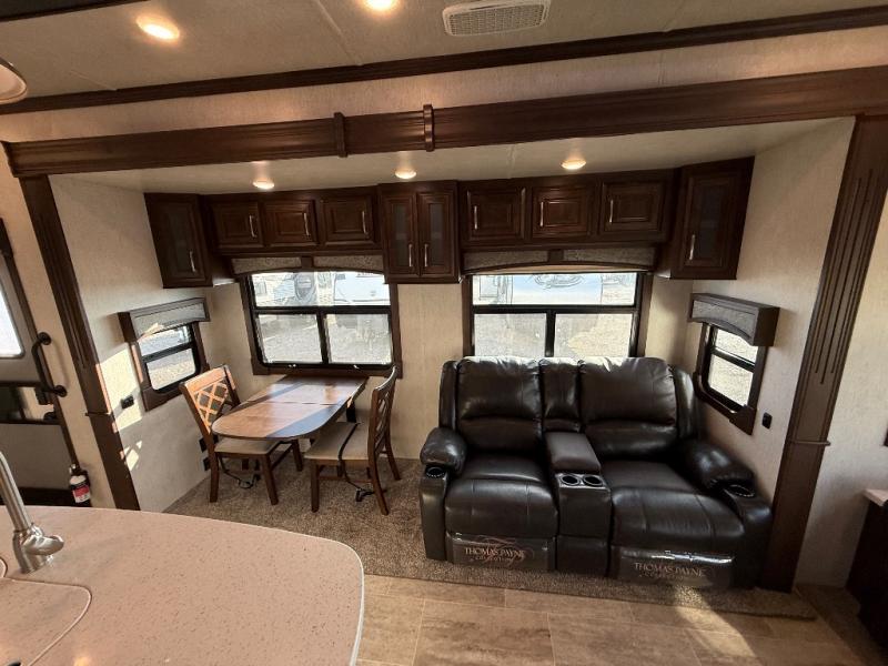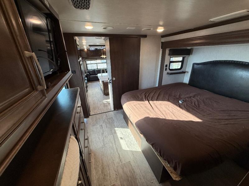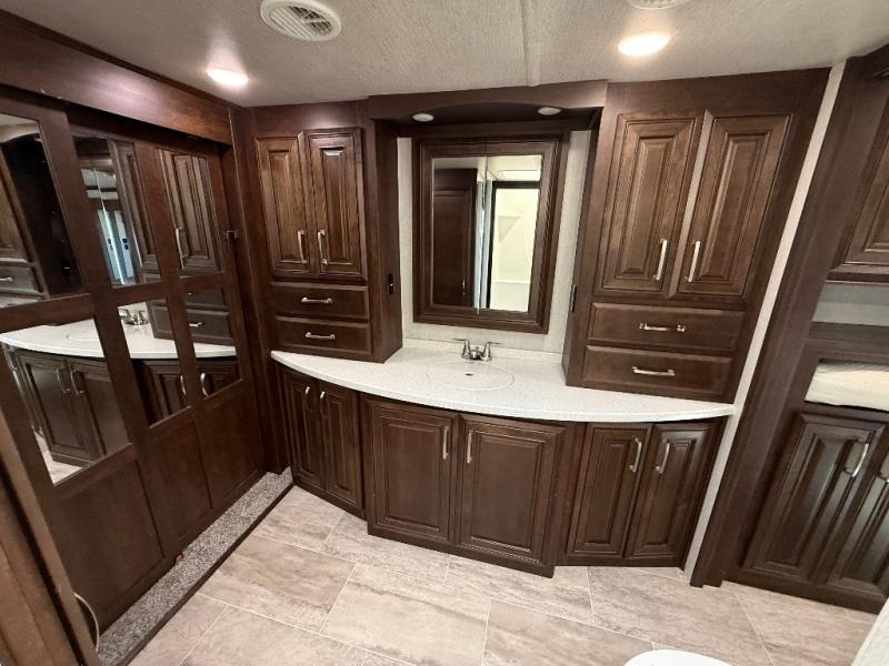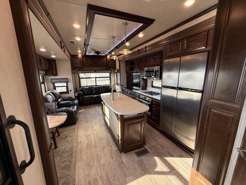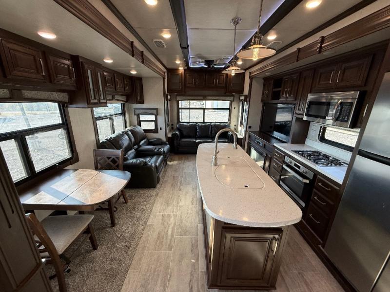 Just imagine being a full-timer with the ability to move to new places any time you like. This fifth wheel offers a spacious front full bathroom with a large vanity and linen storage, plus a full wall wardrobe. There is a half bath for your guests and those quick trips when relaxing in the main living area. You will love the functionally of the kitchen island including the design. Your spouse can relax in the power theater seats while watching the 55" LED HDTV or telecommute from the legless dinette with chairs. You will find plenty of storage throughout the inside, and the exterior will not disappoint neither. Load up and start the full-timer RV experience, you will be hooked!