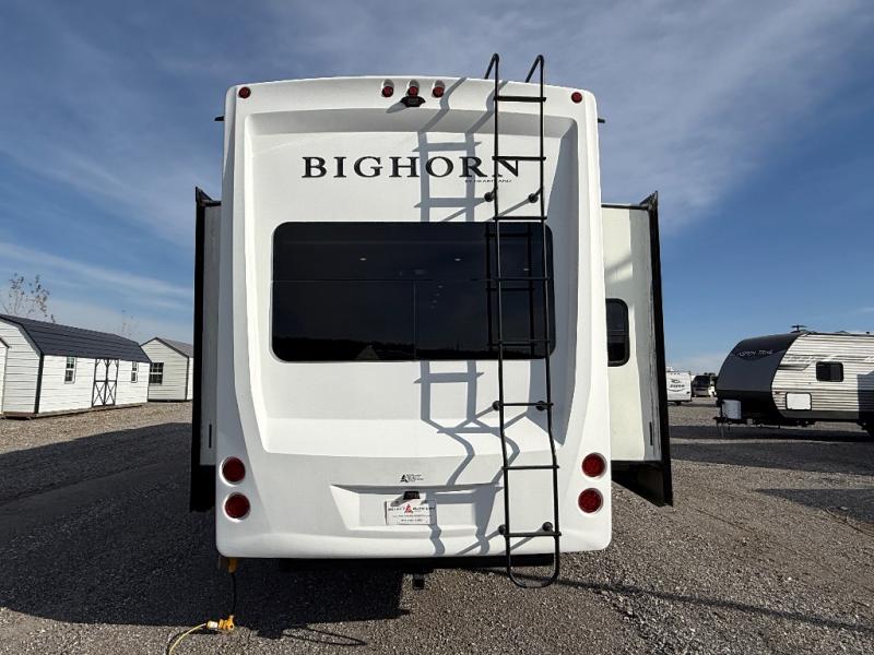 Each Bighorn fifth wheel will give you luxury and affordable features. The exterior includes the largest amount of storage with 140 cu. ft. for all of your gear, a Universal Docking Center, an 88 degree turning radius front cap design, hydraulic landing gear, and Mor/Ryde suspension. You will also find a heated and enclosed underbelly, tanks and gate valves to allow you to easily camp in all types of weather. Scenic views are available through the huge panoramic rear bay window and the windows around the dinette. More inside features include hand crafted cabinets including decor glass on all upper cabinets, LED lit crown molding, and the One Control system allowing users to remotely control and monitor many RV systems from a smartphone or tablet. Choose your favorite model and raise your status!