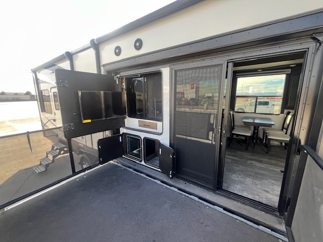 The Cyclone toy hauler fifth wheels by Heartland RV are not your ordinary toy hauler. These models have beautiful cabinets and plenty of comforts throughout such as high quality residential furniture, a 55” LCD HDTV flat screen TV, cable TV and satellite hook-ups, plus a separate DVD/CD/MP3 Bluetooth stereo for the garage and exterior. Along the exterior there are stunning graphics and you will enjoy the view out of the large bedroom picture windows. The two side awnings with LED lights provide plenty of shade during the day, and at night you can grab a snack, your camp chair, and enjoy visiting outdoors just a bit longer. The ultra-light ramp door allows you to easily load your off road toys. In the garage you will also find an electric rear screen, decorative chair rail, plus built-in overhead cabinets with an entertainment center and more! You may even want to add the S5 Package which includes a 2nd fuel cell, 40" garage TV, solid surface counter top in the bedroom, central vacuum, 32" bedroom TV, and upgraded furniture with USB ports and built-in tables.