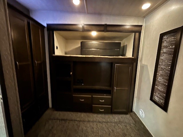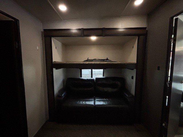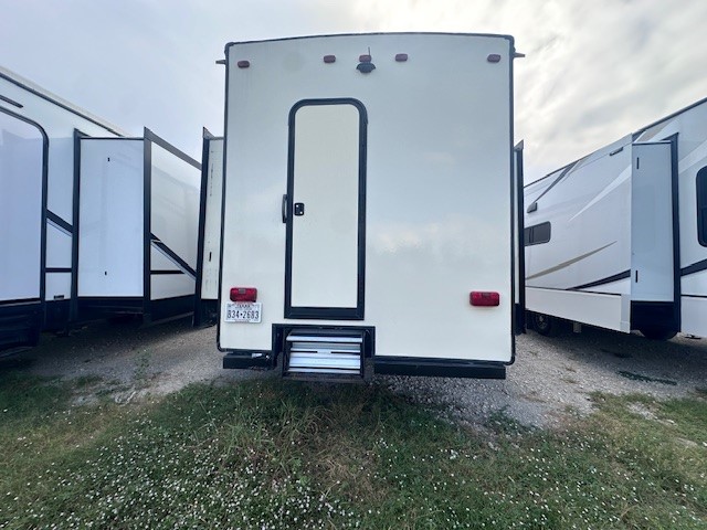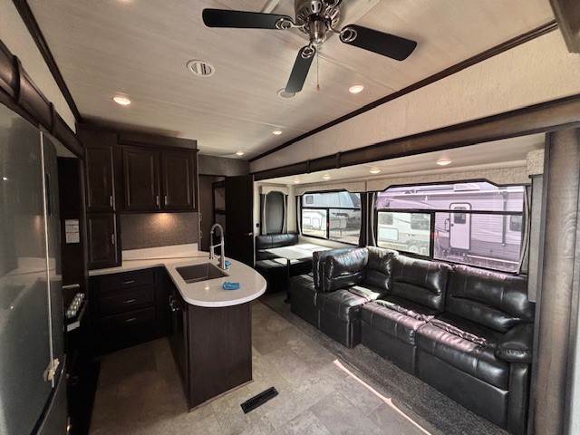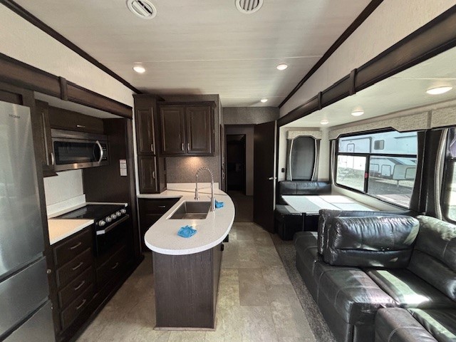 For extravagance beyond your imagination, you need this Elkridge fifth wheel. This unit is the perfect companion for those who enjoy traveling the countryside with family and friends because of the private bunkhouse that contains its own full bathroom and rear entry into the trailer, as well as the front private bedroom with its king bed slide and walk-in closet. This entire unit has plenty of space for living and sleeping because of the five slides that have been installed throughout the interior, and the breakfast bar will be your favorite place to spend your mornings sipping a cup of hot coffee and eating a plate of scrambled eggs.