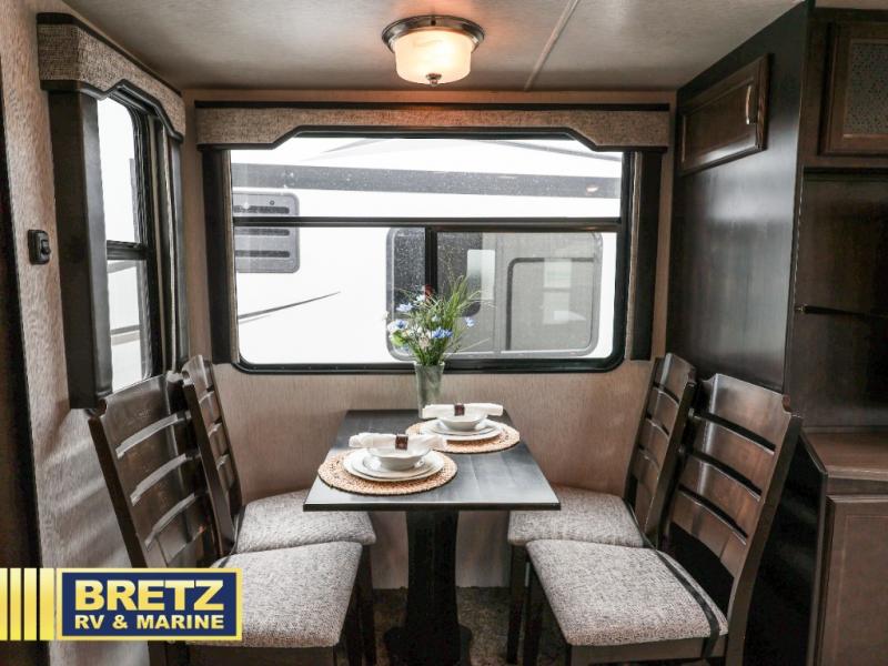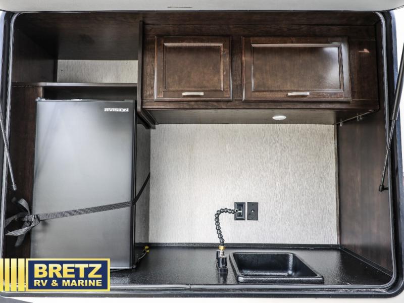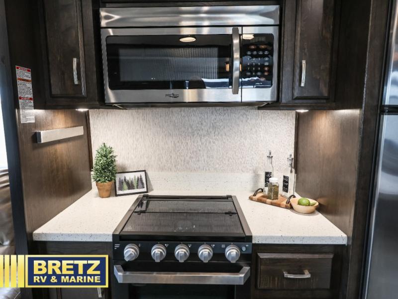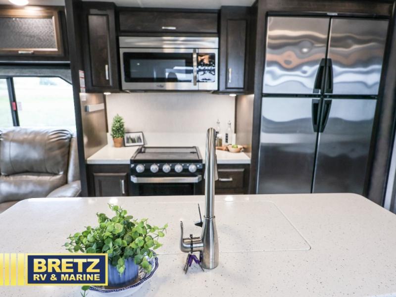 Whether you enjoy lounging by the lakeside or hiking in the forest, this Elkridge fifth wheel is the perfect addition to each of your upcoming adventures. With its impressive amount of interior space that is made possible because of four slides and its many different sleeping accommodations, like the loft and two private bedrooms, this trailer is a gem to have no matter where you travel. The interior kitchen is packed out with loads of amenities to make your meal preparations run smoothly, like the 13 cubic foot refrigerator and three-burner range top, and the outdoor kitchen will come in handy when you want a cool beverage after playing outside on a hot afternoon.