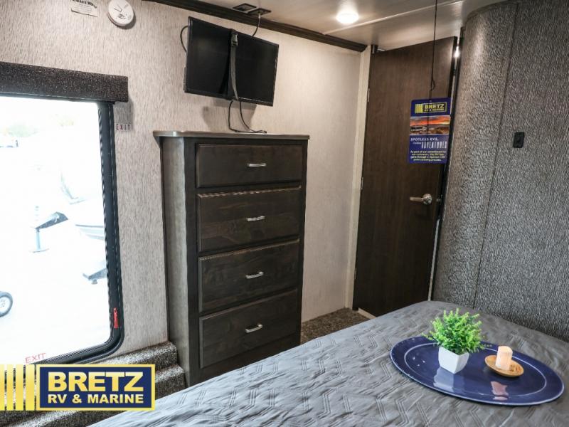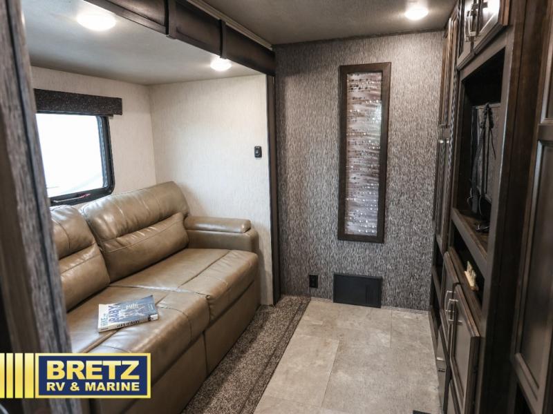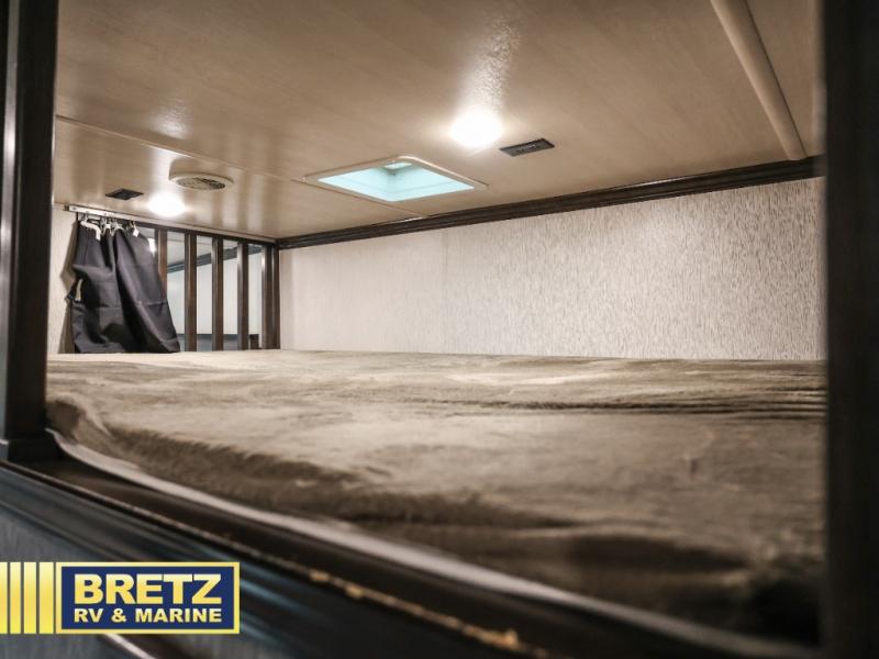 What I liked most: Large opposing double slides in living area make for a wide open feel and space. Theater seating and three-person couch provide plenty of adequate seating. Very unique second bedroom or den with loft above it for extra sleeping area.