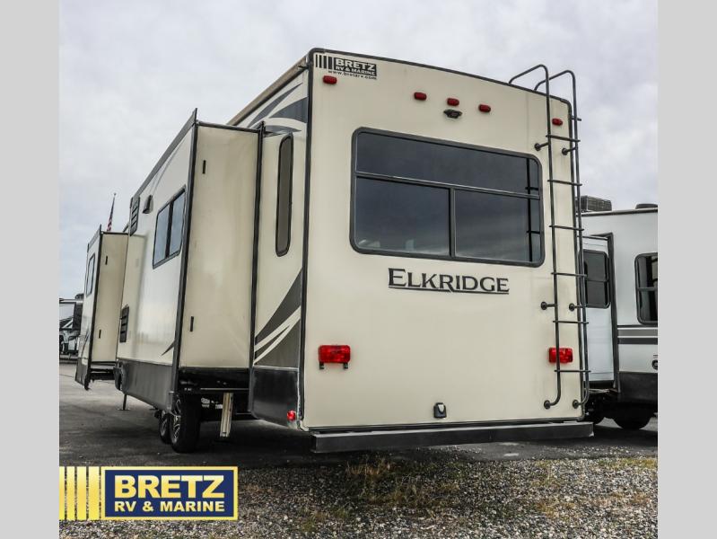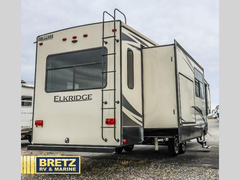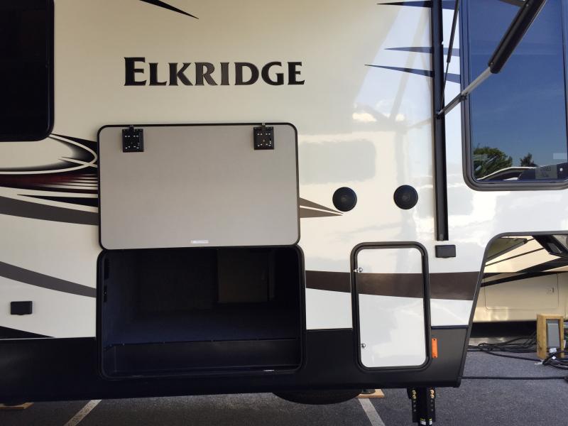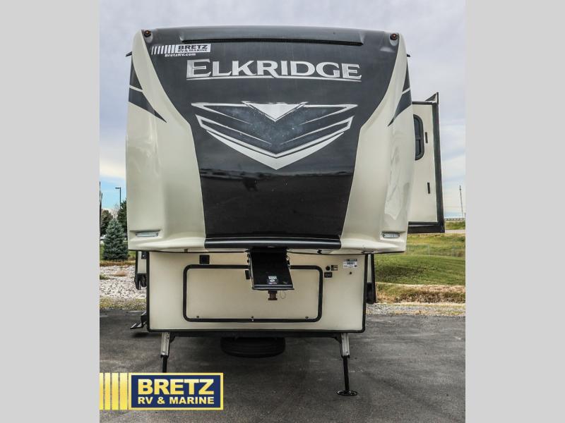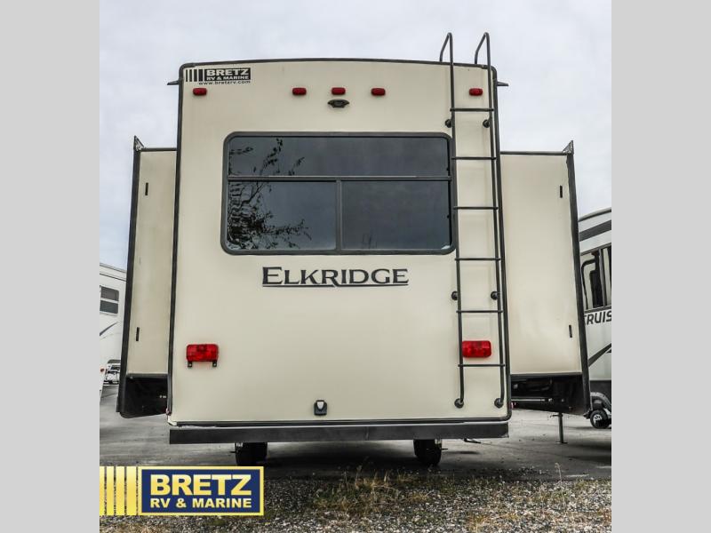 Increase your expectations for RV travel by indulging in an Elkridge fifth wheel. From the solidly built construction base with its welded aircraft-quality aluminum structure and one-piece walkable EPDM rubber roof, to the elegant exterior additions like the aerodynamic fiberglass front cap and deluxe power awning with LED lights, the Elkridge exudes its fine craftsmanship throughout every aspect of its design. The ceiling fan is a helpful feature for the warmer summer months because it will keep your guests refreshed with the cool breeze that it brings, and you will find many uses for the exterior shower with hot and cold water as you play outdoors or cook out at the campfire.