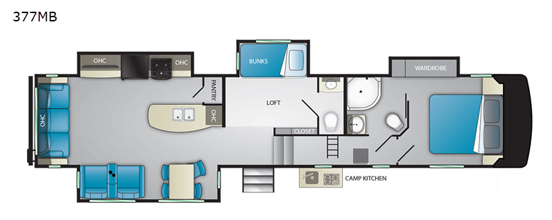 You won't believe how luxurious this Milestone fifth wheel is! Because this unit includes both a private master suite with its own entrance into the full bathroom and a private bunkhouse suite with its very own half bathroom, you have plenty of comfortable sleeping space for eight people, and the overhead loft is where your kids will beg to spend their afternoons as they build forts and play together. The rear living area is also extremely appealing for its relaxing theater seats and free-standing table with chairs.