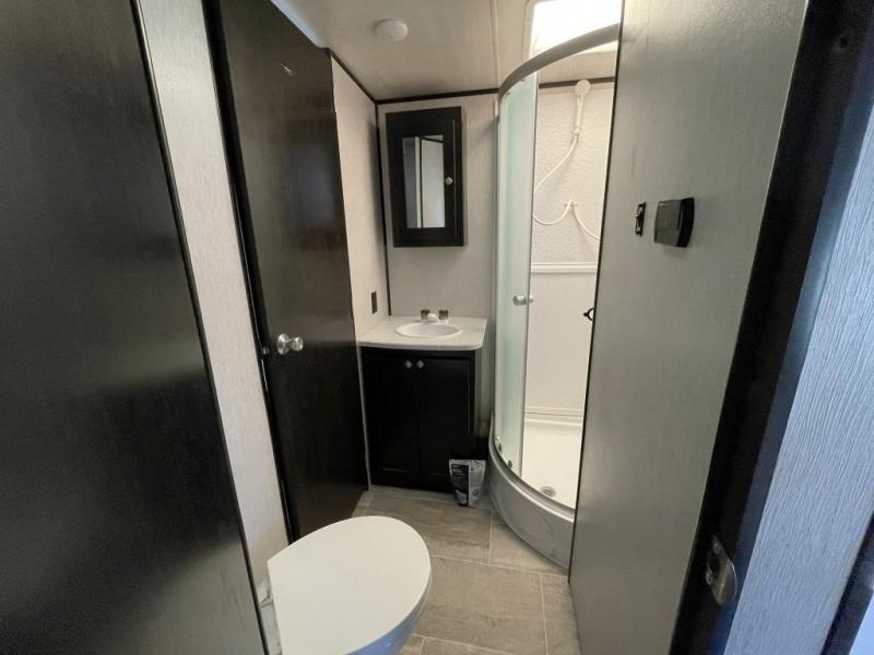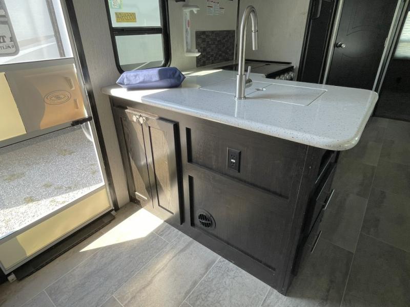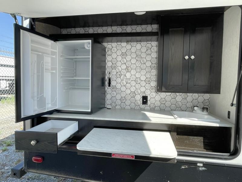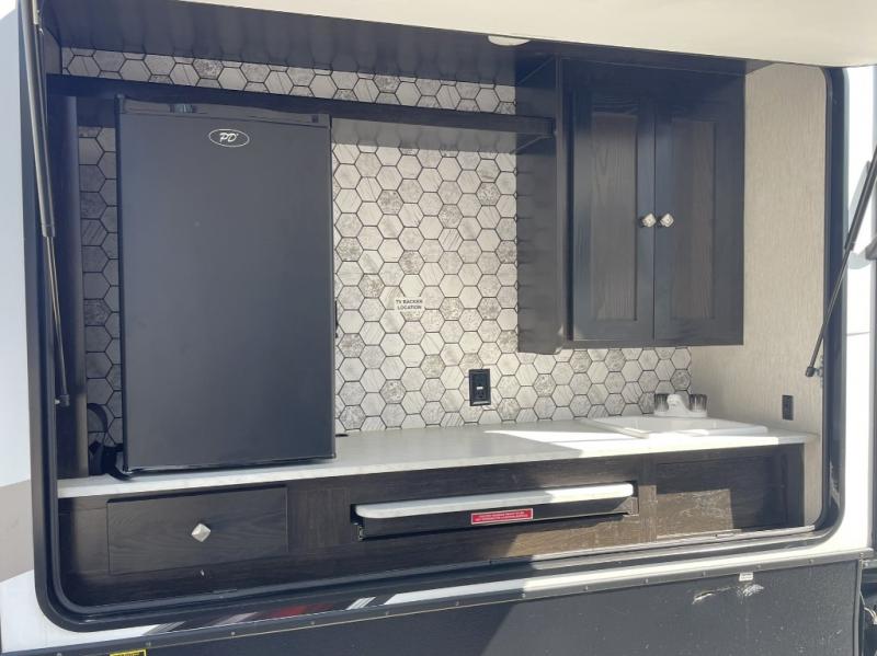 This family focused floorplan offers a private space for kids or guests in the rear bunkhouse, while the adults can enjoy a peaceful retreat in the front master bedroom. The central living area includes a kitchen, dinette, and entertainment center, giving everyone room to relax. The outside kitchen makes outdoor cooking a breeze, so you can enjoy meals under the awning without missing the fun.