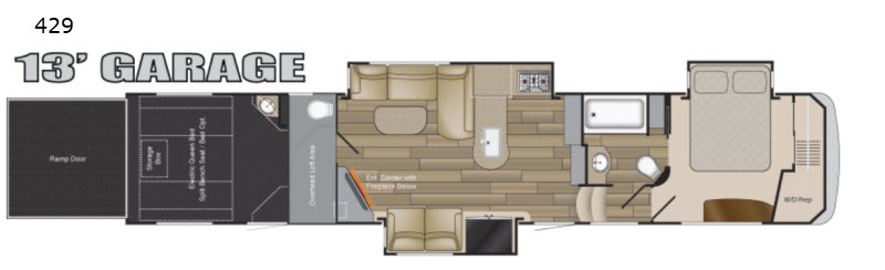 In this Heartland Road Warrior you can have it all, a place for your toys and gear, plus space that provides the comforts and conveniences of home! This toy hauler fifth wheel model 429 features triple slide outs and one and a half bathrooms with the half bathroom in the garage so you can easily clean up after playing outdoors. The 13' garage has plenty of room for any off-road toys that you want to bring along, and after your gear is unloaded then there is an electric bed which can be used for additional sleeping space as well as the split bench/optional bed. In the combined kitchen and living area you can relax while watching TV or enjoy a fire in the fireplace. The loft is a nice hang out place for your kids, and at night mom and dad can retreat to the private front bedroom.