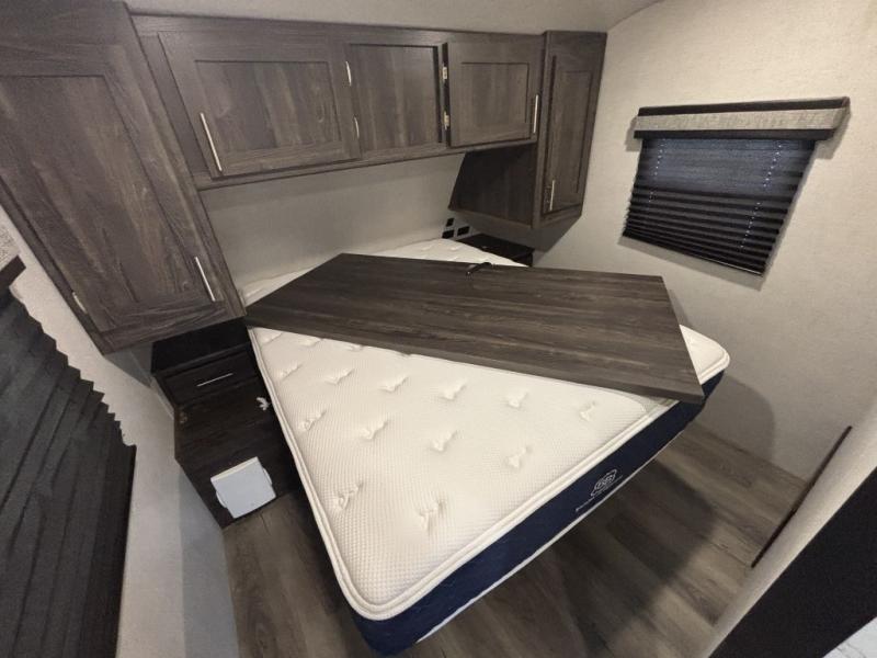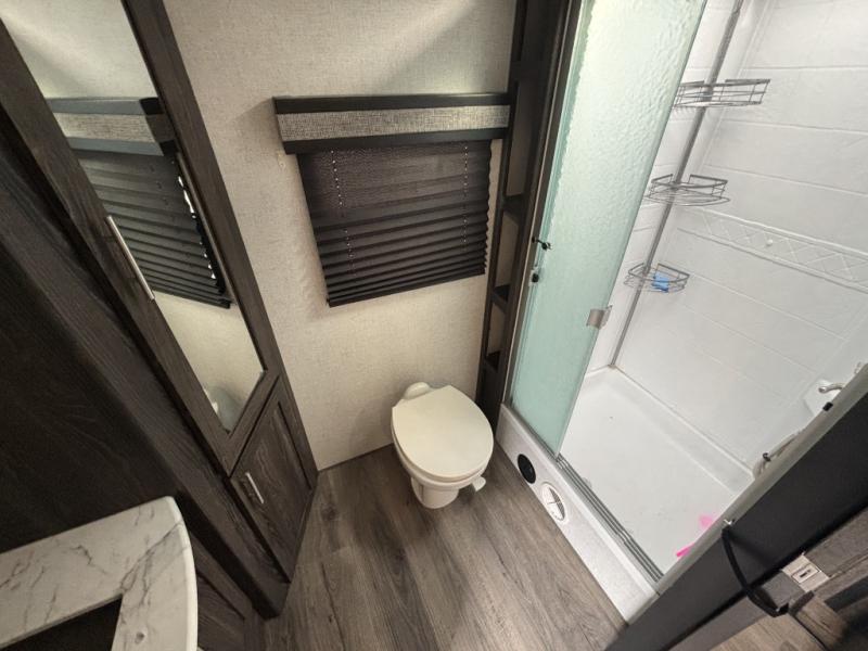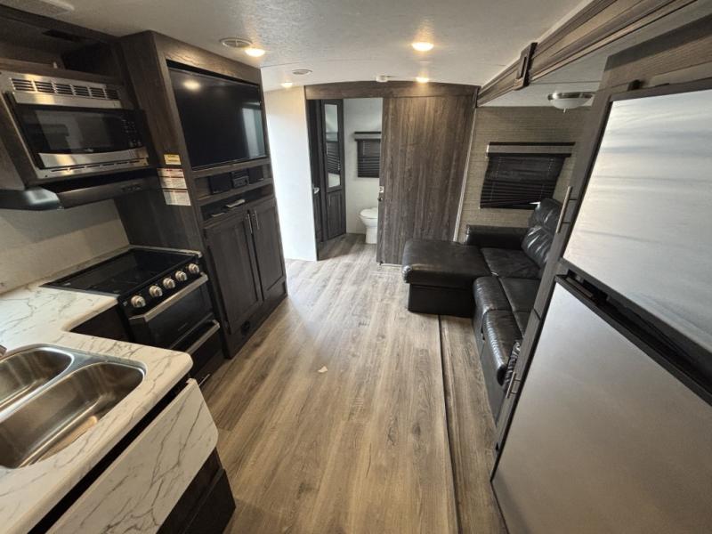 If you've been searching for a couple's trailer with all the kitchen and bath amenities needed for an extended stay without the larger size of some RVs, then this Mesa Ridge Lite travel trailer is the one for you! It is easy to tow and setup, and it is comfortable for short or long trips. After a fun day outdoors, you can retire inside to an air conditioned living area with a comfortable L-shaped sofa, watch the 39" LED TV, or play a board game at the dinette table. The cook will surely enjoy using the stainless steel appliances to make meals, and the rear full bathroom allows you to stay clean wherever you go.