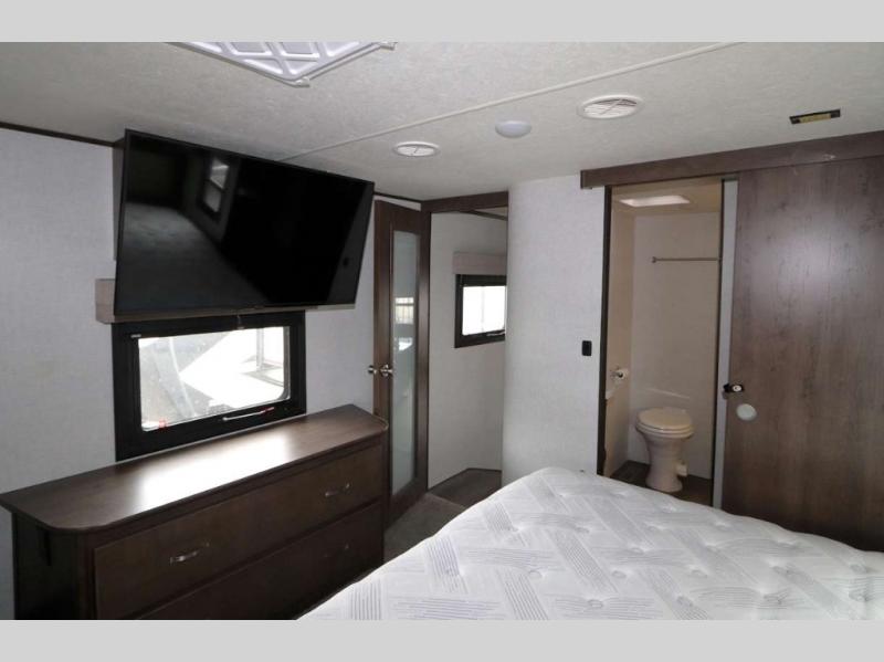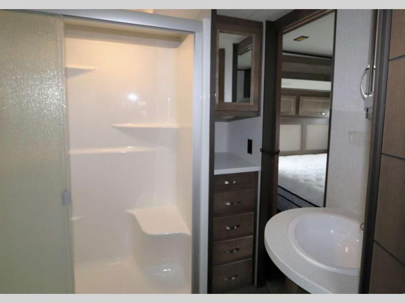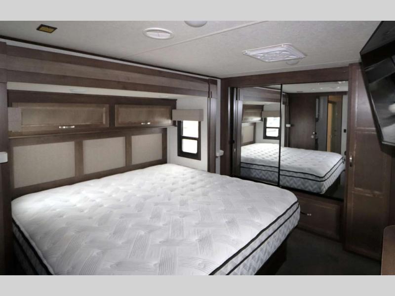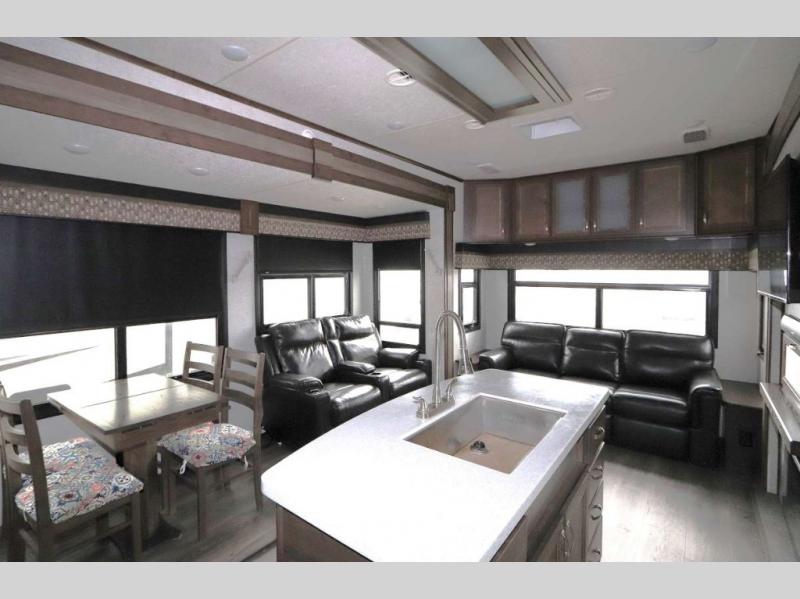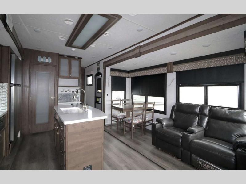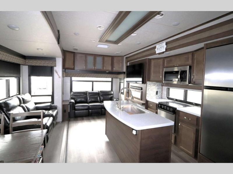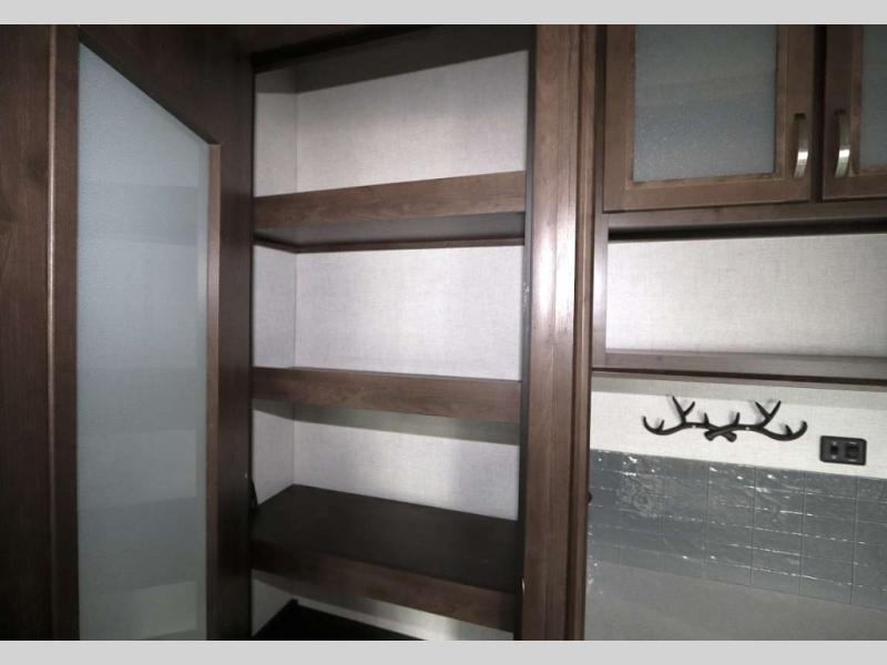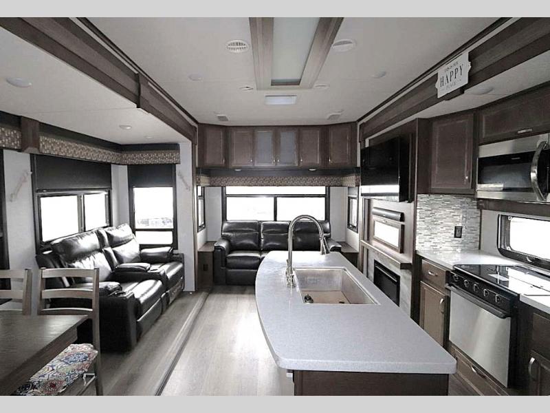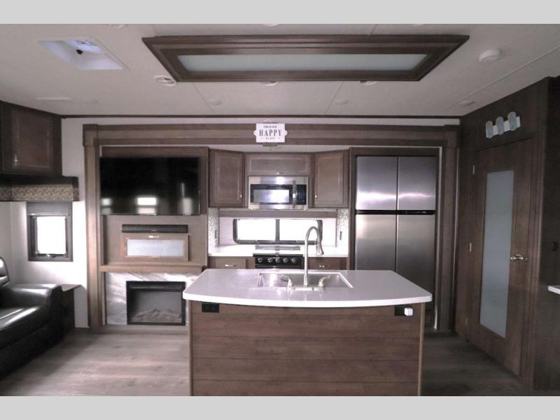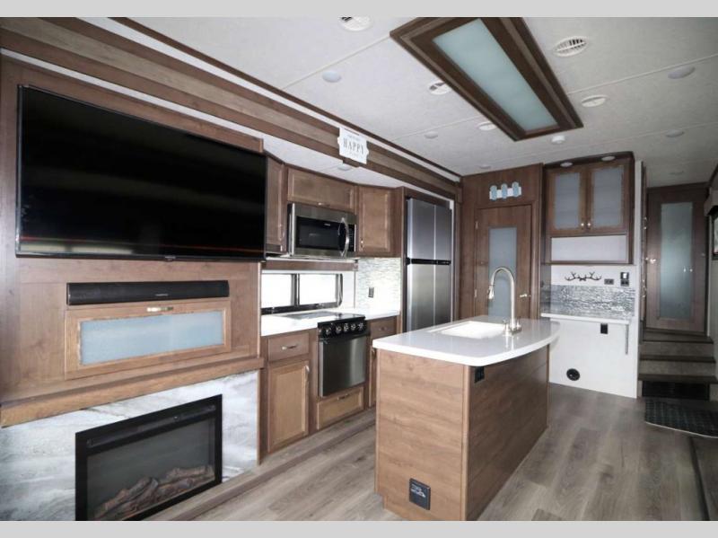 Imagine looking out the windows to see new scenery each time you decide to load up and head out in this fifth wheel. You can dine or work at the free standing dinette while watching the LED TV, staying warm by the fireplace, and visiting with the cook. The cook will love the storage in the walk-in pantry and the counter space on the kitchen island. You can entertain other RVers with plenty of space to move around with dual slide outs in the main area, plus seating for nine. When everyone leaves, you can take turns getting ready for bed in the full bathroom and master bedroom. You will love the mirrored wardrobe, and washer and dryer option, plus the comfortable queen bed. Come see what else makes this the perfect RV to stay awhile.