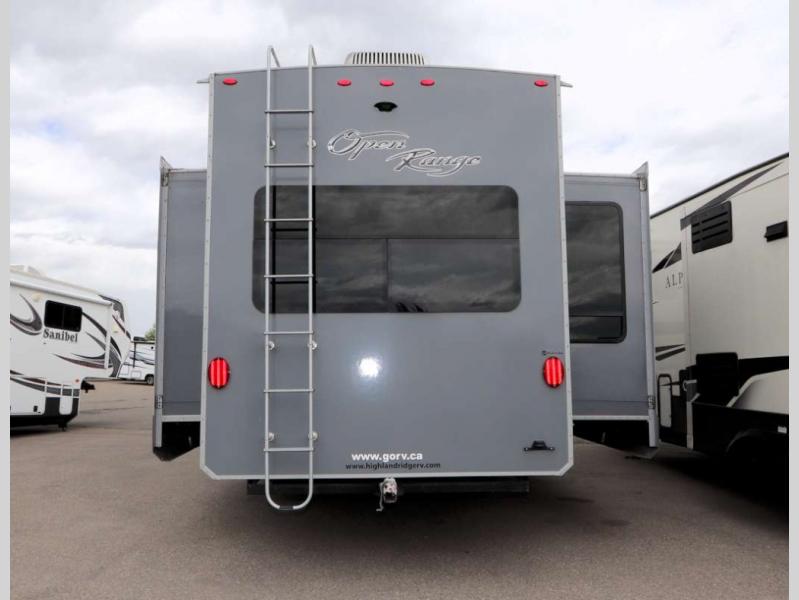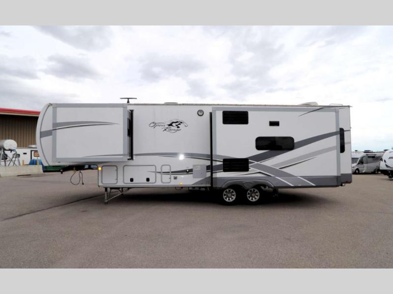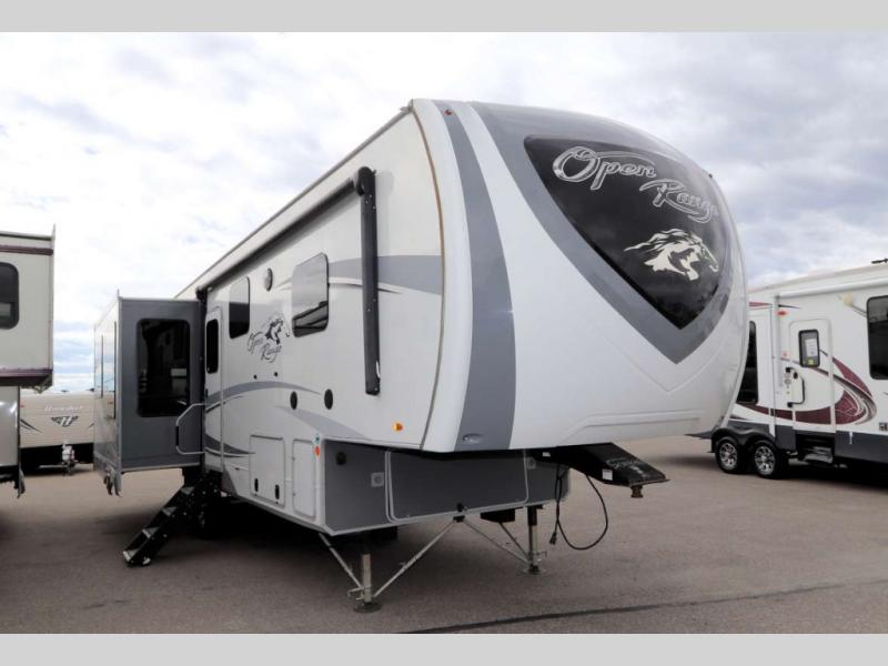 The Highland Ridge RV Open Range is designed for extended use during any season. Each fifth wheel offers inside comforts such as stainless steel appliances, ball bearing full extension drawer guides, a motion sensor light in the bedroom and hallway, as well as a USB/12V charging port that charges your portable electronics even when you are not hooked up to a power source. You will experience a quick and easy way to set up your fifth wheel with the 6-Point automatic leveling system or 4-point leveling system depending on the model you choose, and the JT Strong Arm stabilizers helping to eliminate movement while inside the unit. Choose your favorite Open Range today!