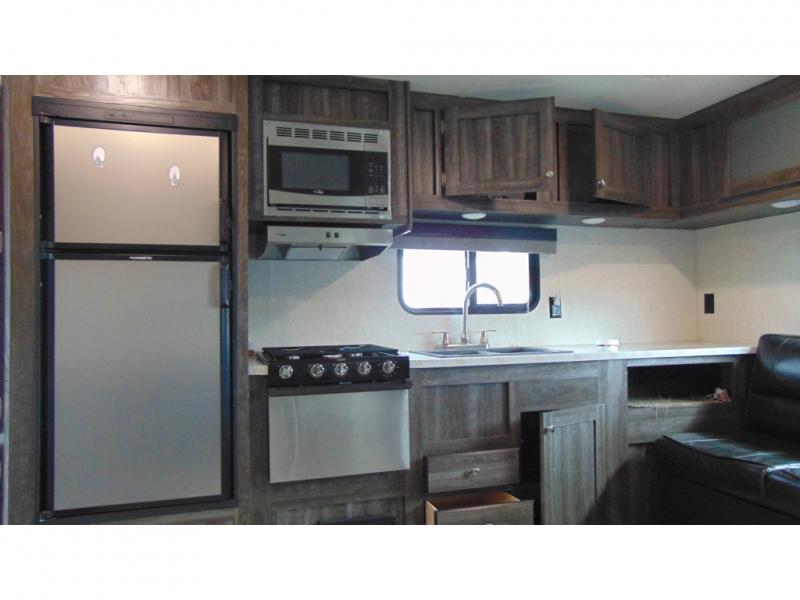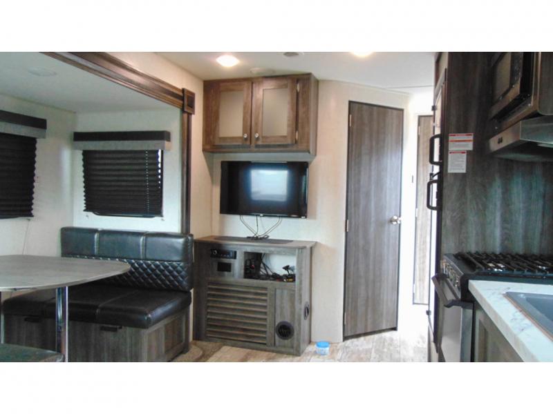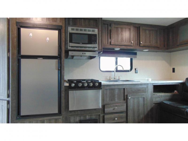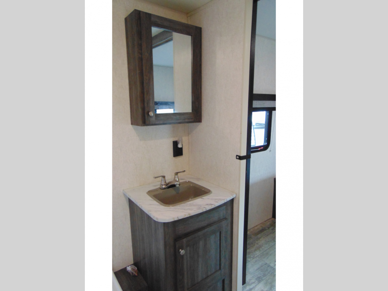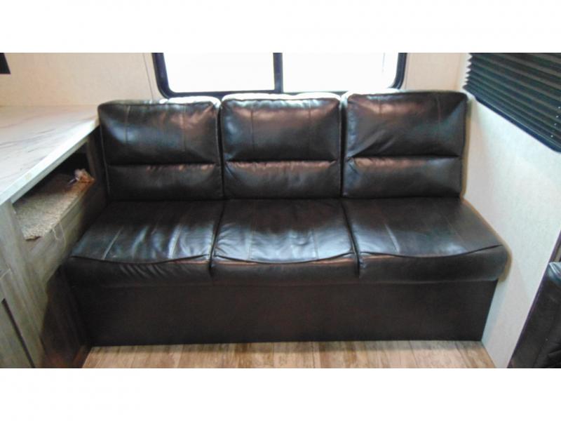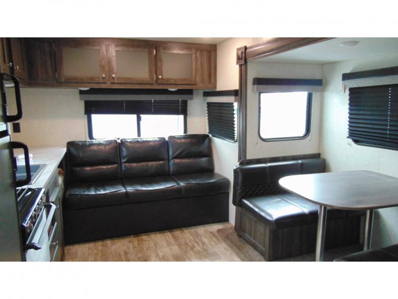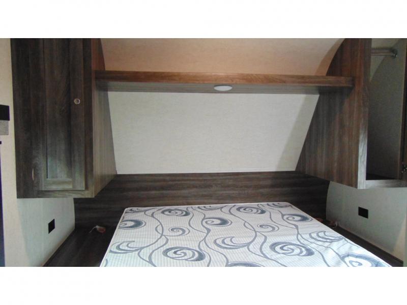 You can make meals, get cleaned up and sleep with your own accommodations anywhere you stop in this travel trailer. The cook will enjoy the full kitchen amenities across from the dinette slide, and the rear sofa is perfect to take a nap on. The furniture also provides extra sleeping space when needed. The front private bedroom provides a queen bed and quick access to the full bathroom at night. Don't worry about storage, you will find plenty throughout, plus the exterior pass-through compartment comes in handy for those larger items such as golf clubs, fishing poles, and such.