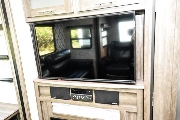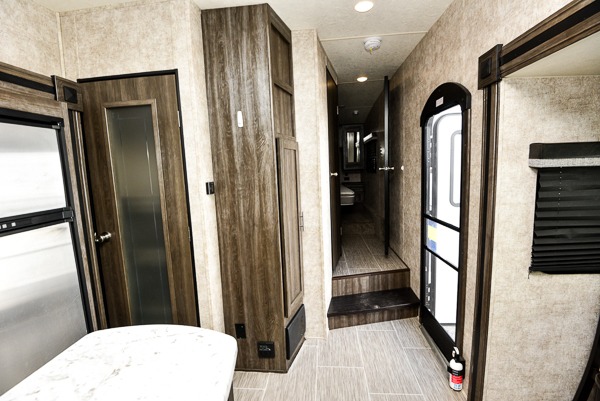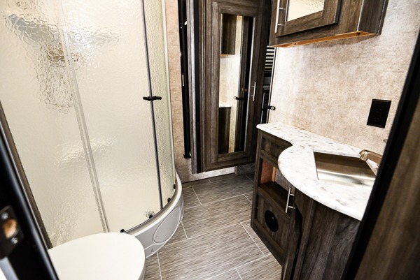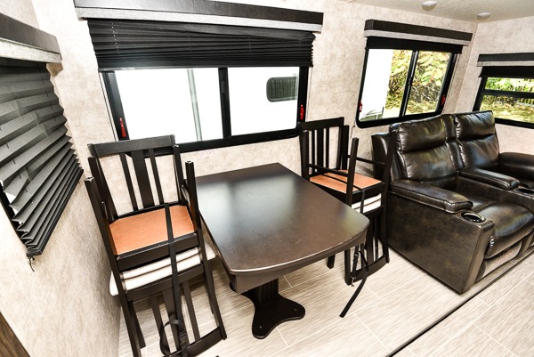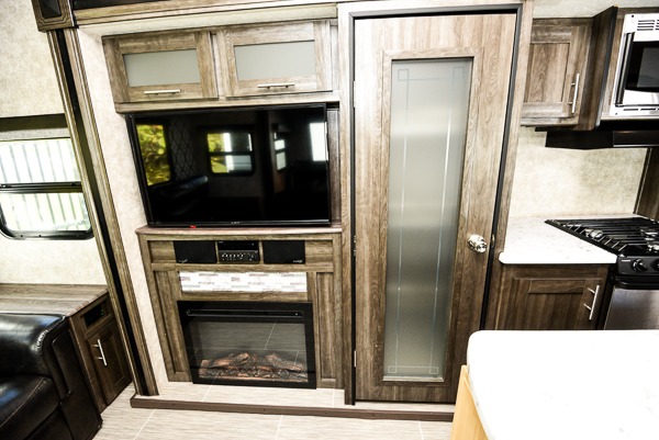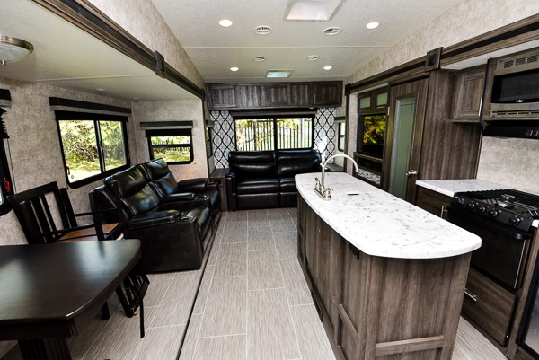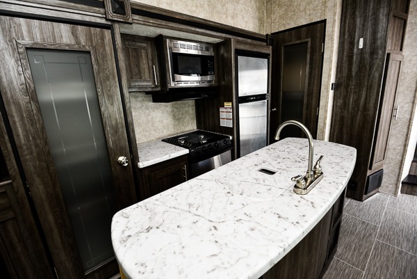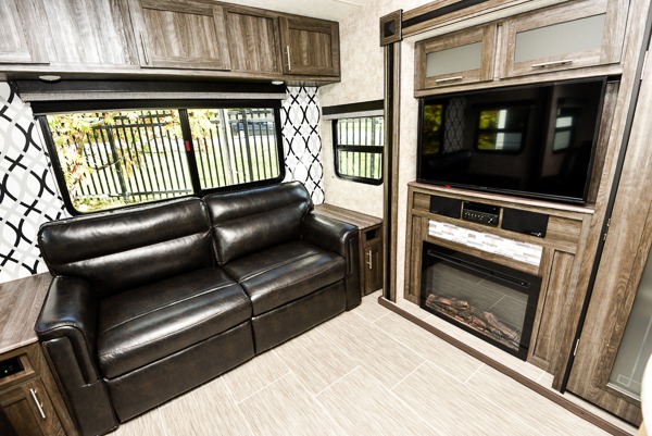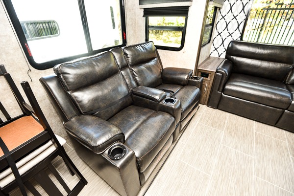 You will love all the conveniences that this fifth wheel has to offer you and your family. Just imagine relaxing inside on the theater seats and rear sofa while watching movies and shows on the 39" LED TV, or playing games with other RVers at the booth dinette. A kitchen island provides additional counter space for preparing and serving meals, while the large stainless steel sink offers easy clean up. You will be amazed at all the storage throughout each room for all your camping items especially when you take along overnight guests and/or stay longer than a weekend at any given campsite. The dual entry bath allows access from the hallway or the front bedroom which is quiet convenient at night. The front bedroom gives you a private space to get away or sleep in comfort, plus there are many more conveniences inside and outside!