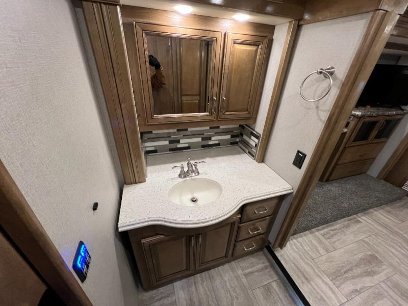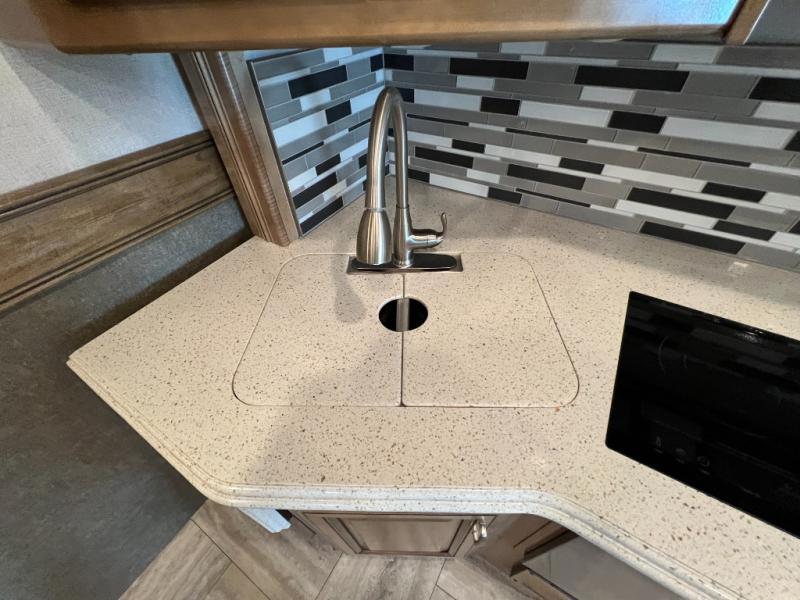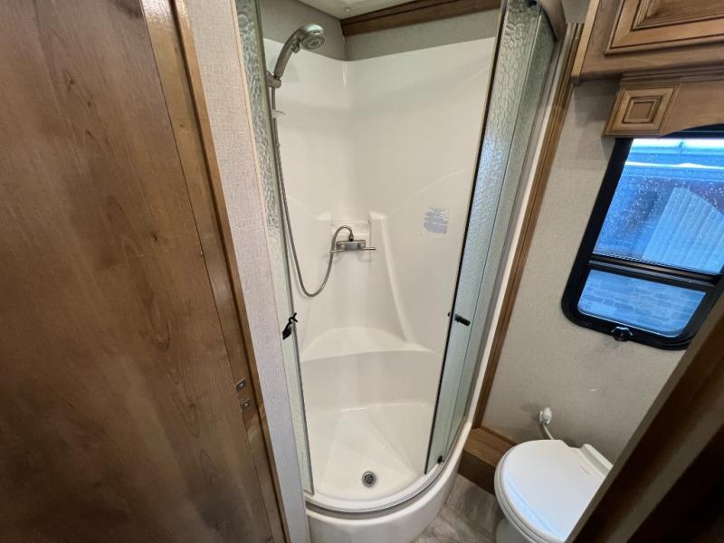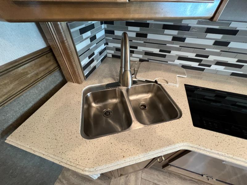 With quad slide outs there is plenty of room to move around in this 37R Navigator. Once you reach your destination, sit back and enjoy visiting with your family at the 78" sofa with air mattress, free standing recliner with footrest, or at the free-standing table. In the corner of the living room there is a 49" LED TV for you to watch your favorite movie too. There is an additional vanity sink located across from the full bathroom for those times when you need to get ready while the bathroom is occupied. The rear private bedroom features a king Encore Series memory foam mattress with an adjustable head, a wardrobe and a dresser for your clothes, plus there is a stackable washer/dryer so you won't have to bring home any dirty clothes!