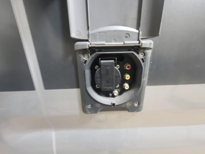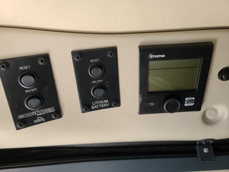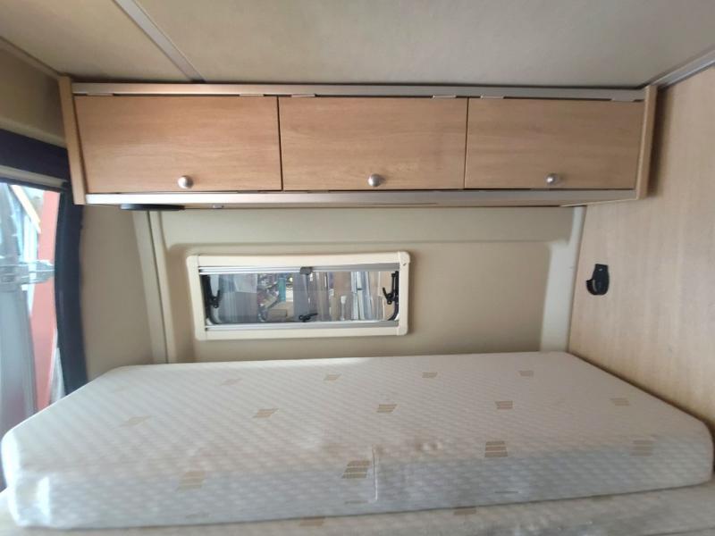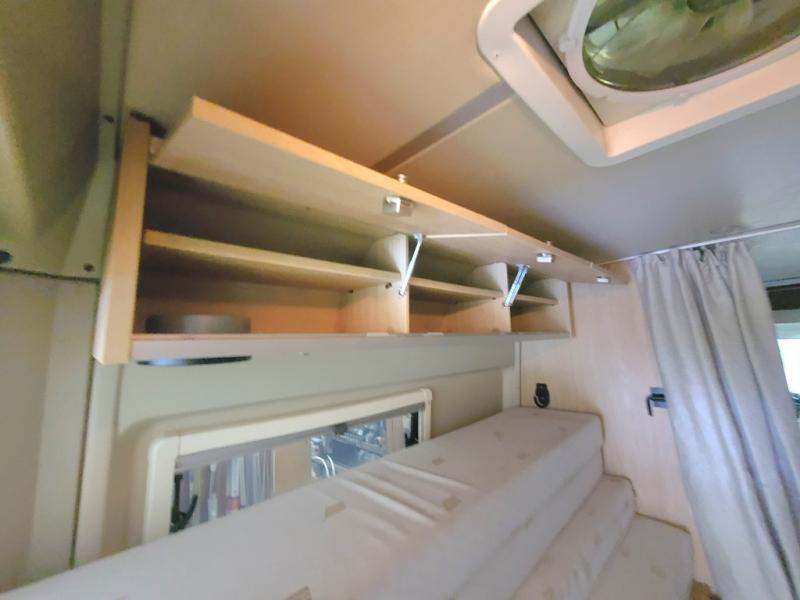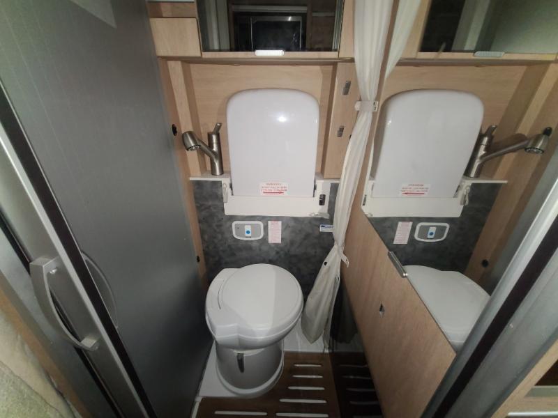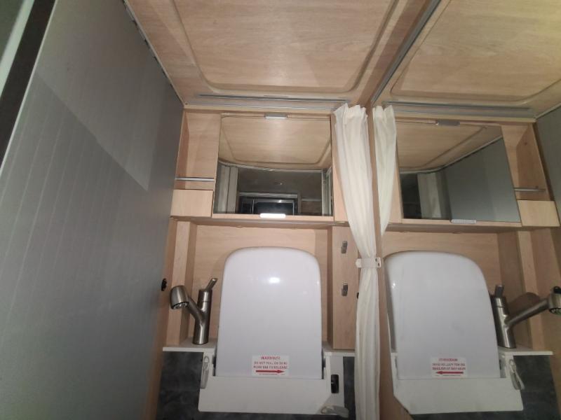 - Bathroom: Features a cassette toilet, a shower, and a medicine cabinet.