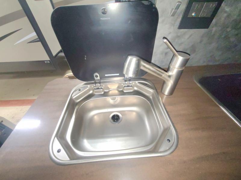 - Galley: Includes a stainless steel sink, a two-burner gas stove, a 3.1 cu ft refrigerator, and a microwave.