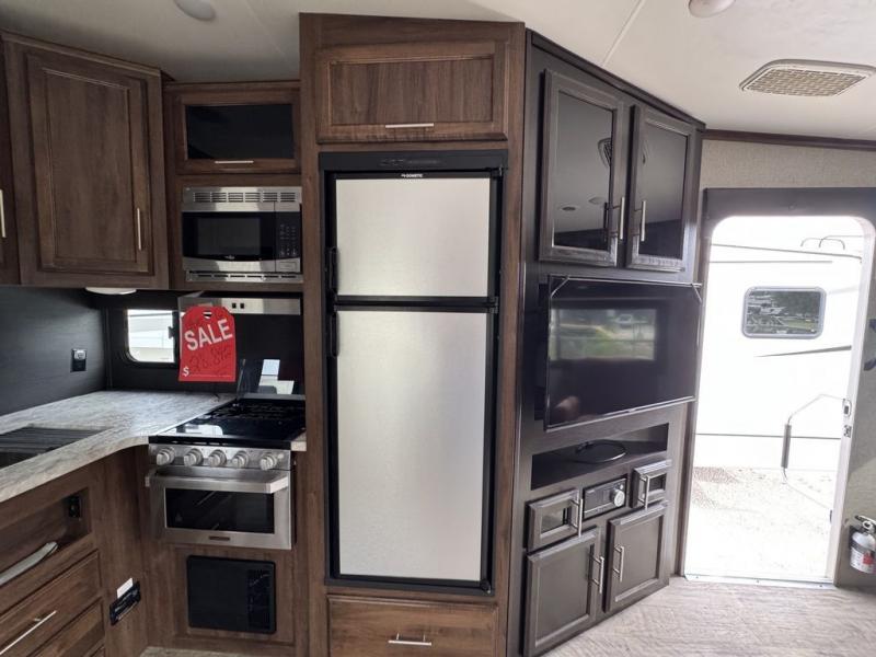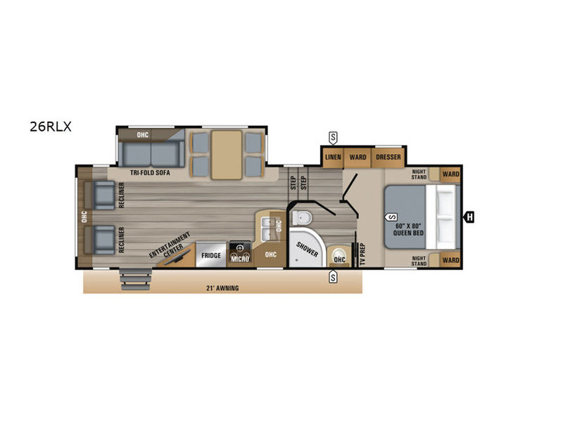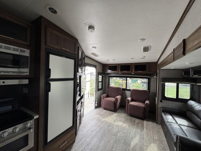 Do you want a camping trip with luxurious features from home? Well then, this Jayco Eagle HT 26RLX fifth wheel has you covered! In the entertainment center, you can choose to sit back in either one of the recliner chairs or lounge on the tri-fold sofa. A double entry bath makes those late night trips a little easier to access. Throughout the fifth wheel there is LED lighting to brighten your trip. When you're ready to hit the sack, you will enjoy jumping into the comfortable queen bed with night stands on either sides or you could keep the night going underneath the 21' electric awning with LED lights.
