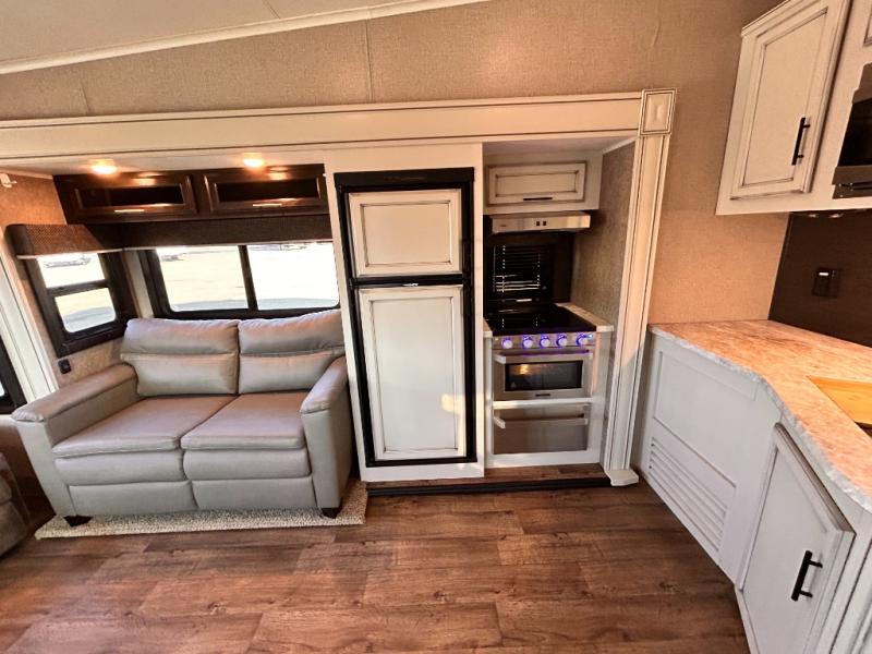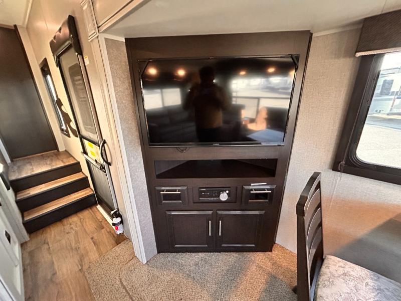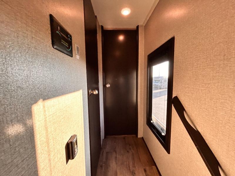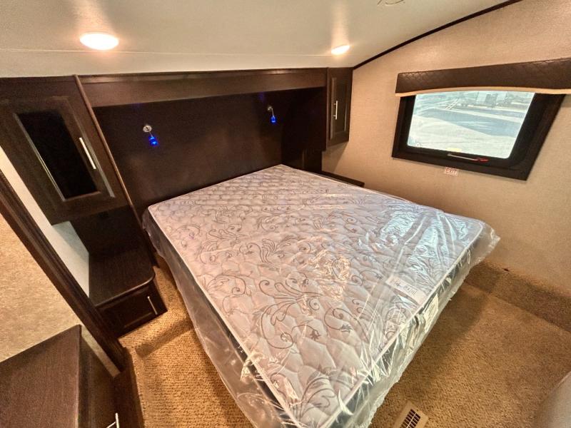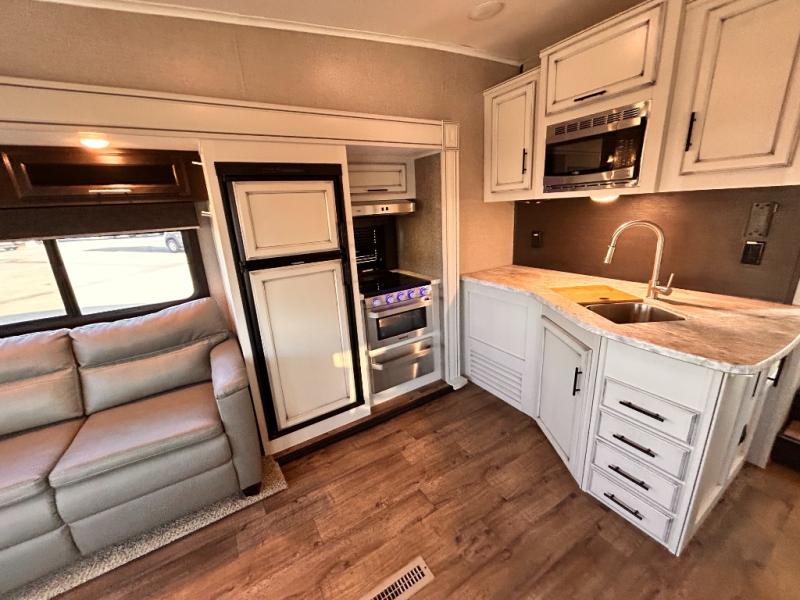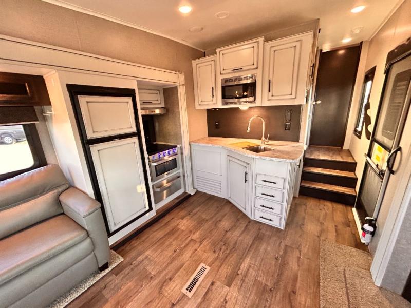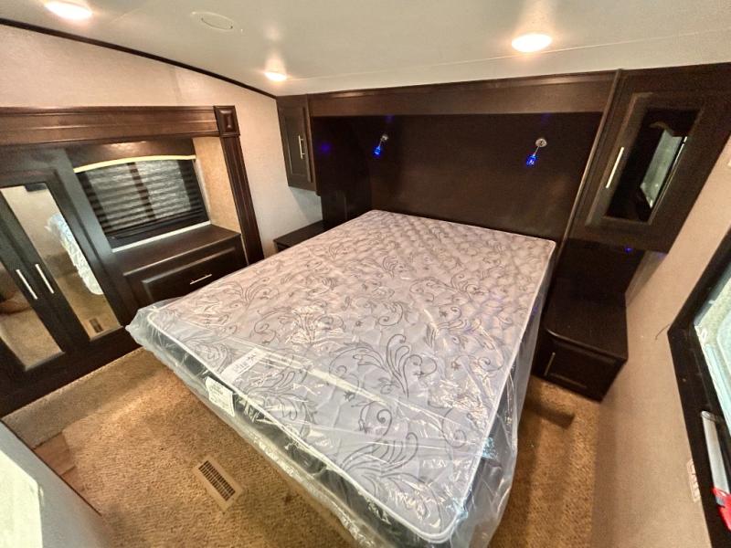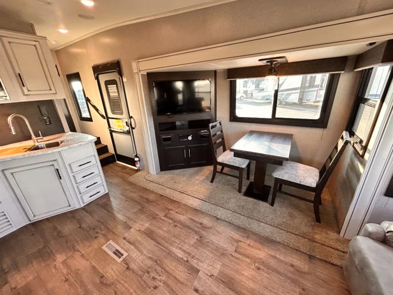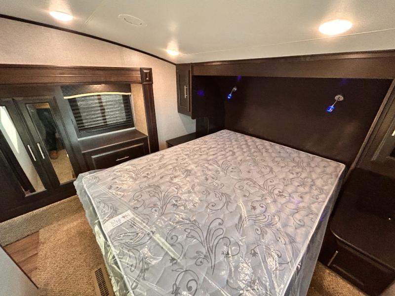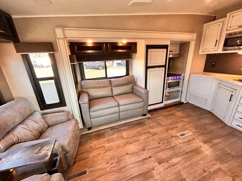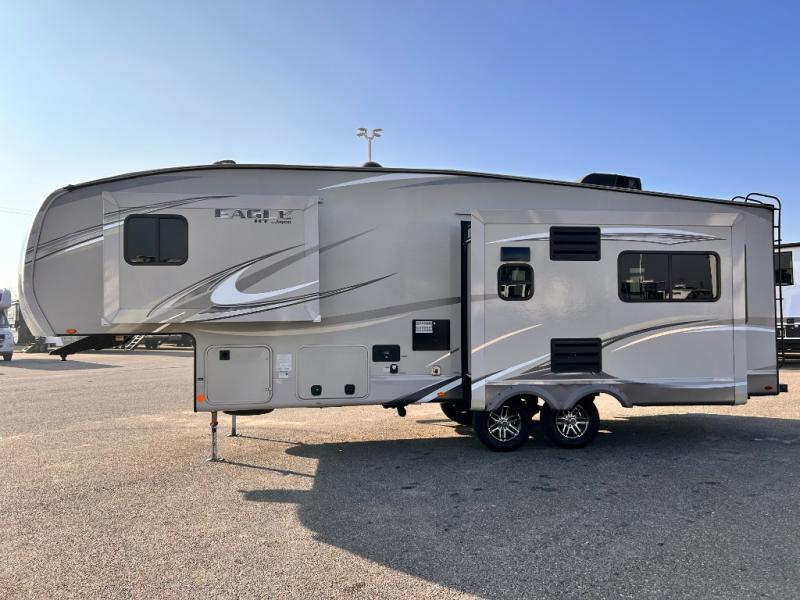For any camping trip you will want an Eagle HT fifth wheel by Jayco. Along the exterior there is a high-gloss, fiberglass front cap with built-in specialty LED lighting. Inside each model there are handcrafted glazed drawers and Shaw residential carpet with R2X stain guard plus IVC Trekk wood-plank vinyl flooring. The industry exclusive HELIX cooling system is an added bonus with Jayco-exclusive insulated duct design, directional and closeable A/C vents, larger return air vents, and the exterior-mounted 15,000 BTU Whisper quiet A/C unit. The Customer Value Package includes a residential queen Simmons mattress with under-bed storage, an electric patio awning with integrated LED lights, MORyde CRE 3000 rubberized suspension for a smoother ride, a rain proof EZ Breeze bathroom power vent, an industry first Go Power rooftop and ground solar prep, plus so much more!