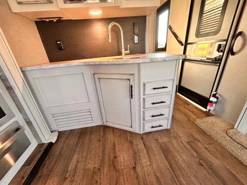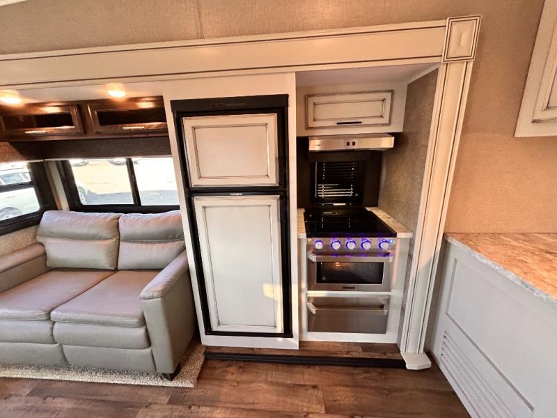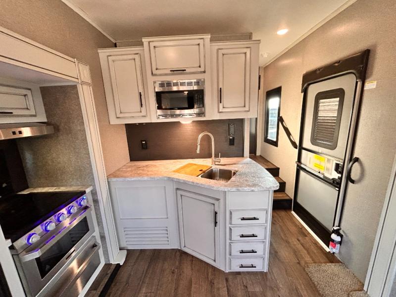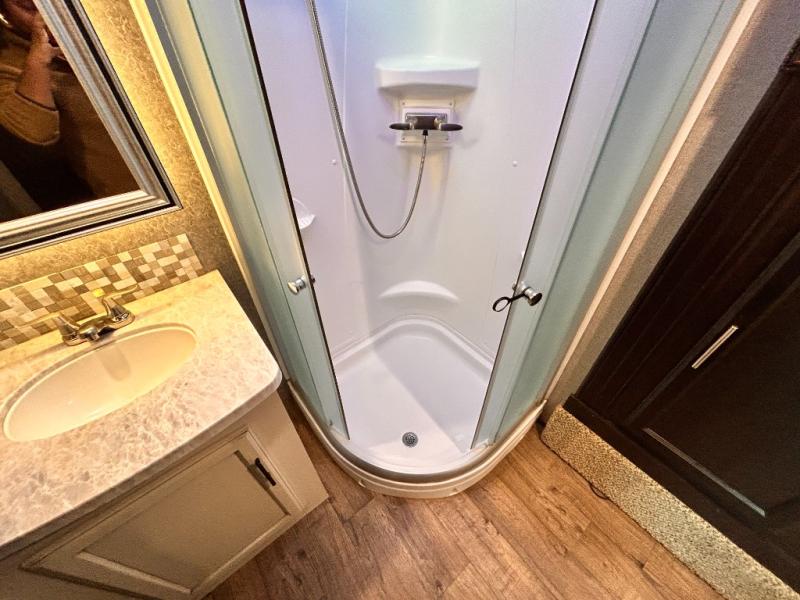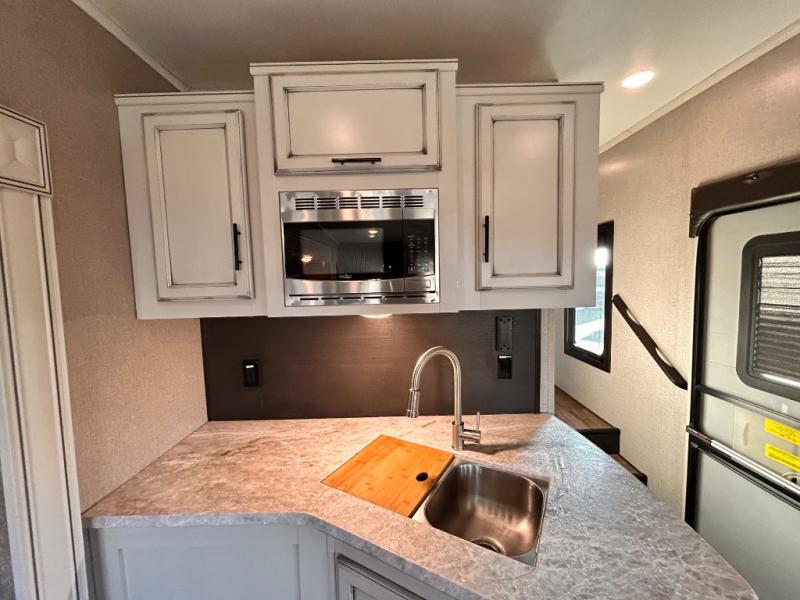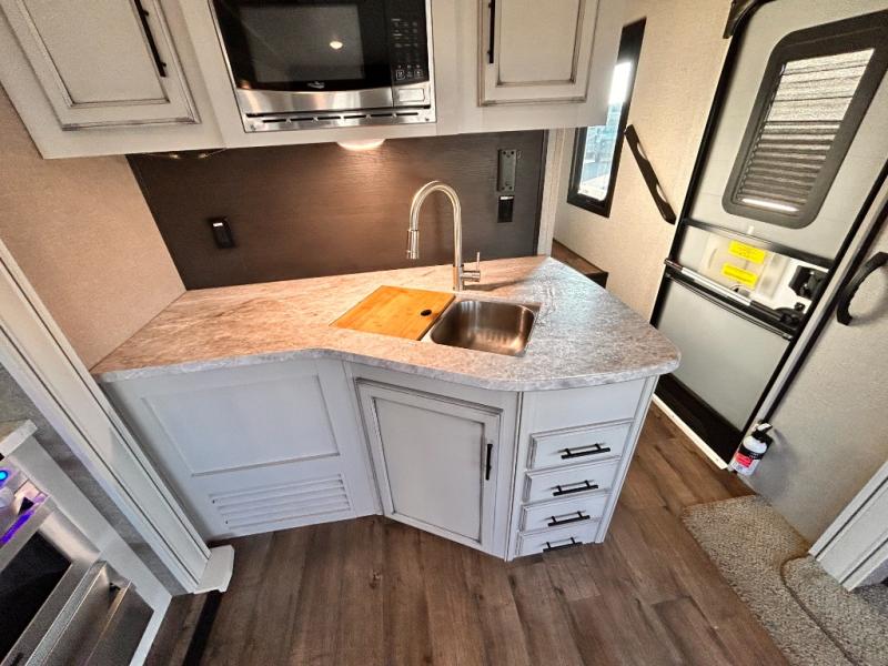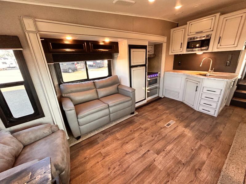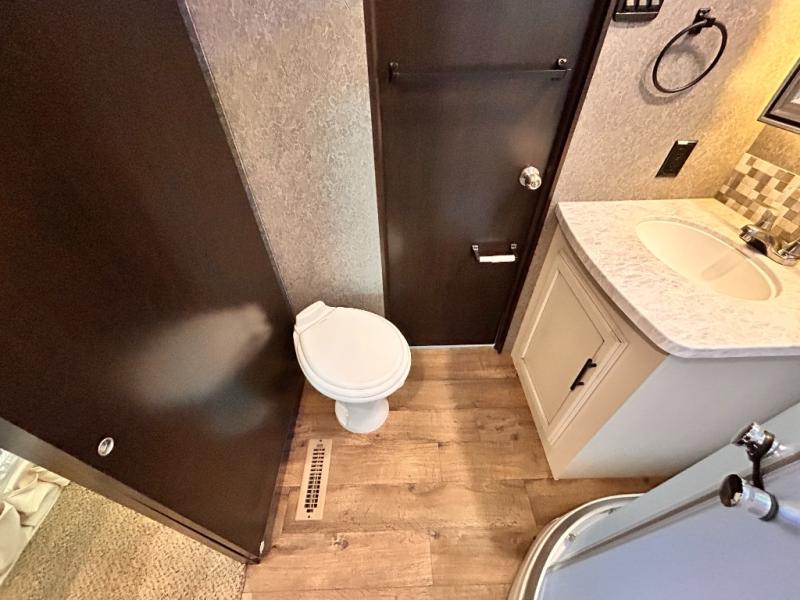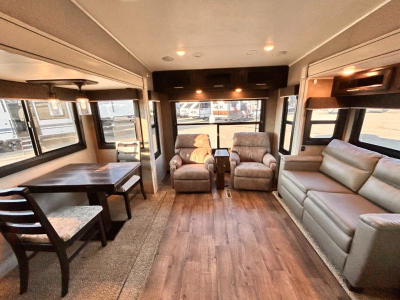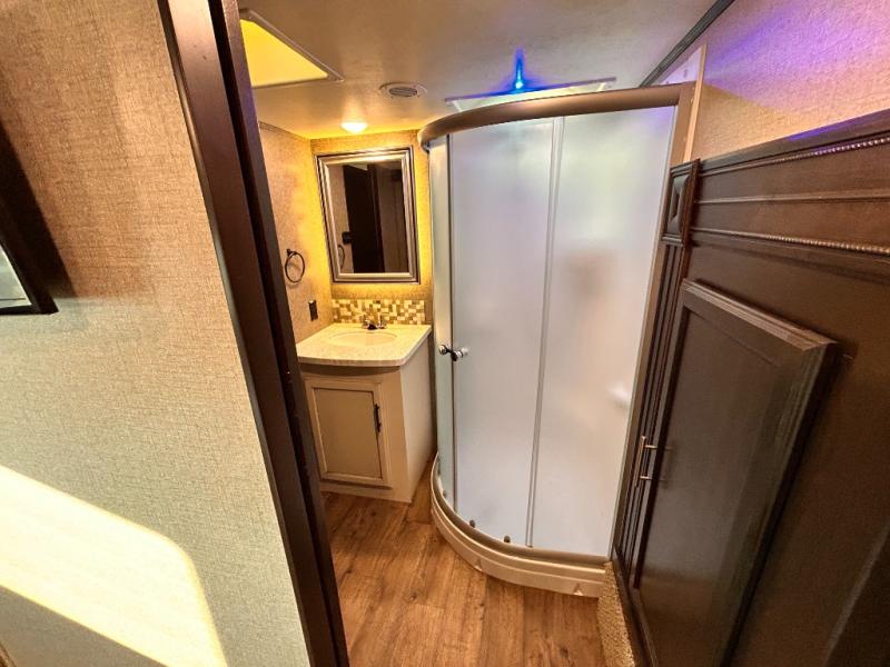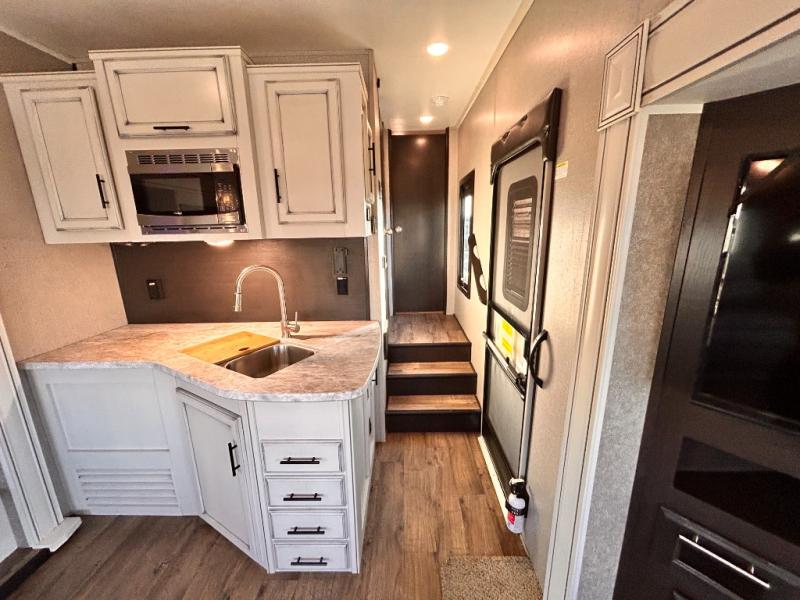For any camping trip you will want an Eagle HT fifth wheel by Jayco. Along the exterior there is a high-gloss, fiberglass front cap with built-in specialty LED lighting. Inside each model there are handcrafted glazed drawers and Shaw residential carpet with R2X stain guard plus IVC Trekk wood-plank vinyl flooring. The industry exclusive HELIX cooling system is an added bonus with Jayco-exclusive insulated duct design, directional and closeable A/C vents, larger return air vents, and the exterior-mounted 15,000 BTU Whisper quiet A/C unit. The Customer Value Package includes a residential queen Simmons mattress with under-bed storage, an electric patio awning with integrated LED lights, MORyde CRE 3000 rubberized suspension for a smoother ride, a rain proof EZ Breeze bathroom power vent, an industry first Go Power rooftop and ground solar prep, plus so much more!