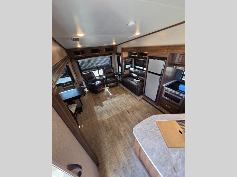 For any camping trip you will want an Eagle HT fifth wheel by Jayco. Along the exterior there is a high-gloss, fiberglass front cap with built-in specialty LED lighting. Inside each model there are handcrafted Sugar Maple glazed drawers. Throughout each model there is Shaw residential carpet with a sound dampening carpet pad plus IVC Trekk wood-plank vinyl flooring. The industry exclusive HELIX cooling system is an added bonus with the Jayco-exclusive insulated duct design, directional and closeable A/C vents, larger return air vents, and the exterior-mounted 15,000-BTU Whisper Quiet A/C unit. The Customer Value Package includes a residential queen Simmons mattress with under-bed storage, an electric patio awning with integrated LED lights, MOR/ryde CRE/3000 rubberized suspension for a smoother ride, a rain proof EZ Breeze bathroom power vent, an industry first Go Power rooftop and ground solar prep, and so much more!