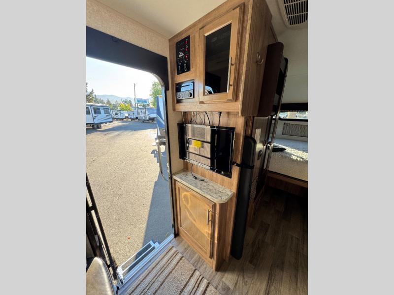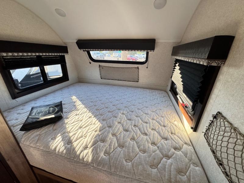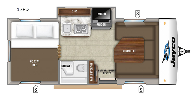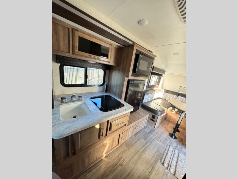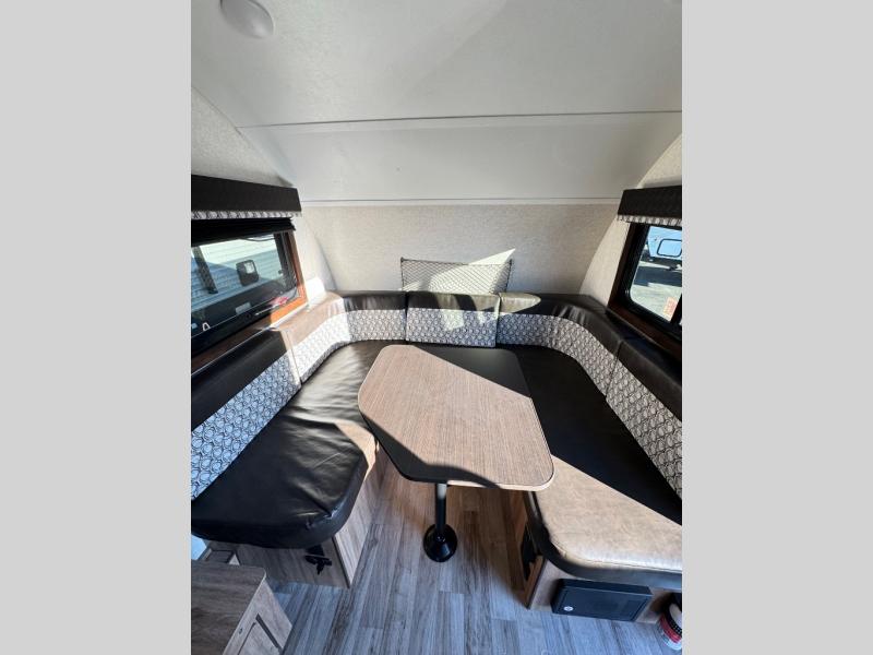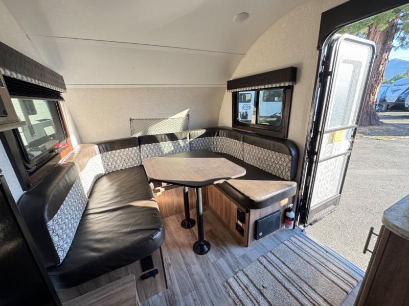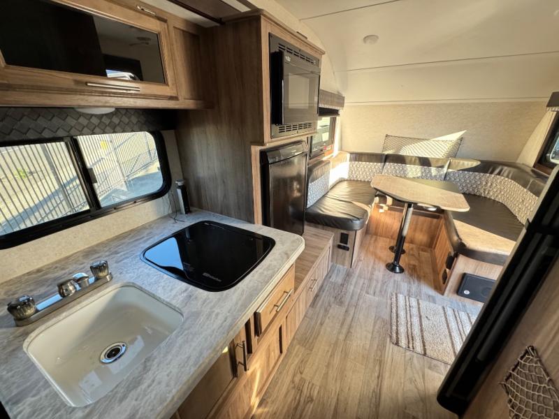 Get ready to head out to your campground of choice for a relaxing weekend away with this Jayco Hummingbird 17FD travel trailer. You will find plenty of seating for meals around the large front u-dinette, and at night you can use this area for additional sleeping space. Also in the rear there is a comfortable queen bed with bedspread and pillows. The slide out along the roadside helps to maximize the floor space plus here you will find the kitchen amenities. The power awning with LED lights not only provides shade during the day from the sun, but at night you can also grab a snack and enjoy the evening sunset under the awning.