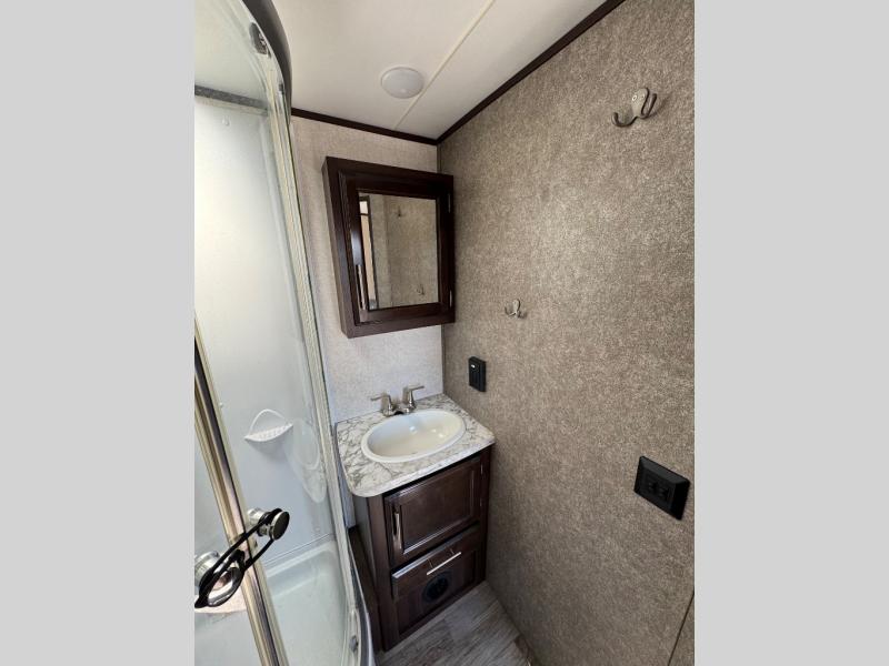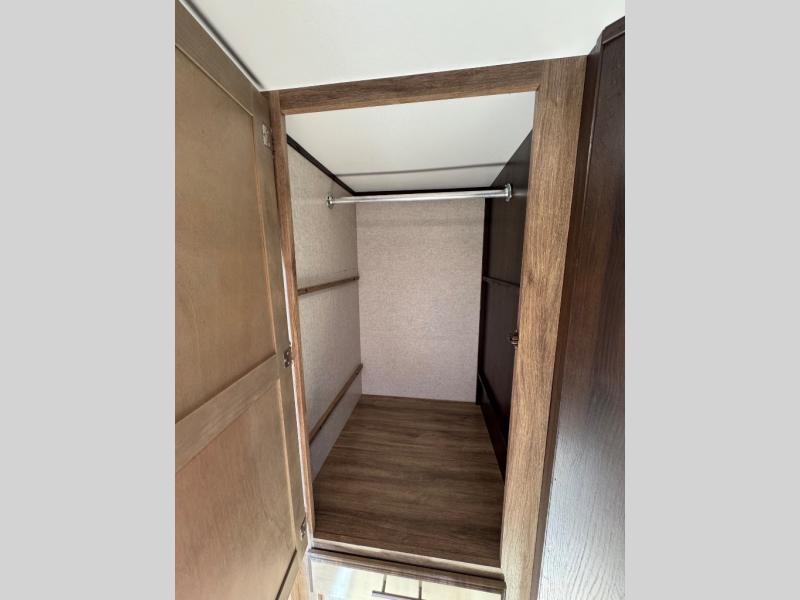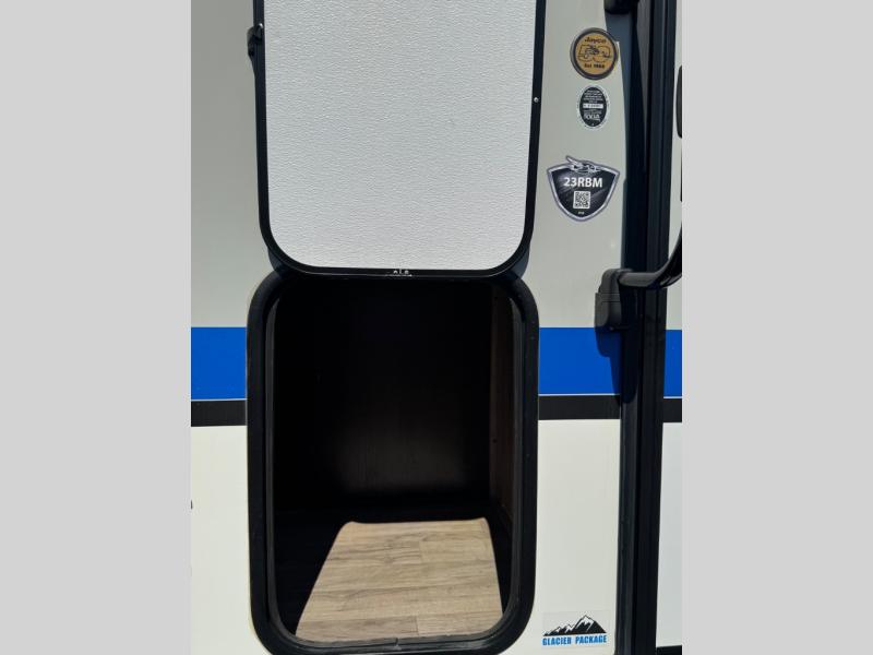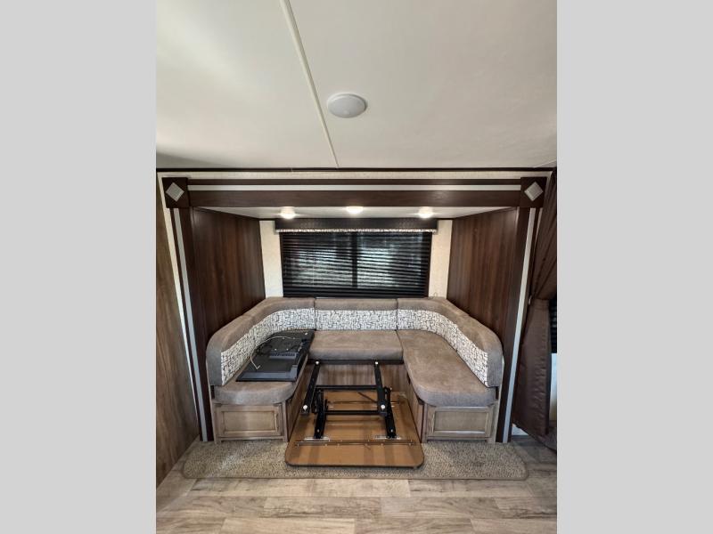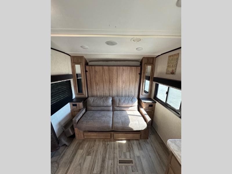 This Jay Feather travel trailer 23RBM will have you booking campsites year round thanks to the comfortable accommodations and easy set up at each destination. After hiking, biking and enjoying the great outdoors you can come back to relaxation and your own furniture and bedding. The living area includes a slide out, providing you with more interior space, and the Murphy Bed which easily pulls down on top of the sofa into place. The large u-dinette is great for meal times and can also be converted to additional sleeping space. Everyone will appreciate the full bath especially at night. This unit also includes an exterior storage door for your camping gear! Take one step inside, you will be hooked.