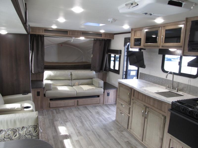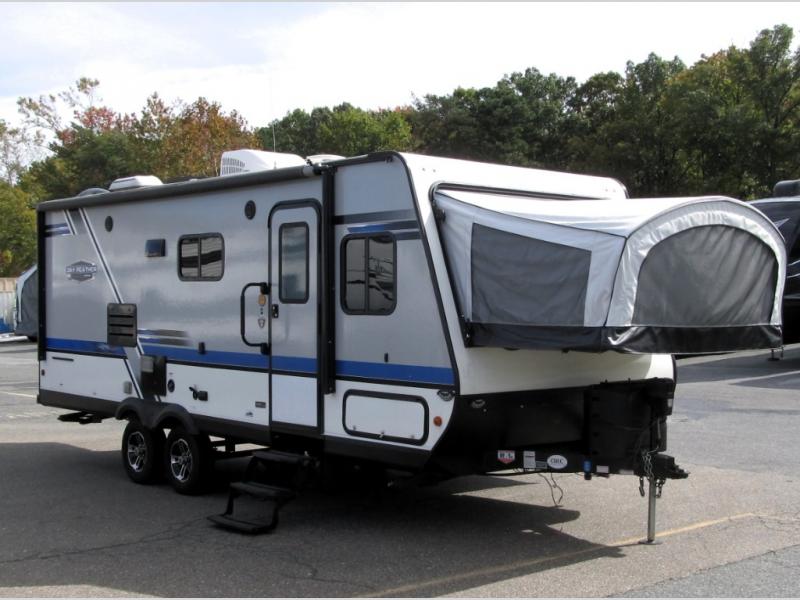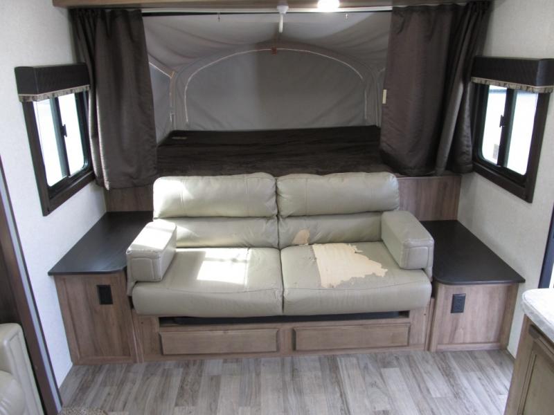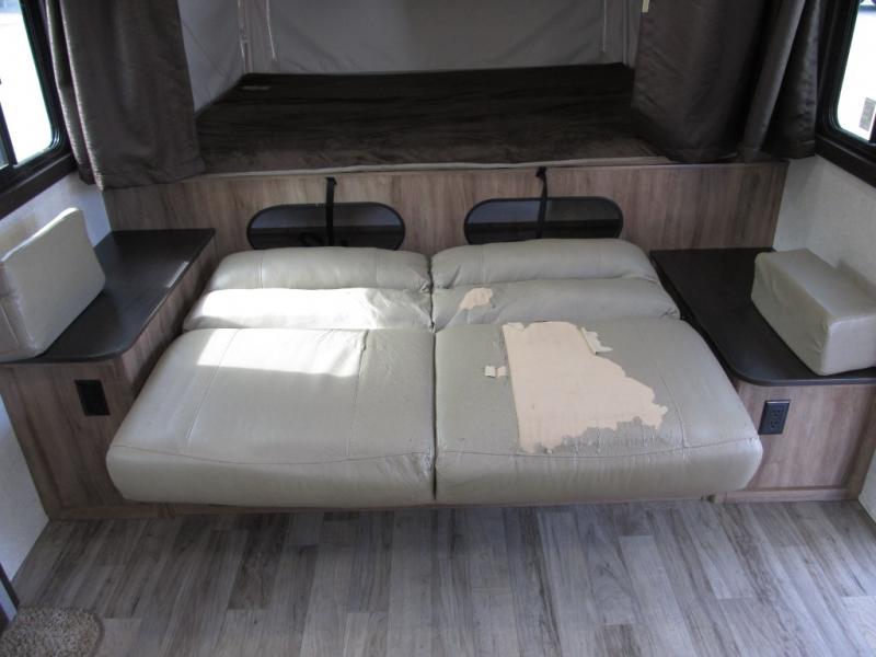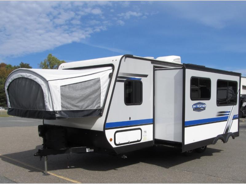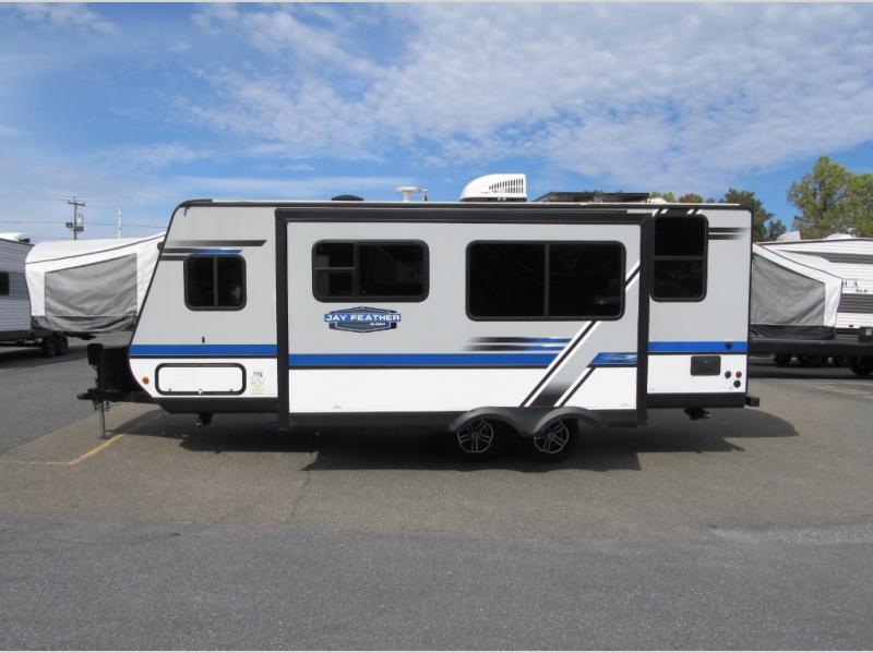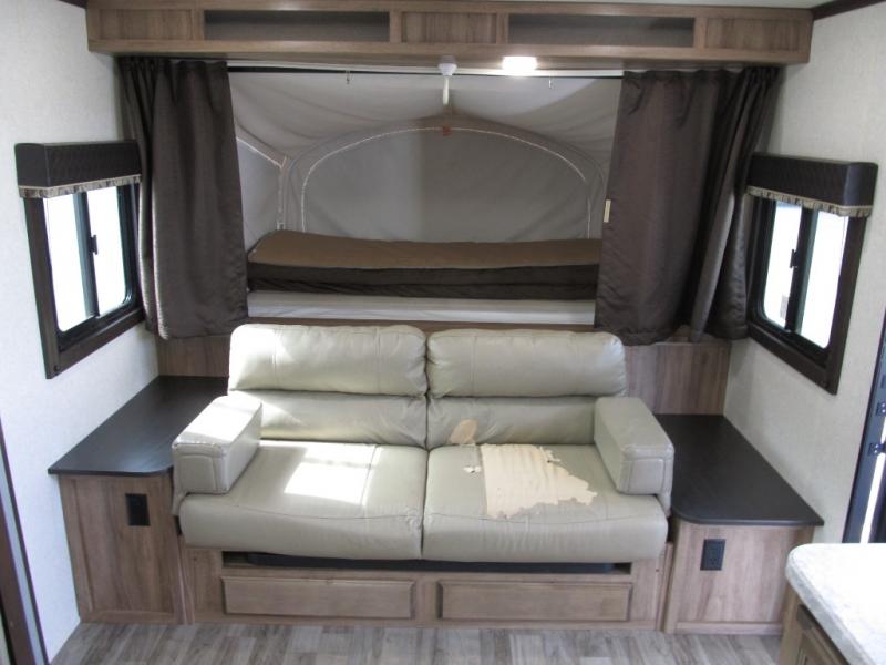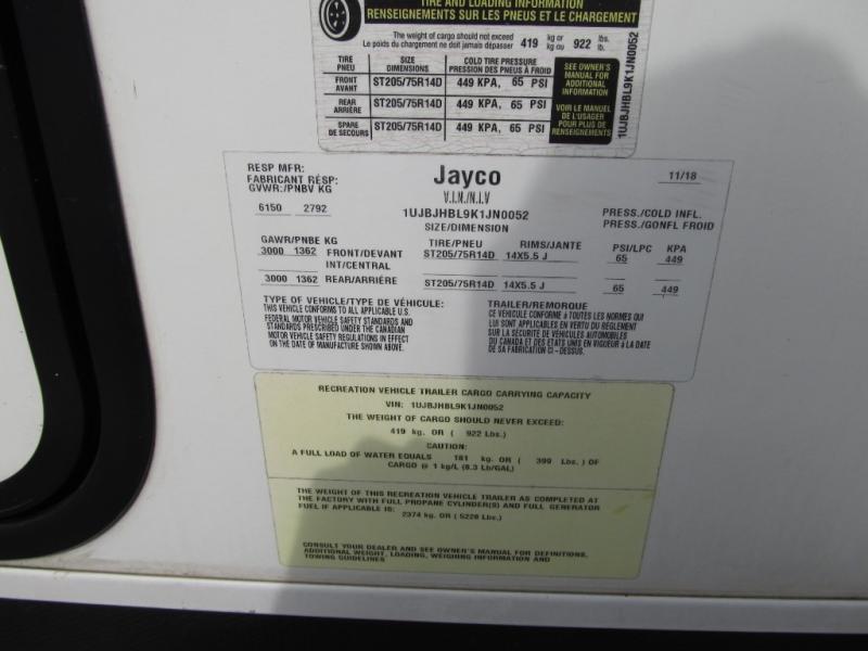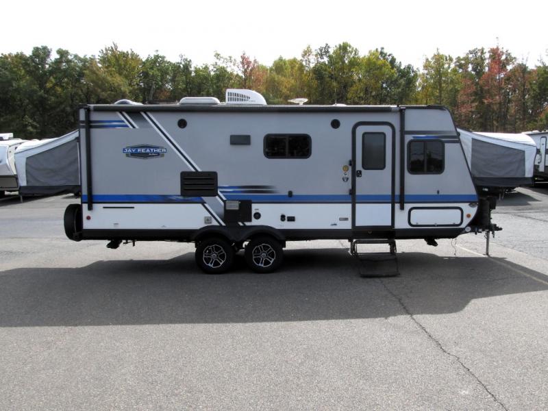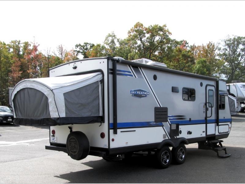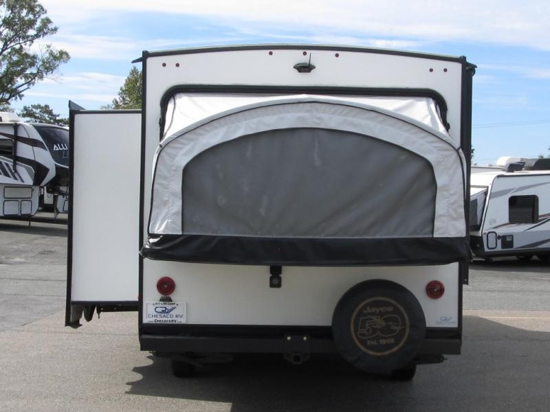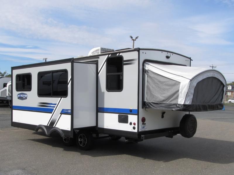 When you choose a Jay Feather expandable you can rest assured that you have chosen quality construction with features such as an aerodynamic, rounded front profile with front diamond plate plus there are vacuum-bonded, laminated bed platforms with reverse-cambered support of 1,000-lb. capacity, plus water-repellent, scratch-resistant Jayco DuraTek vinyl tent material with zipper windows. Inside you will find full kitchen amenities, LED lighting throughout, and ball-bearing drawer glides with 75-lb. capacity. The mandatory Customer Value Package includes features such as American-made nitro-filled Goodyear radial tires with self-adjusting brakes, a power awning with LED lights, an outside shower, plus AM/FM/CD/DVD/Bluetooth stereo and more! For your next camping trip, come choose a Jay Feather expandable!