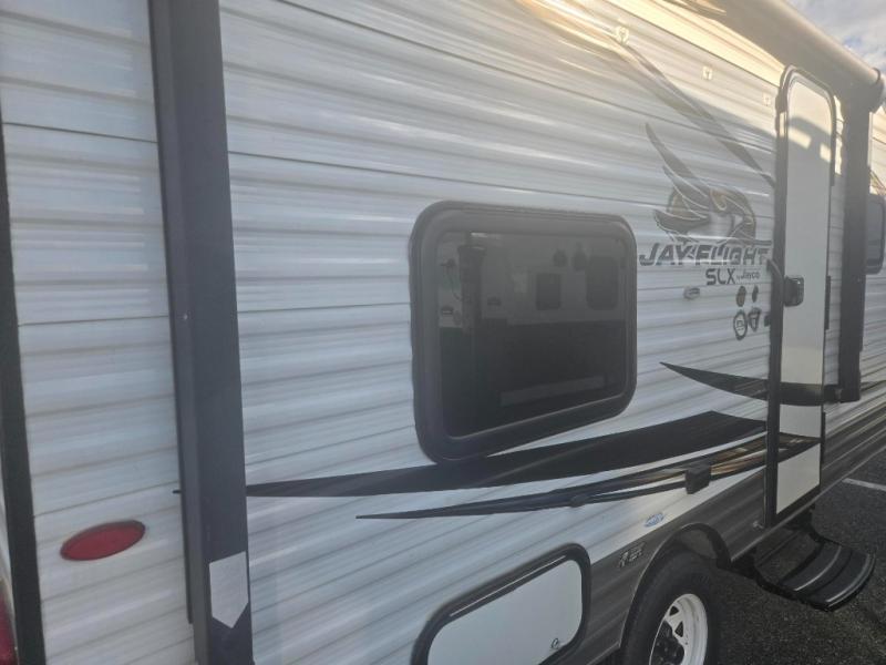 With any Jay Flight SLX 7 travel trailer your vacationing couldn't be simpler. These units provide you with all of the comforts needed along with complete reliability on the road. Jayco's industry-leading 2-year limited warranty will provide you with peace of mind regarding your purchase. You will appreciate the seamless Magnum Truss roof system and American-made Goodyear tires, as well as keyed-alike entry and baggage doors for ease of use so you only need to keep track of one key! On the inside, you will love the chocolate Maple cabinet doors, LED lighting throughout, plus comfortable sleeping accommodations with a 4" thick mattress or a queen Simmons mattress in select models to ensure you get a great night's rest every night! And, for your temperature control comfort inside, there is a wall-mount 8,000 BTU AC unit so you can stay cool even on the hottest summer day! What are you waiting for, come select your favorite Jay Flight SLX 7 model today!