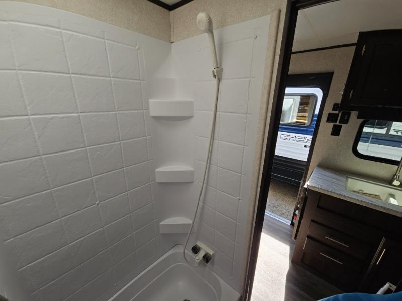 Just imagine sleeping and cooking inside a travel trailer while camping on your next trip. This Jay Flight SLX 8 212QB provides sleeping space for four, plus full kitchen and bath amenities. When you draw the privacy curtains, you will experience a semi-private front bedroom that offers a queen size Simmons mattress with wardrobes on either side and a shelf above to keep your items neat and tidy. You can get cleaned up in the tub/shower in the full bath with a bathroom skylight to let in more natural lighting. It's time to throw away the tent and make an upgrade to this unit today!