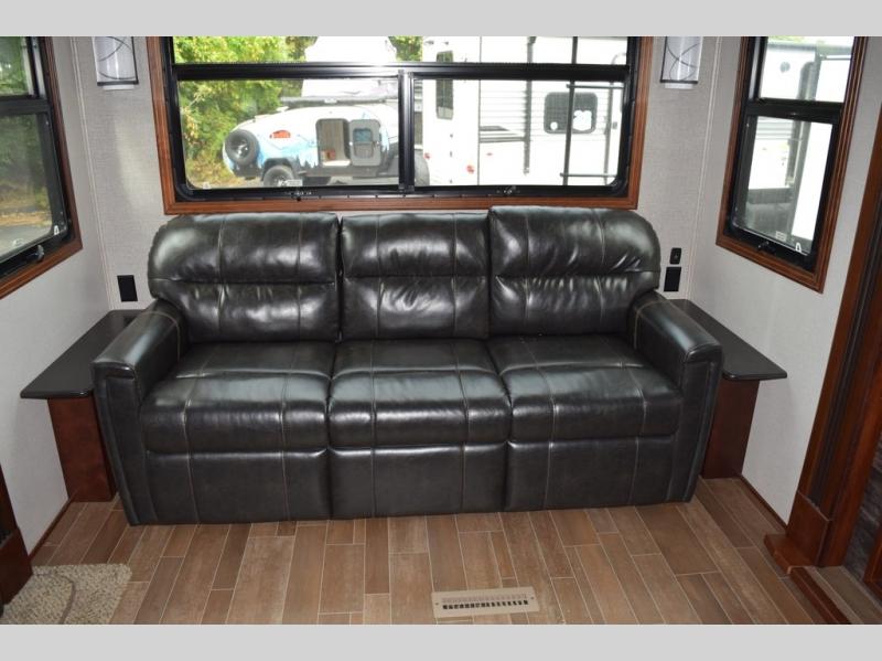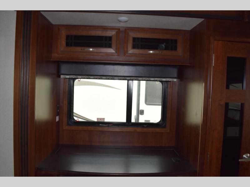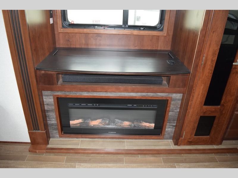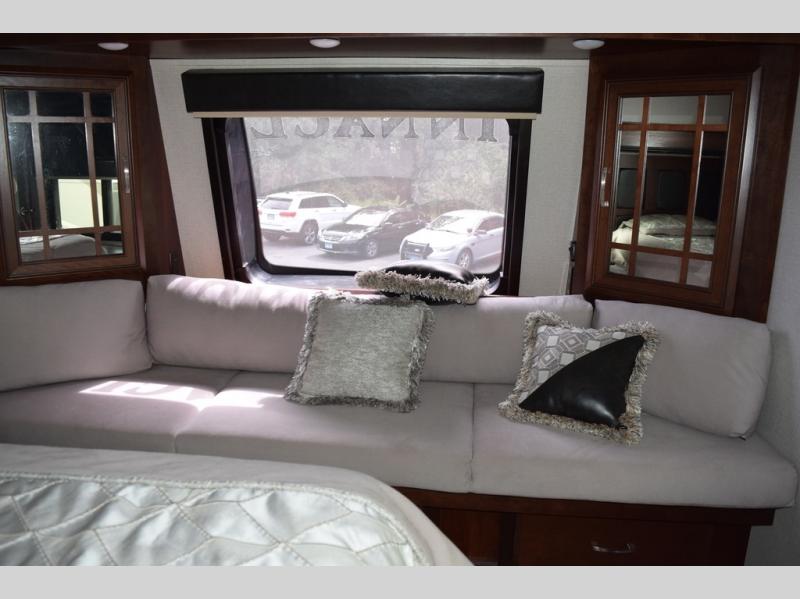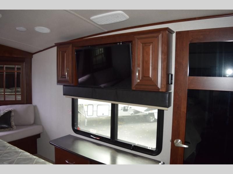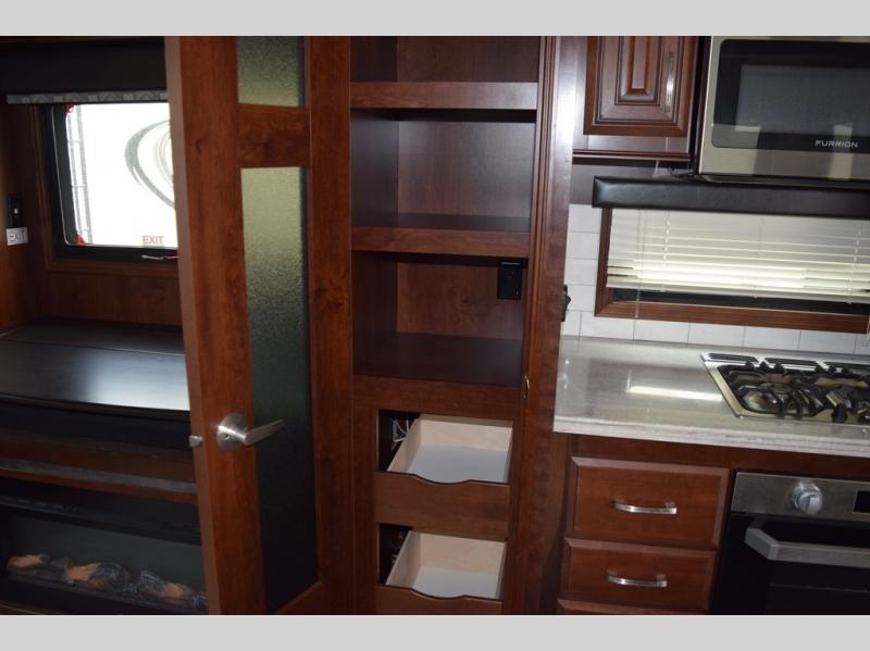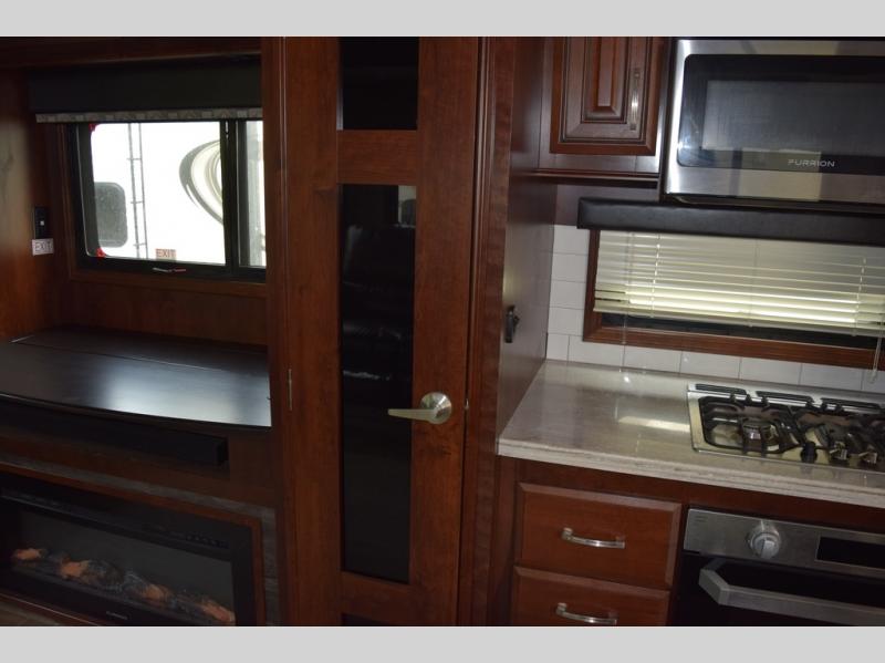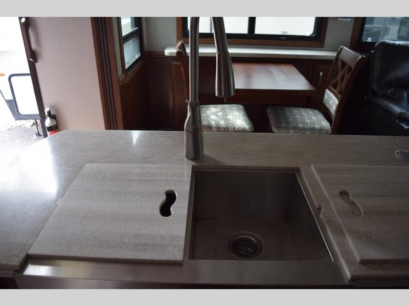 Hike the trails and explore the great outdoors with this stunning and grand Pinnacle fifth wheel. You and your family will love every trip you take in this model because it delivers everything you need for an upgraded camping experience. The private master suite with its picturesque window seat, king-size bed, and private bathroom entrance is an absolute dream for any traveler, and the full kitchen with its three-burner range top, pantry, and hutch will make every meal-time preparation run smoothly. You will even be able to enjoy a relaxing evening together as a family in the central living area as you lounge comfortably on the tri-fold sofa bed with ottoman and watch your favorite programs on the retractable TV.