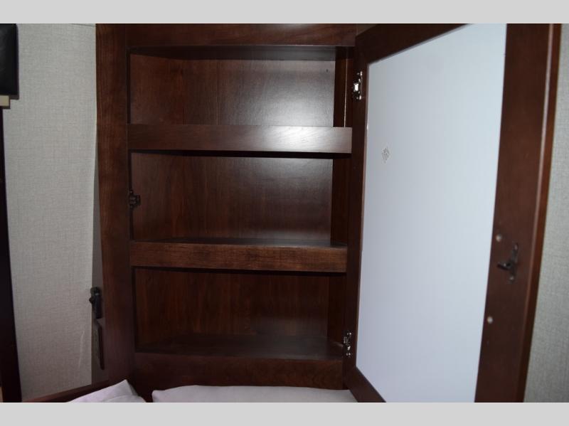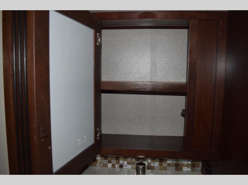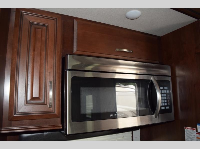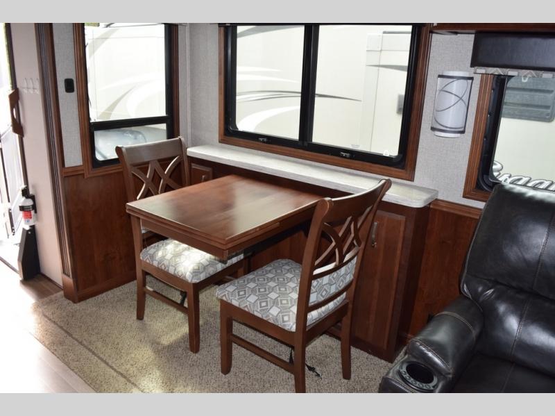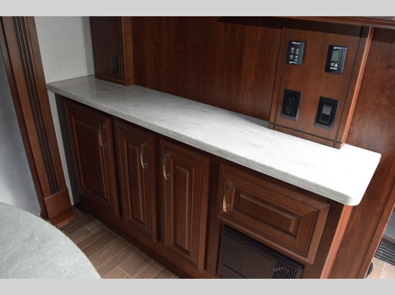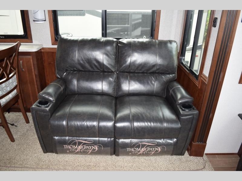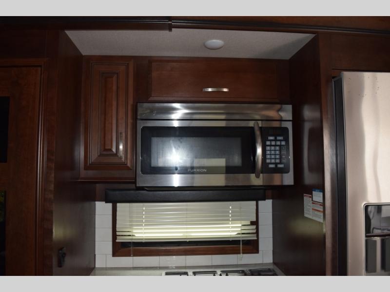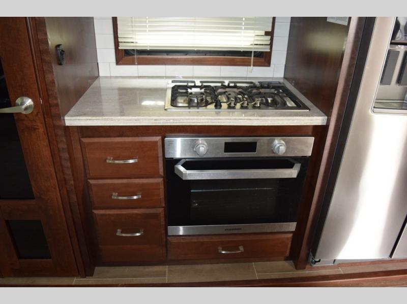 Hike the trails and explore the great outdoors with this stunning and grand Pinnacle fifth wheel. You and your family will love every trip you take in this model because it delivers everything you need for an upgraded camping experience. The private master suite with its picturesque window seat, king-size bed, and private bathroom entrance is an absolute dream for any traveler, and the full kitchen with its three-burner range top, pantry, and hutch will make every meal-time preparation run smoothly. You will even be able to enjoy a relaxing evening together as a family in the central living area as you lounge comfortably on the tri-fold sofa bed with ottoman and watch your favorite programs on the retractable TV.