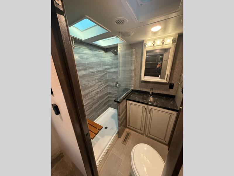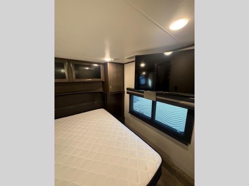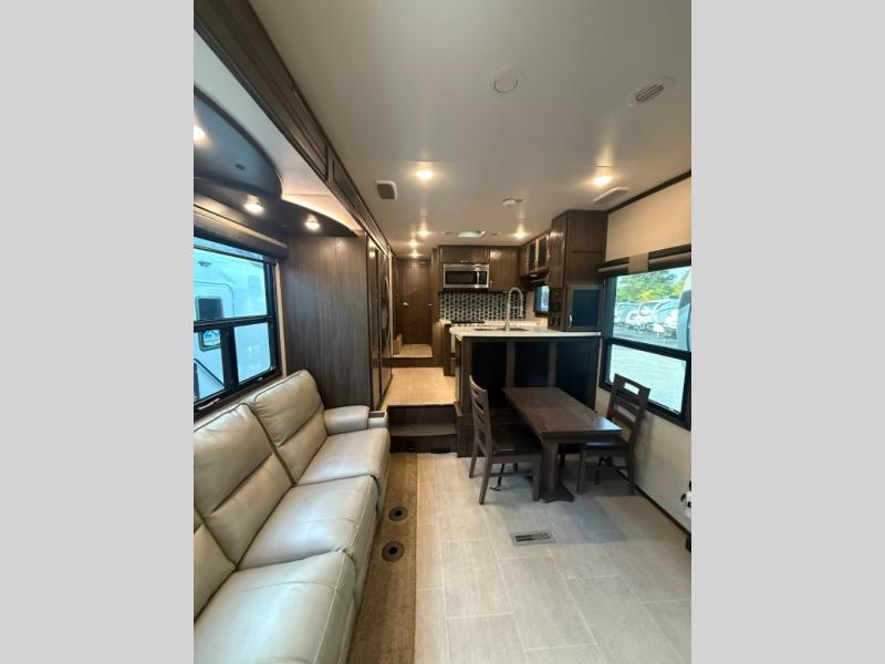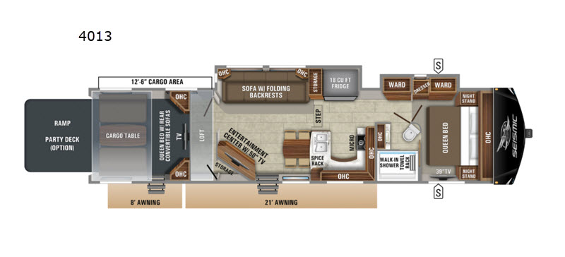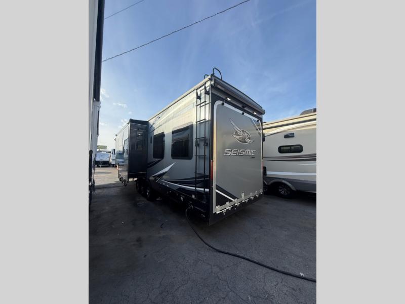 This Seismic toy hauler is an RV gem! With all of the comforts of home mixed in with exceptional camping features, you will have a truly unique and fun experience every time. The private master suite will be ultra relaxing at the end of each outdoor adventure, and you will look forward to eating a hot meal that has been prepared on the three-burner range top. Since this unit also comes with an 18 cubic foot refrigerator, there will be no shortage of leftovers the next day, and the queen-size electric bunk and convertible sofas in the garage will also give you plenty of room to sleep nine people during each trip.