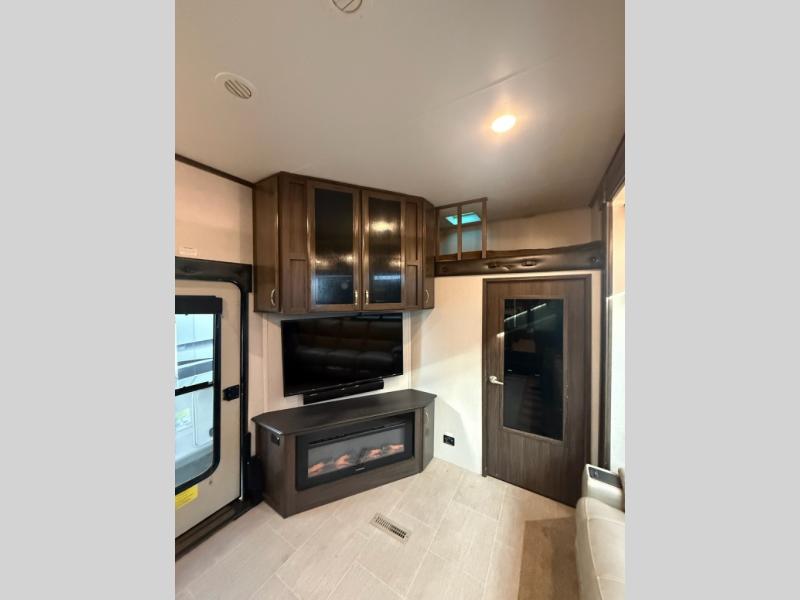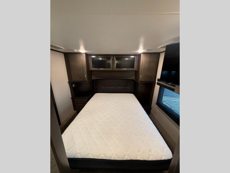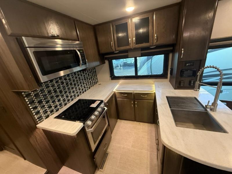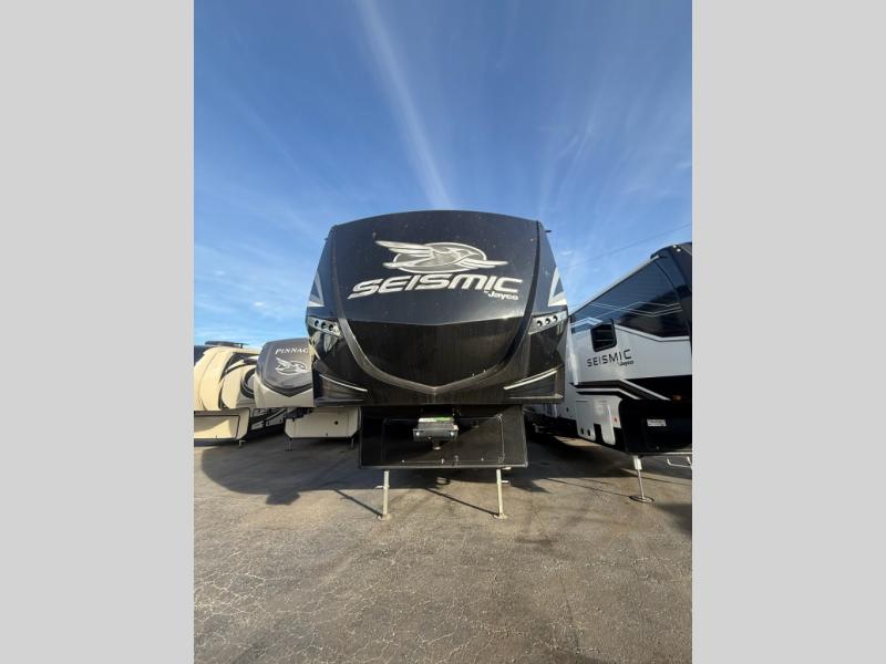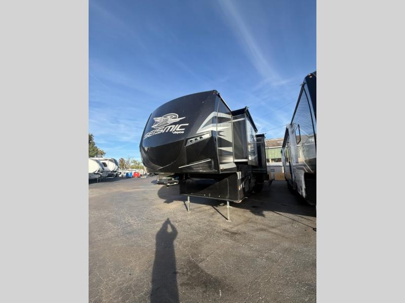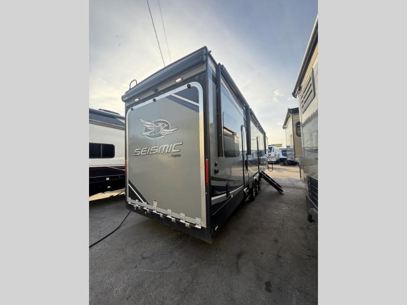 Shake things up and make a statement with a Jayco Seismic toy hauler fifth wheel! Each unit features a Stor-Galore heated and insulated basement storage so you can bring all your gear along with you, and two LED high-intensity, flush-mounted ramp lights, making it easier than ever to load up your toys. It will also be easy to enjoy your time spent outdoors because of the two electric awnings with LED lights that will protect you from intense rays of sun or scattered rain drops. Inside, you'll enjoy whole-house LED lighting, an electric fireplace, genuine stone and polished glass backsplash, and a Jayco-exclusive residential Simmons mattress, plus so much more!