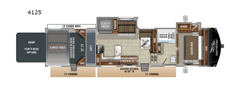 You will love every minute that you spend with this Seismic toy hauler! Whether you're sitting at the L-shaped dinette waiting for dinner to be prepared on the three-burner range top, or you're lounging on the convertible sofas as you watch a movie on the 32" LED TV in the garage, you will thoroughly enjoy all of the modern comforts and conveniences that this unit has to offer.