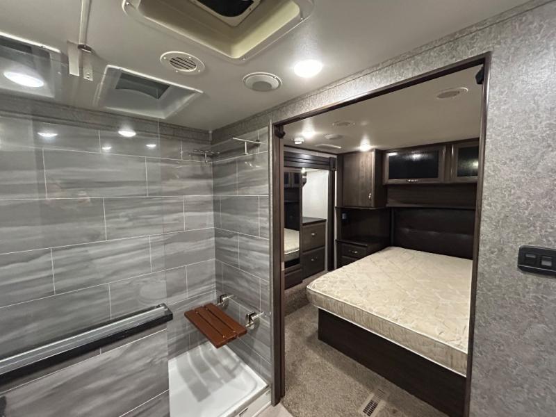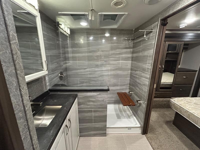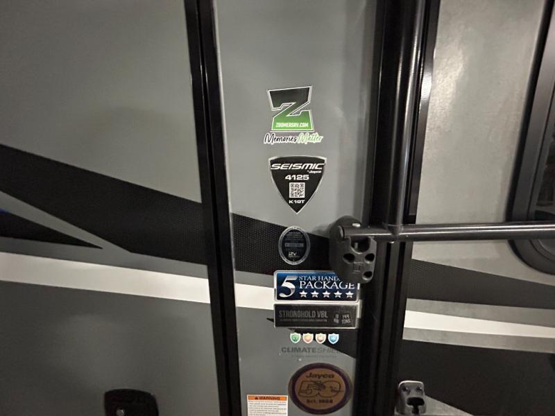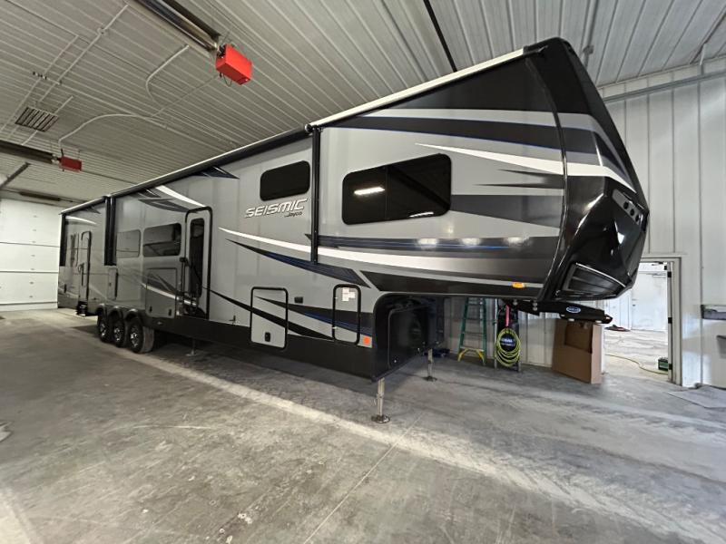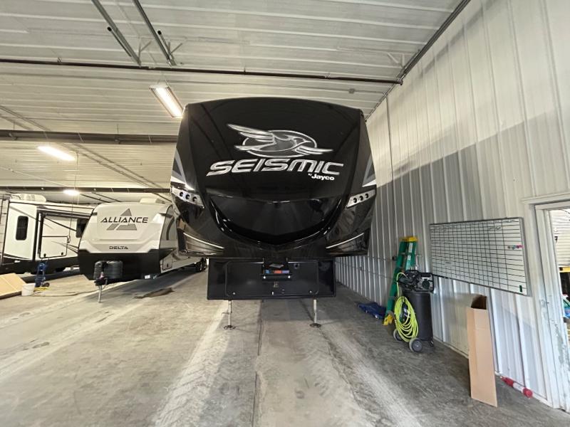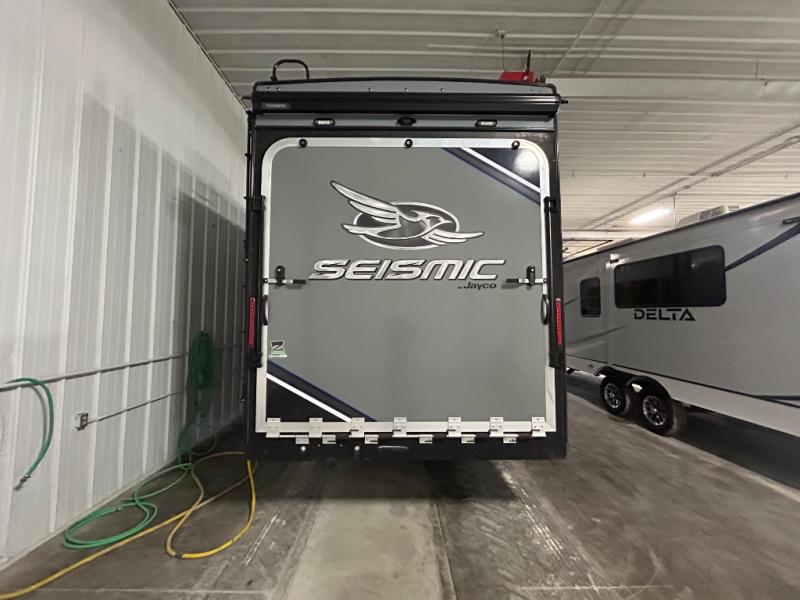 Shake things up and make a statement with a Jayco Seismic toy hauler fifth wheel! Each unit features a Stor-Galore heated and insulated basement storage so you can bring all your gear along with you, and two LED high-intensity, flush-mounted ramp lights, making it easier than ever to load up your toys. It will also be easy to enjoy your time spent outdoors because of the two electric awnings with LED lights that will protect you from intense rays of sun or scattered rain drops. Inside, you'll enjoy whole-house LED lighting, an electric fireplace, genuine stone and polished glass backsplash, and a Jayco-exclusive residential Simmons mattress, plus so much more!