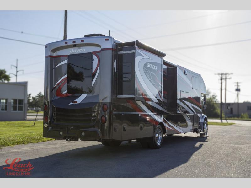 With a Jayco Seneca motorhome, you will not only enjoy each vacation destination, but you will also enjoy the ride getting there because each Seneca includes enough luxury for the long haul with features like the JRide Premium which is a driving system with a powerful blend of precise handling and renowned stability that all rests upon the Freightliner S2RV chassis and Cummins ISB 6.7L, 360 HP diesel engine. The high-gloss, fiberglass exterior with its deluxe full-body paint and diamond shield are what first attract you to this sleek RV, and the touchpad locking system with keyless entry makes it easy to access the interior whenever you need. You may find yourself spending all of your free time outdoors because of the exterior entertainment center that comes with an AM/FM/CD/DVD player and a 39" LED TV that will allow you to watch a movie in the cool night air underneath the stars, and the outdoor shower will come in handy when you need to rinse off any dirt that you don't want to bring inside.