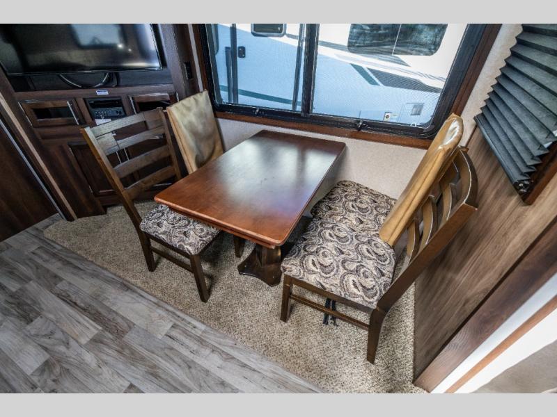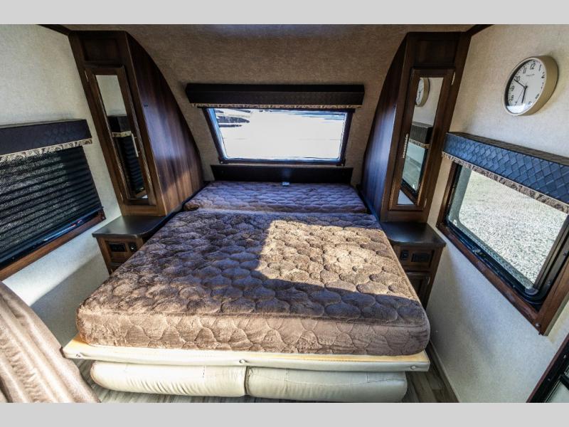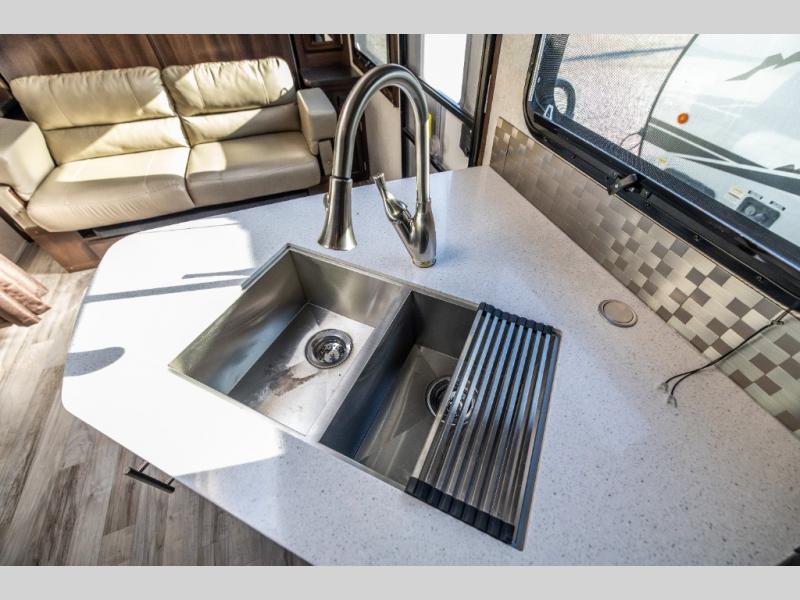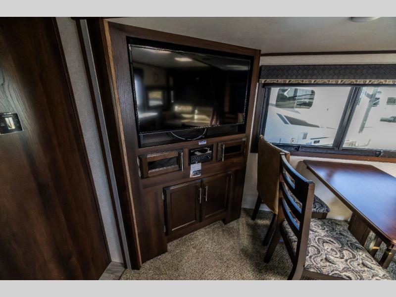 Traveling in this White Hawk travel trailer is like traveling in the lap of luxury. With the addition of the Murphy bed, you can decide whether or not you want the front of the trailer to be used as extra seating for the living area or as a semi-private bedroom. The semi-private bunks give you the space that you need in this model to sleep seven people comfortably. If you get tired of spending every day cooking indoors, then you can take your preparations outside to prepare dinner in the outdoor kitchen, and the bathroom skylight allows some of that outdoor sunshine to brighten up the 34" radius shower.